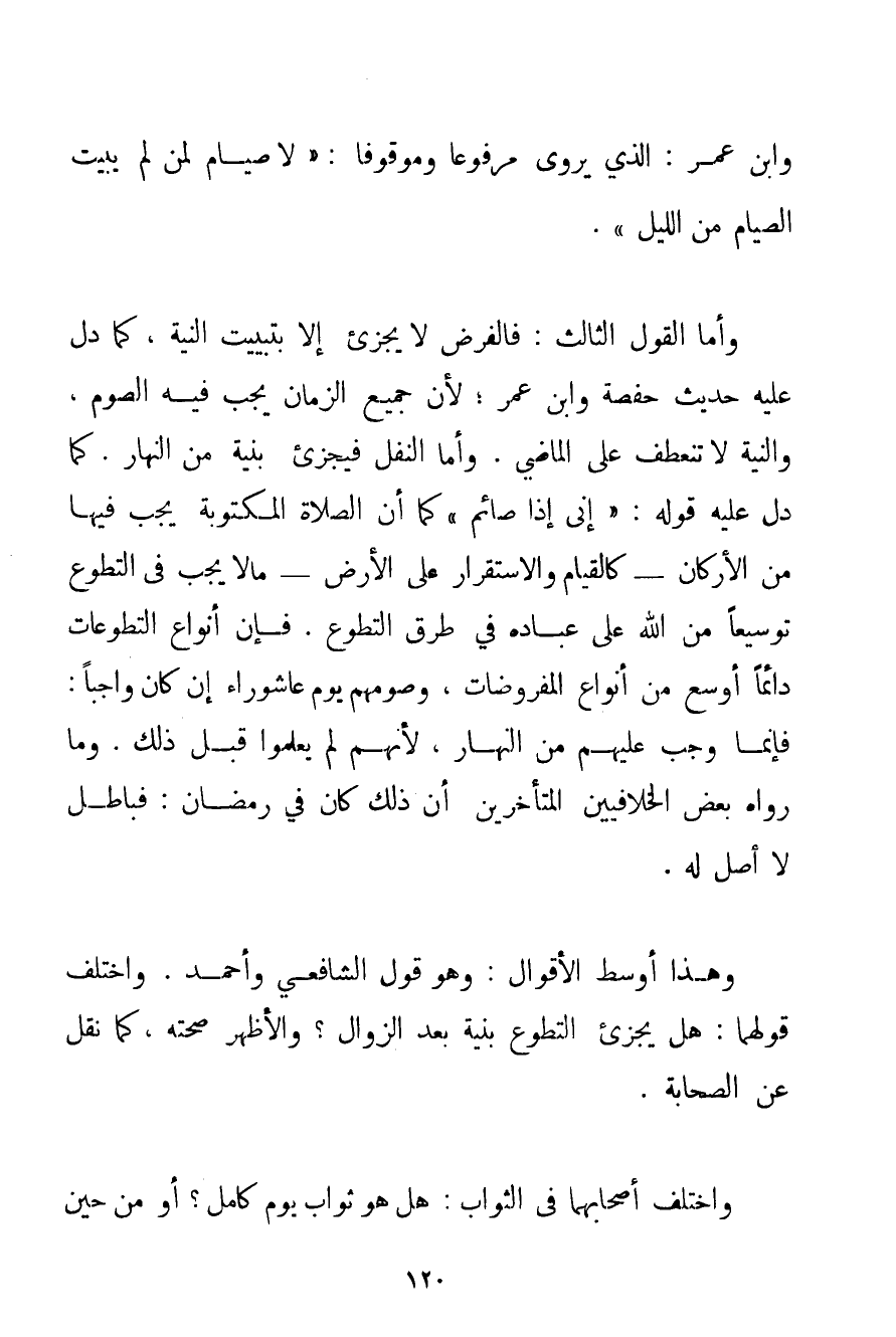 وَابْنِ عُمَرَ: الَّذِي يُرْوَى مَرْفُوعًا وَمَوْقُوفًا: {لَا صِيَامَ لِمَنْ لَمْ يُبَيِّتْ الصِّيَامَ مِنْ اللَّيْلِ} . وَأَمَّا الْقَوْلُ الثَّالِثُ: فَالْفَرْضُ لَا يُجْزِئُ إلَّا بِتَبْيِيتِ النِّيَّةِ كَمَا دَلَّ عَلَيْهِ حَدِيثُ حَفْصَةَ وَابْنِ عُمَرَ؛ لِأَنَّ جَمِيعَ الزَّمَانِ يَجِبُ فِيهِ الصَّوْمُ وَالنِّيَّةُ لَا تَنْعَطِفُ عَلَى الْمَاضِي. وَأَمَّا النَّفْلُ فَيُجْزِئُ بِنِيَّةِ مِنْ النَّهَارِ. كَمَا دَلَّ عَلَيْهِ قَوْلُهُ: {إنِّي إذًا صَائِمٌ} كَمَا أَنَّ الصَّلَاةَ الْمَكْتُوبَةَ يَجِبُ فِيهَا مِنْ الْأَرْكَانِ - كَالْقِيَامِ وَالِاسْتِقْرَارِ عَلَى الْأَرْضِ - مَا لَا يَجِبُ فِي التَّطَوُّعِ تَوْسِيعًا مِنْ اللَّهِ عَلَى عِبَادِهِ فِي طُرُقِ التَّطَوُّعِ. فَإِنَّ أَنْوَاعَ التَّطَوُّعَاتِ دَائِمًا أَوْسَعُ مِنْ أَنْوَاعِ الْمَفْرُوضَاتِ وَصَوْمُهُمْ يَوْمَ عَاشُورَاءَ إنْ كَانَ وَاجِبًا: فَإِنَّمَا وَجَبَ عَلَيْهِمْ مِنْ النَّهَارِ لِأَنَّهُمْ لَمْ يَعْلَمُوا قَبْلَ ذَلِكَ. وَمَا رَوَاهُ بَعْضُ الخلافيين الْمُتَأَخِّرِينَ أَنَّ ذَلِكَ كَانَ فِي رَمَضَانَ: فَبَاطِلٌ لَا أَصْلَ لَهُ. وَهَذَا أَوْسَطُ الْأَقْوَالِ: وَهُوَ قَوْلُ الشَّافِعِيِّ وَأَحْمَد. وَاخْتَلَفَ قَوْلُهُمَا: هَلْ يُجْزِئُ التَّطَوُّعُ بِنِيَّةٍ بَعْدَ الزَّوَالِ؟ وَالْأَظْهَرُ صِحَّتُهُ كَمَا نُقِلَ عَنْ الصَّحَابَةِ. وَاخْتَلَفَ أَصْحَابُهُمَا فِي الثَّوَابِ: هَلْ هُوَ ثَوَابُ يَوْمٍ كَامِلٍ؟ أَوْ مِنْ حِينِ