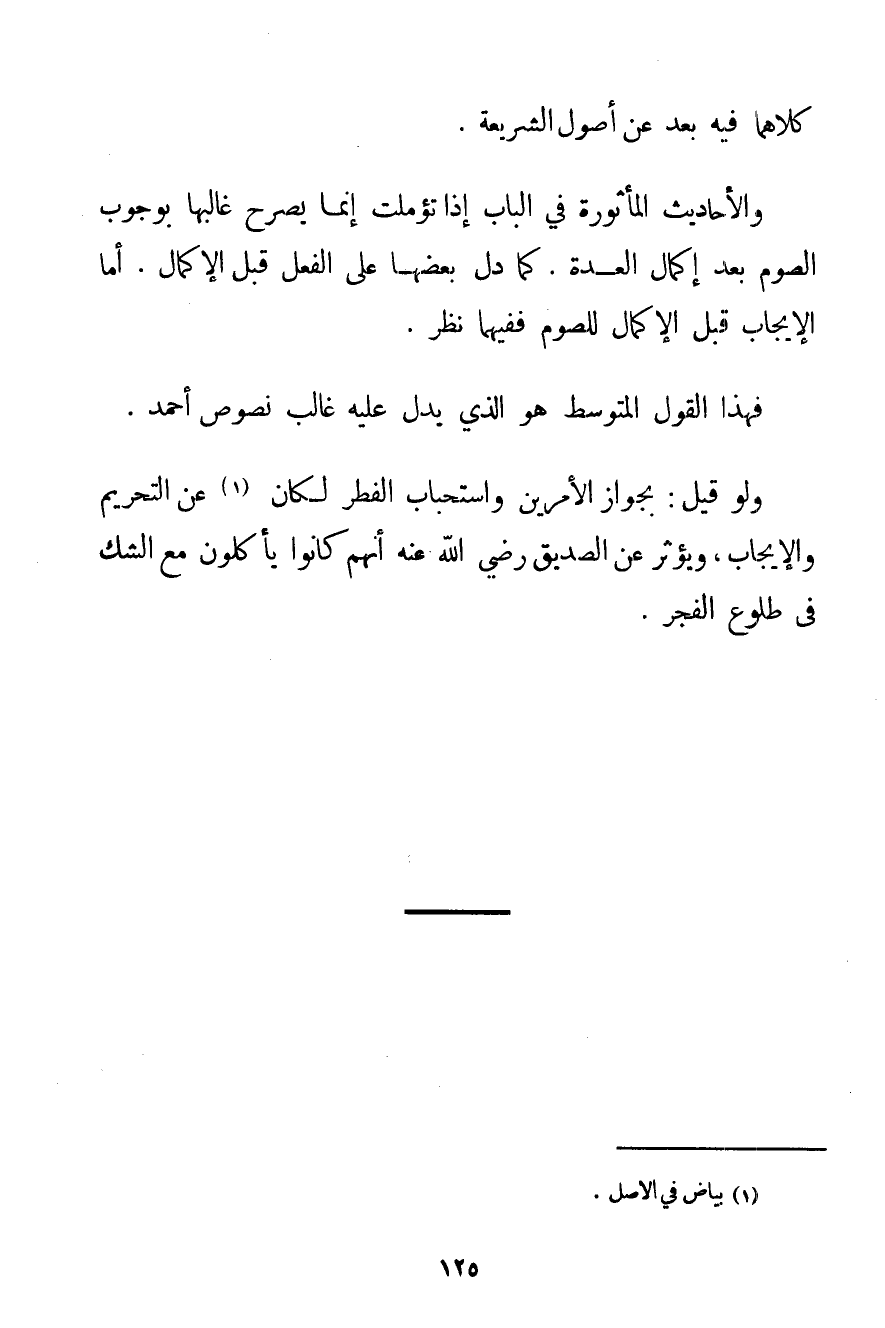 كِلَاهُمَا فِيهِ بُعْدٌ عَنْ أُصُولِ الشَّرِيعَةِ. وَالْأَحَادِيثُ الْمَأْثُورَةُ فِي الْبَابِ إذَا تُؤُمِّلَتْ إنَّمَا يُصَرِّحُ غَالِبُهَا بِوُجُوبِ الصَّوْمِ بَعْدَ إكْمَالِ الْعِدَّةِ. كَمَا دَلَّ بَعْضُهَا عَلَى الْفِعْلِ قَبْلَ الْإِكْمَالِ. أَمَّا الْإِيجَابُ قَبْلَ الْإِكْمَالِ لِلصَّوْمِ فَفِيهِمَا نَظَرٌ. فَهَذَا الْقَوْلُ الْمُتَوَسِّطُ هُوَ الَّذِي يَدُلُّ عَلَيْهِ غَالِبُ نُصُوصِ أَحْمَد. وَلَوْ قِيلَ: بِجَوَازِ الْأَمْرَيْنِ وَاسْتِحْبَابِ الْفِطْرِ لَكَانَ (1) عَنْ التَّحْرِيمِ وَالْإِيجَابِ وَيُؤْثَرُ عَنْ الصِّدِّيقُ رَضِيَ اللَّهُ عَنْهُ أَنَّهُمْ كَانُوا يَأْكُلُونَ مَعَ الشَّكِّ فِي طُلُوعِ الْفَجْرِ.