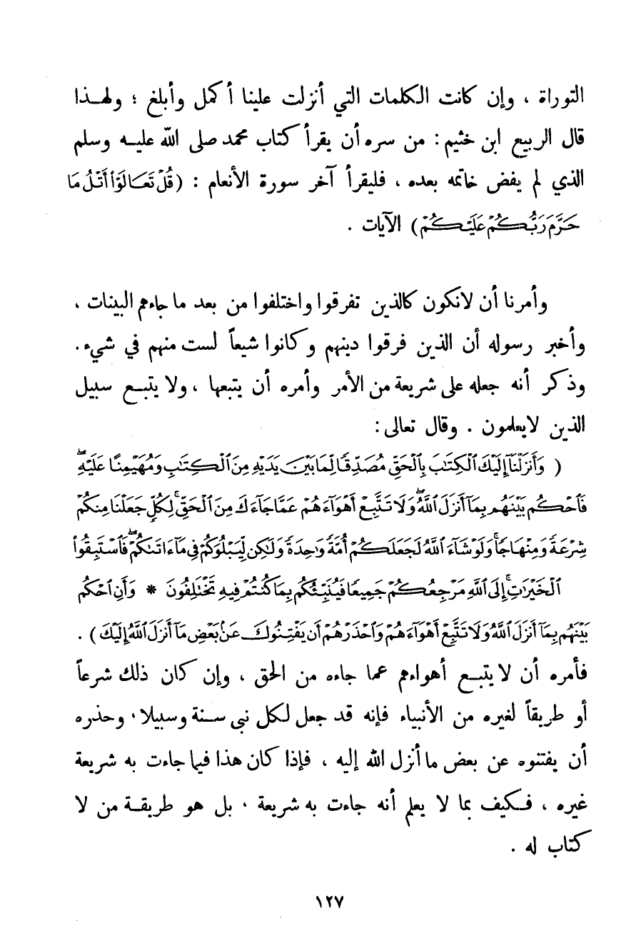 التَّوْرَاةِ وَإِنْ كَانَتْ الْكَلِمَاتُ الَّتِي أُنْزِلَتْ عَلَيْنَا أَكْمَلَ وَأَبْلَغَ؛ وَلِهَذَا قَالَ الرَّبِيعُ بْنُ خثيم: مَنْ سَرَّهُ أَنْ يَقْرَأَ كِتَابَ مُحَمَّدٍ صَلَّى اللَّهُ عَلَيْهِ وَسَلَّمَ الَّذِي لَمْ يُفَضَّ خَاتَمُهُ بَعْدَهُ فَلْيَقْرَأْ آخِرَ سُورَةِ الْأَنْعَامِ: {قُلْ تَعَالَوْا أَتْلُ مَا حَرَّمَ رَبُّكُمْ عَلَيْكُمْ} الْآيَاتِ. وَأَمَرَنَا أَنْ لَا نَكُونَ كَاَلَّذِينَ تَفَرَّقُوا وَاخْتَلَفُوا مِنْ بَعْدِ مَا جَاءَهُمْ الْبَيِّنَاتُ وَأَخْبَرَ رَسُولُهُ أَنَّ الَّذِينَ فَرَّقُوا دِينَهُمْ وَكَانُوا شِيَعًا لَسْت مِنْهُمْ فِي شَيْءٍ. وَذَكَرَ أَنَّهُ جَعَلَهُ عَلَى شَرِيعَةٍ مِنْ الْأَمْرِ وَأَمَرَهُ أَنْ يَتَّبِعَهَا وَلَا يَتَّبِعَ سَبِيلَ الَّذِينَ لَا يَعْلَمُونَ. وَقَالَ تَعَالَى: {وَأَنْزَلْنَا إلَيْكَ الْكِتَابَ بِالْحَقِّ مُصَدِّقًا لِمَا بَيْنَ يَدَيْهِ مِنَ الْكِتَابِ وَمُهَيْمِنًا عَلَيْهِ فَاحْكُمْ بَيْنَهُمْ بِمَا أَنْزَلَ اللَّهُ وَلَا تَتَّبِعْ أَهْوَاءَهُمْ عَمَّا جَاءَكَ مِنَ الْحَقِّ لِكُلٍّ جَعَلْنَا مِنْكُمْ شِرْعَةً وَمِنْهَاجًا} {وَلَوْ شَاءَ اللَّهُ لَجَعَلَكُمْ أُمَّةً وَاحِدَةً وَلَكِنْ لِيَبْلُوَكُمْ فِي مَا آتَاكُمْ فَاسْتَبِقُوا الْخَيْرَاتِ إلَى اللَّهِ مَرْجِعُكُمْ جَمِيعًا فَيُنَبِّئُكُمْ بِمَا كُنْتُمْ فِيهِ تَخْتَلِفُونَ} {وَأَنِ احْكُمْ بَيْنَهُمْ بِمَا أَنْزَلَ اللَّهُ وَلَا تَتَّبِعْ أَهْوَاءَهُمْ وَاحْذَرْهُمْ أَنْ يَفْتِنُوكَ عَنْ بَعْضِ مَا أَنْزَلَ اللَّهُ إلَيْكَ} . فَأَمَرَهُ أَنْ لَا يَتَّبِعَ أَهْوَاءَهُمْ عَمَّا جَاءَهُ مِنْ الْحَقِّ وَإِنْ كَانَ ذَلِكَ شَرْعًا أَوْ طَرِيقًا لِغَيْرِهِ مِنْ الْأَنْبِيَاءِ فَإِنَّهُ قَدْ جَعَلَ لِكُلِّ نَبِيٍّ سُنَّةً وَسَبِيلًا وَحَذَّرَهُ أَنْ يَفْتِنُوهُ عَنْ بَعْضِ مَا أَنْزَلَ اللَّهُ إلَيْهِ فَإِذَا كَانَ هَذَا فِيمَا جَاءَتْ بِهِ شَرِيعَةُ غَيْرِهِ فَكَيْفَ بِمَا لَا يُعْلَمُ أَنَّهُ جَاءَتْ بِهِ شَرِيعَةٌ بَلْ هُوَ طَرِيقَةُ مَنْ لَا كِتَابَ لَهُ.