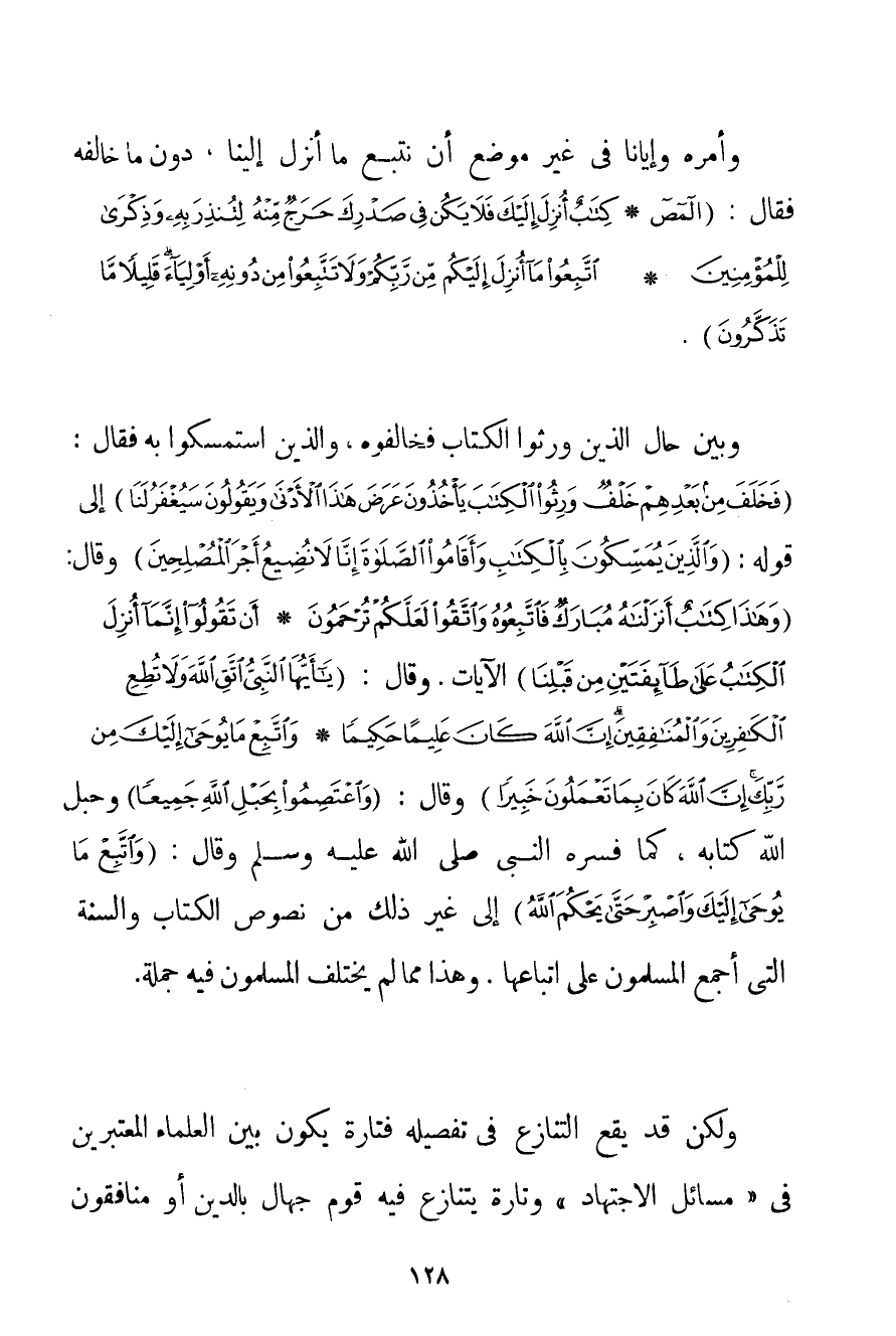 وَأَمَرَهُ وَإِيَّانَا فِي غَيْرِ مَوْضِعٍ أَنْ نَتَّبِعَ مَا أُنْزِلَ إلَيْنَا دُونَ مَا خَالَفَهُ فَقَالَ: {المص} {كِتَابٌ أُنْزِلَ إلَيْكَ فَلَا يَكُنْ فِي صَدْرِكَ حَرَجٌ مِنْهُ لِتُنْذِرَ بِهِ وَذِكْرَى لِلْمُؤْمِنِينَ} {اتَّبِعُوا مَا أُنْزِلَ إلَيْكُمْ مِنْ رَبِّكُمْ وَلَا تَتَّبِعُوا مِنْ دُونِهِ أَوْلِيَاءَ قَلِيلًا مَا تَذَكَّرُونَ} . وَبَيَّنَ حَالَ الَّذِينَ وَرِثُوا الْكِتَابَ فَخَالَفُوهُ وَاَلَّذِينَ اسْتَمْسَكُوا بِهِ فَقَالَ: {فَخَلَفَ مِنْ بَعْدِهِمْ خَلْفٌ وَرِثُوا الْكِتَابَ يَأْخُذُونَ عَرَضَ هَذَا الْأَدْنَى وَيَقُولُونَ سَيُغْفَرُ لَنَا} إلَى قَوْلِهِ: {وَالَّذِينَ يُمَسِّكُونَ بِالْكِتَابِ وَأَقَامُوا الصَّلَاةَ إنَّا لَا نُضِيعُ أَجْرَ الْمُصْلِحِينَ} وَقَالَ: {وَهَذَا كِتَابٌ أَنْزَلْنَاهُ مُبَارَكٌ فَاتَّبِعُوهُ وَاتَّقُوا لَعَلَّكُمْ تُرْحَمُونَ} {أَنْ تَقُولُوا إنَّمَا أُنْزِلَ الْكِتَابُ عَلَى طَائِفَتَيْنِ مِنْ قَبْلِنَا} الْآيَاتِ. وَقَالَ: {يَا أَيُّهَا النَّبِيُّ اتَّقِ اللَّهَ وَلَا تُطِعِ الْكَافِرِينَ وَالْمُنَافِقِينَ إنَّ اللَّهَ كَانَ عَلِيمًا حَكِيمًا} {وَاتَّبِعْ مَا يُوحَى إلَيْكَ مِنْ رَبِّكَ إنَّ اللَّهَ كَانَ بِمَا تَعْمَلُونَ خَبِيرًا} وَقَالَ: {وَاعْتَصِمُوا بِحَبْلِ اللَّهِ جَمِيعًا} وَحَبْلُ اللَّهِ كِتَابُهُ كَمَا فَسَّرَهُ النَّبِيُّ صَلَّى اللَّهُ عَلَيْهِ وَسَلَّمَ وَقَالَ: {وَاتَّبِعْ مَا يُوحَى إلَيْكَ وَاصْبِرْ حَتَّى يَحْكُمَ اللَّهُ} إلَى غَيْرِ ذَلِكَ مِنْ نُصُوصِ الْكِتَابِ وَالسُّنَّةِ الَّتِي أَجْمَعَ الْمُسْلِمُونَ عَلَى اتِّبَاعِهَا. وَهَذَا مِمَّا لَمْ يَخْتَلِفْ الْمُسْلِمُونَ فِيهِ جُمْلَةً. وَلَكِنْ قَدْ يَقَعُ التَّنَازُعُ فِي تَفْصِيلِهِ فَتَارَةً يَكُونُ بَيْنَ الْعُلَمَاءِ الْمُعْتَبَرِينَ فِي " مَسَائِلِ الِاجْتِهَادِ " وَتَارَةً يَتَنَازَعُ فِيهِ قَوْمٌ جُهَّالٌ بِالدِّينِ أَوْ مُنَافِقُونَ
