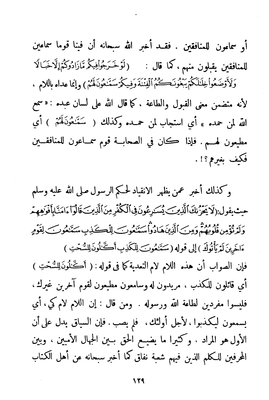 أَوْ سَمَّاعُونَ لِلْمُنَافِقِينَ. فَقَدْ أَخْبَرَ اللَّهُ سُبْحَانَهُ أَنَّ فِينَا قَوْمًا سَمَّاعِينَ لِلْمُنَافِقِينَ يَقْبَلُونَ مِنْهُمْ كَمَا قَالَ: {لَوْ خَرَجُوا فِيكُمْ مَا زَادُوكُمْ إلَّا خَبَالًا وَلَأَوْضَعُوا خِلَالَكُمْ يَبْغُونَكُمُ الْفِتْنَةَ وَفِيكُمْ سَمَّاعُونَ لَهُمْ} وَإِنَّمَا عَدَّاهُ بِاللَّامِ لِأَنَّهُ مُتَضَمِّنٌ مَعْنَى الْقَبُولِ وَالطَّاعَةِ كَمَا قَالَ اللَّهُ عَلَى لِسَانِ عَبْدِهِ: " سَمِعَ اللَّهُ لِمَنْ حَمِدَهُ " أَيْ اسْتَجَابَ لِمَنْ حَمِدَهُ وَكَذَلِكَ {سَمَّاعُونَ لَهُمْ} أَيْ مُطِيعُونَ لَهُمْ. فَإِذَا كَانَ فِي الصَّحَابَةِ قَوْمٌ سَمَّاعُونَ لِلْمُنَافِقِينَ فَكَيْفَ بِغَيْرِهِمْ. وَكَذَلِكَ أَخْبَرَ عَمَّنْ يُظْهِرُ الِانْقِيَادَ لِحُكْمِ الرَّسُولِ صَلَّى اللَّهُ عَلَيْهِ وَسَلَّمَ حَيْثُ يَقُولُ: {لَا يَحْزُنْكَ الَّذِينَ يُسَارِعُونَ فِي الْكُفْرِ مِنَ الَّذِينَ قَالُوا آمَنَّا بِأَفْوَاهِهِمْ وَلَمْ تُؤْمِنْ قُلُوبُهُمْ وَمِنَ الَّذِينَ هَادُوا سَمَّاعُونَ لِلْكَذِبِ سَمَّاعُونَ لِقَوْمٍ آخَرِينَ لَمْ يَأْتُوكَ} إلَى قَوْلِهِ {سَمَّاعُونَ لِلْكَذِبِ أَكَّالُونَ لِلسُّحْتِ} فَإِنَّ الصَّوَابَ أَنَّ هَذِهِ اللَّامَ لَامُ التَّعْدِيَةِ كَمَا فِي قَوْلِهِ: {أَكَّالُونَ لِلسُّحْتِ} أَيْ قَائِلُونَ لِلْكَذِبِ مُرِيدُونَ لَهُ وَسَامِعُونَ مُطِيعُونَ لِقَوْمِ آخَرِينَ غَيْرِك فَلَيْسُوا مُفْرِدِينَ لِطَاعَةِ اللَّهِ وَرَسُولِهِ. وَمَنْ قَالَ: إنَّ اللَّامَ لَامُ كَيْ أَيْ يَسْمَعُونَ لِيَكْذِبُوا لِأَجْلِ أُولَئِكَ فَلَمْ يُصِبْ. فَإِنَّ السِّيَاقَ يَدُلُّ عَلَى أَنَّ الْأَوَّلَ هُوَ الْمُرَادُ وَكَثِيرًا مَا يَضِيعُ الْحَقُّ بَيْنَ الْجُهَّالِ الْأُمِّيِّينَ وَبَيْنَ الْمُحَرِّفِينَ لِلْكَلِمِ الَّذِينَ فِيهِمْ شُعْبَةُ نِفَاقٍ كَمَا أَخْبَرَ سُبْحَانَهُ عَنْ أَهْلِ الْكِتَابِ