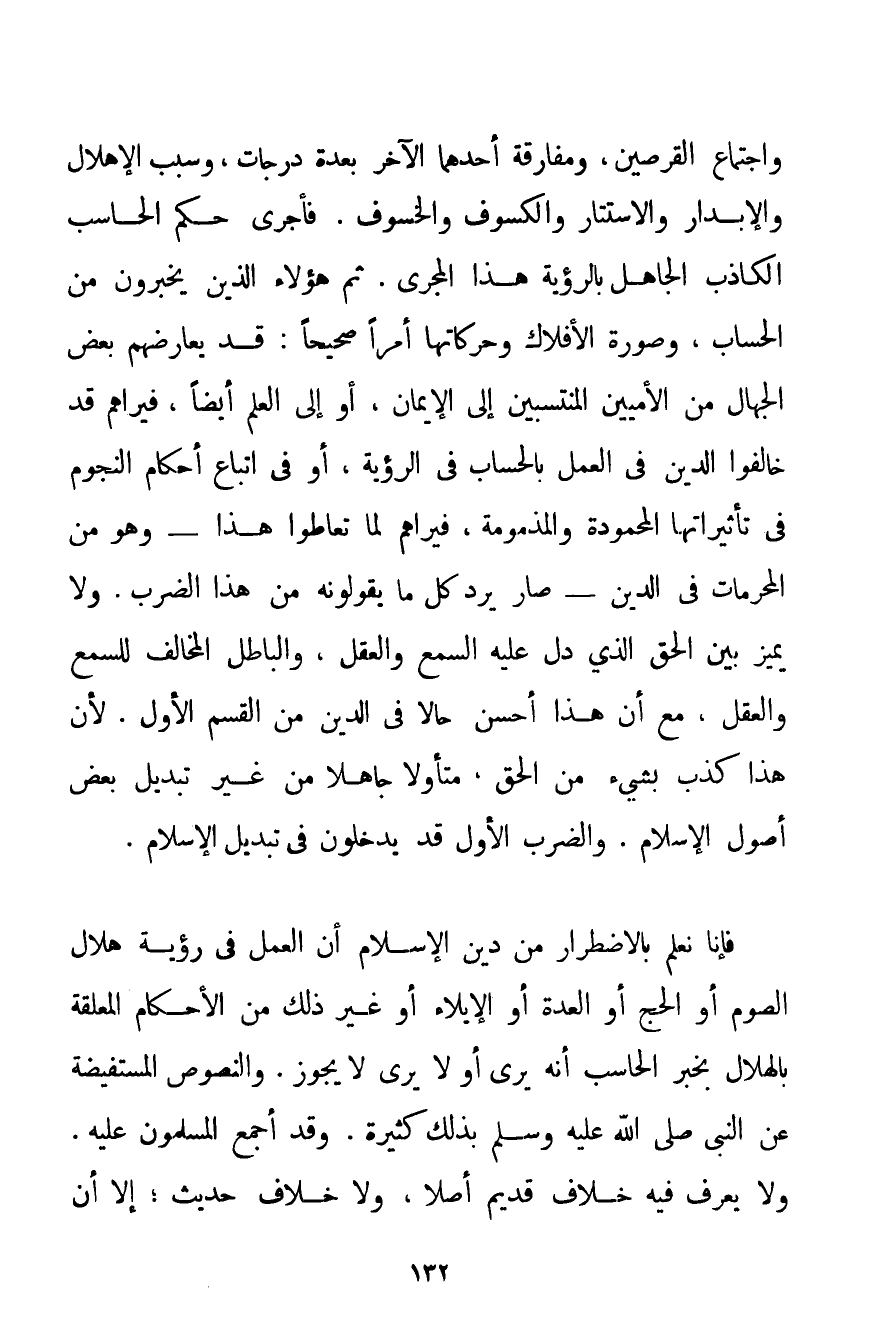 وَاجْتِمَاعِ الْقُرْصَيْنِ وَمُفَارَقَةِ أَحَدِهِمَا الْآخَرَ بِعِدَّةِ دَرَجَاتٍ وَسَبَبِ الْإِهْلَالِ وَالْإِبْدَارِ وَالِاسْتِتَارِ وَالْكُسُوفِ وَالْخُسُوفِ. فَأَجْرَى حُكْمَ الْحَاسِبِ الْكَاذِبِ الْجَاهِلِ بِالرُّؤْيَةِ هَذَا الْمَجْرَى. ثُمَّ هَؤُلَاءِ الَّذِينَ يُخْبِرُونَ مِنْ الْحِسَابِ وَصُورَةِ الْأَفْلَاكِ وَحَرَكَاتِهَا أَمْرًا صَحِيحًا: قَدْ يُعَارِضُهُمْ بَعْضُ الْجُهَّالِ مِنْ الْأُمِّيِّينَ الْمُنْتَسِبِينَ إلَى الْإِيمَانِ أَوْ إلَى الْعَدَمِ أَيْضًا فَيَرَاهُمْ قَدْ خَالَفُوا الدِّينَ فِي الْعَمَلِ بِالْحِسَابِ فِي الرُّؤْيَةِ أَوْ فِي اتِّبَاعِ أَحْكَامِ النُّجُومِ فِي تَأْثِيرَاتِهَا الْمَحْمُودَةِ وَالْمَذْمُومَةِ فَيَرَاهُمْ لَمَّا تَعَاطَوْا هَذَا - وَهُوَ مِنْ الْمُحَرَّمَاتِ فِي الدِّينِ - صَارَ يَرُدُّ كُلَّ مَا يَقُولُونَهُ مِنْ هَذَا الضَّرْبِ. وَلَا يُمَيِّزُ بَيْنَ الْحَقِّ الَّذِي دَلَّ عَلَيْهِ السَّمْعُ وَالْعَقْلُ وَالْبَاطِلِ الْمُخَالِفِ لِلسَّمْعِ وَالْعَقْلِ مَعَ أَنَّ هَذَا أَحْسَنُ حَالًا فِي الدِّينِ مِنْ الْقِسْمِ الْأَوَّلِ. لِأَنَّ هَذَا كَذَّبَ بِشَيْءِ مِنْ الْحَقِّ مُتَأَوِّلًا جَاهِلًا مِنْ غَيْرِ تَبْدِيلِ بَعْضِ أُصُولِ الْإِسْلَامِ. وَالضَّرْبُ الْأَوَّلُ قَدْ يَدْخُلُونَ فِي تَبْدِيلِ الْإِسْلَامِ. فَإِنَّا نَعْلَمُ بِالِاضْطِرَارِ مِنْ دِينِ الْإِسْلَامِ أَنَّ الْعَمَلَ فِي رُؤْيَةِ هِلَالِ الصَّوْمِ أَوْ الْحَجِّ أَوْ الْعِدَّةِ أَوْ الْإِيلَاءِ أَوْ غَيْرِ ذَلِكَ مِنْ الْأَحْكَامِ الْمُعَلَّقَةِ بِالْهِلَالِ بِخَبَرِ الْحَاسِبِ أَنَّهُ يُرَى أَوْ لَا يُرَى لَا يَجُوزُ. وَالنُّصُوصُ الْمُسْتَفِيضَةُ عَنْ النَّبِيِّ صَلَّى اللَّهُ عَلَيْهِ وَسَلَّمَ بِذَلِكَ كَثِيرَةٌ. وَقَدّ أَجْمَعَ الْمُسْلِمُونَ عَلَيْهِ. وَلَا يُعْرَفُ فِيهِ خِلَافٌ قَدِيمٌ أَصْلًا وَلَا خِلَافٌ حَدِيثٌ؛ إلَّا أَنَّ
