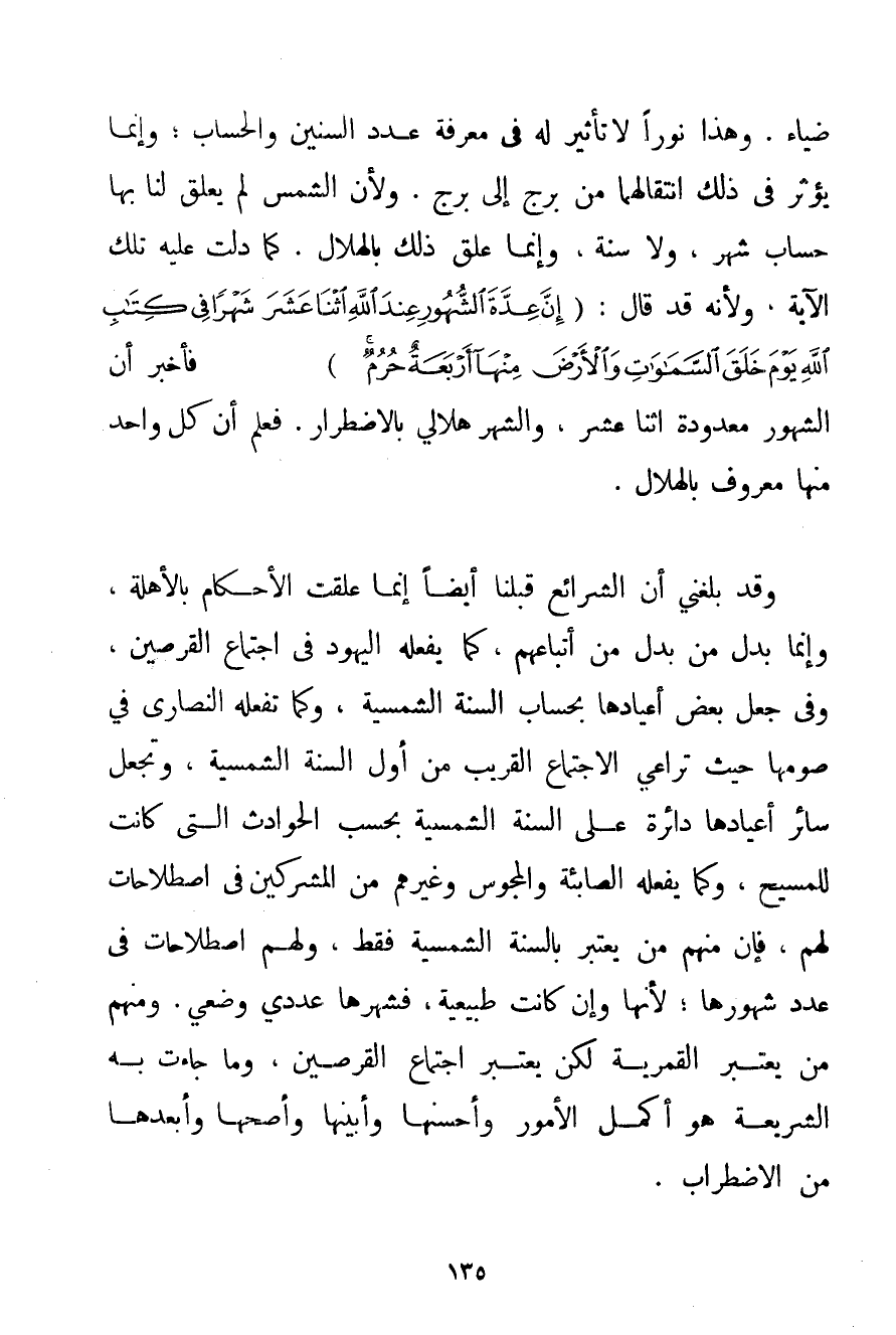 ضِيَاءً. وَهَذَا نُورًا لَا تَأْثِيرَ لَهُ فِي مَعْرِفَةِ عَدَدِ السِّنِينَ وَالْحِسَابِ؛ وَإِنَّمَا يُؤَثِّرُ فِي ذَلِكَ انْتِقَالُهَا مِنْ بُرْجٍ إلَى بُرْجٍ. وَلِأَنَّ الشَّمْسَ لَمْ يُعَلَّقْ لَنَا بِهَا حِسَابُ شَهْرٍ وَلَا سَنَةٍ وَإِنَّمَا عُلِّقَ ذَلِكَ بِالْهِلَالِ. كَمَا دَلَّتْ عَلَيْهِ تِلْكَ الْآيَةُ وَلِأَنَّهُ قَدْ قَالَ: {إنَّ عِدَّةَ الشُّهُورِ عِنْدَ اللَّهِ اثْنَا عَشَرَ شَهْرًا فِي كِتَابِ اللَّهِ يَوْمَ خَلَقَ السَّمَاوَاتِ وَالْأَرْضَ مِنْهَا أَرْبَعَةٌ حُرُمٌ} فَأَخْبَرَ أَنَّ الشُّهُورَ مَعْدُودَةٌ اثْنَا عَشَرَ وَالشَّهْرُ هِلَالِيٌّ بِالِاضْطِرَارِ. فَعُلِمَ أَنَّ كُلَّ وَاحِدٍ مِنْهَا مَعْرُوفٌ بِالْهِلَالِ. وَقَدْ بَلَغَنِي أَنَّ الشَّرَائِعَ قَبْلَنَا أَيْضًا إنَّمَا عَلَّقَتْ الْأَحْكَامَ بِالْأَهِلَّةِ وَإِنَّمَا بَدَّلَ مَنْ بَدَّلَ مِنْ أَتْبَاعِهِمْ كَمَا يَفْعَلُهُ الْيَهُود فِي اجْتِمَاعِ الْقُرْصَيْنِ وَفِي جَعْلِ بَعْضِ أَعْيَادِهَا بِحِسَابِ السَّنَةِ الشَّمْسِيَّةِ وَكَمَا تَفْعَلُهُ النَّصَارَى فِي صَوْمِهَا حَيْثُ تُرَاعِي الِاجْتِمَاعَ الْقَرِيبَ مِنْ أَوَّلِ السَّنَةِ الشَّمْسِيَّةِ وَتَجْعَلُ سَائِرَ أَعْيَادِهَا دَائِرَةً عَلَى السَّنَةِ الشَّمْسِيَّةِ بِحَسَبِ الْحَوَادِثِ الَّتِي كَانَتْ لِلْمَسِيحِ وَكَمَا يَفْعَلُهُ الصَّابِئَةُ وَالْمَجُوسُ وَغَيْرُهُمْ مِنْ الْمُشْرِكِينَ فِي اصْطِلَاحَاتٍ لَهُمْ فَإِنَّ مِنْهُمْ مَنْ يَعْتَبِرُ بِالسَّنَةِ الشَّمْسِيَّةِ فَقَطْ وَلَهُمْ اصْطِلَاحَاتٌ فِي عَدَدِ شُهُورِهَا؛ لِأَنَّهَا وَإِنْ كَانَتْ طَبِيعِيَّةً فَشَهْرُهَا عَدَدِيٌّ وَضْعِيٌّ. وَمِنْهُمْ مَنْ يَعْتَبِرُ الْقَمَرِيَّةَ لَكِنْ يَعْتَبِرُ اجْتِمَاعَ الْقُرْصَيْنِ وَمَا جَاءَتْ بِهِ الشَّرِيعَةُ هُوَ أَكْمَلُ الْأُمُورِ وَأَحْسَنُهَا وَأَبْيَنُهَا وَأَصَحُّهَا وَأَبْعَدُهَا مِنْ الِاضْطِرَابِ.