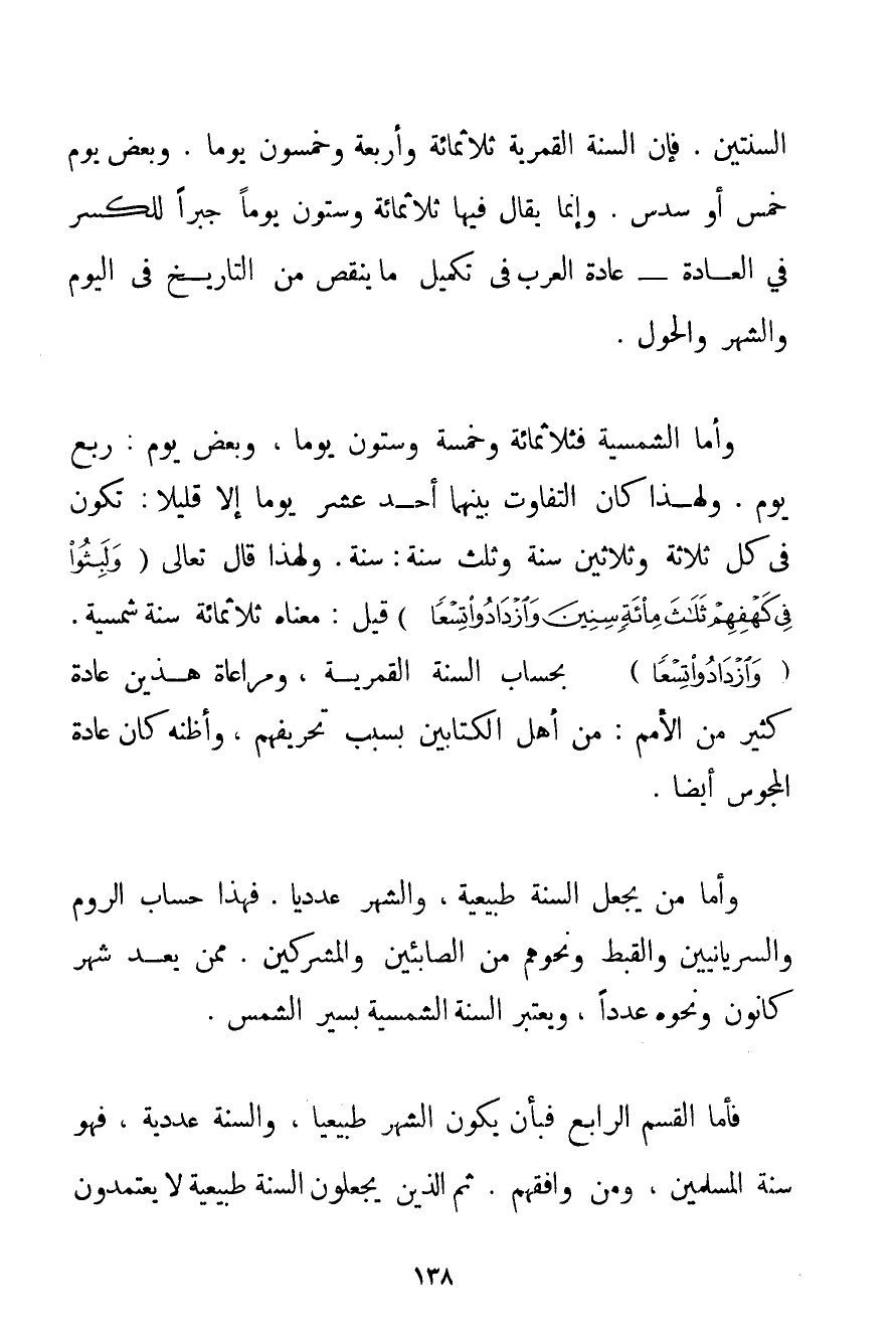 السَّنَتَيْنِ. فَإِنَّ السَّنَةَ الْقَمَرِيَّةَ ثَلَاثُمِائَةٍ وَأَرْبَعَةٌ وَخَمْسُونَ يَوْمًا. وَبَعْضُ يَوْمٍ خُمُسٌ أَوْ سُدْسٌ. وَإِنَّمَا يُقَالُ فِيهَا ثَلَاثُمِائَةٍ وَسِتُّونَ يَوْمًا جَبْرًا لِلْكَسْرِ فِي الْعَادَةِ - عَادَةِ الْعَرَبِ فِي تَكْمِيلِ مَا يَنْقُصُ مِنْ التَّارِيخِ فِي الْيَوْمِ وَالشَّهْرِ وَالْحَوْلِ. وَأَمَّا الشَّمْسِيَّةُ فَثَلَاثُمِائَةٍ وَخَمْسَةٌ وَسِتُّونَ يَوْمًا وَبَعْضُ يَوْمٍ: رُبْعُ يَوْمٍ. وَلِهَذَا كَانَ التَّفَاوُتُ بَيْنَهُمَا أَحَدَ عَشَرَ يَوْمًا إلَّا قَلِيلًا: تَكُونُ فِي كُلِّ ثَلَاثَةٍ وَثَلَاثِينَ سَنَةً وَثُلْثِ سَنَةٍ: سَنَةٌ. وَلِهَذَا قَالَ تَعَالَى {وَلَبِثُوا فِي كَهْفِهِمْ ثَلَاثَ مِائَةٍ سِنِينَ وَازْدَادُوا تِسْعًا} قِيلَ: مَعْنَاهُ ثَلَاثُمِائَةٍ سَنَةً شَمْسِيَّةً. {وَازْدَادُوا تِسْعًا} بِحِسَابِ السَّنَةِ الْقَمَرِيَّةِ وَمُرَاعَاةُ هَذَيْنِ عَادَةُ كَثِيرٍ مِنْ الْأُمَمِ: مِنْ أَهْلِ الْكِتَابَيْنِ بِسَبَبِ تَحْرِيفِهِمْ وَأَظُنُّهُ كَانَ عَادَةَ الْمَجُوسِ أَيْضًا. وَأَمَّا مَنْ يَجْعَلُ السَّنَةَ طَبِيعِيَّةً وَالشَّهْرَ عَدَدِيًّا. فَهَذَا حِسَابُ الرُّومِ وَالسُّرْيَانِيِّين وَالْقِبْطِ وَنَحْوِهِمْ مِنْ الصَّابِئِينَ وَالْمُشْرِكِينَ. مِمَّنْ يَعُدُّ شَهْرَ كَانُونَ وَنَحْوَهُ عَدَدًا وَيَعْتَبِرُ السَّنَةَ الشَّمْسِيَّةَ بِسَيْرِ الشَّمْسِ. فَأَمَّا الْقِسْمُ الرَّابِعُ فَبِأَنْ يَكُونَ الشَّهْرُ طَبِيعِيًّا وَالسَّنَةُ عَدَدِيَّةً فَهُوَ سُنَّةُ الْمُسْلِمِينَ وَمَنْ وَافَقَهُمْ. ثُمَّ الَّذِينَ يَجْعَلُونَ السَّنَةَ طَبِيعِيَّةً لَا يَعْتَمِدُونَ