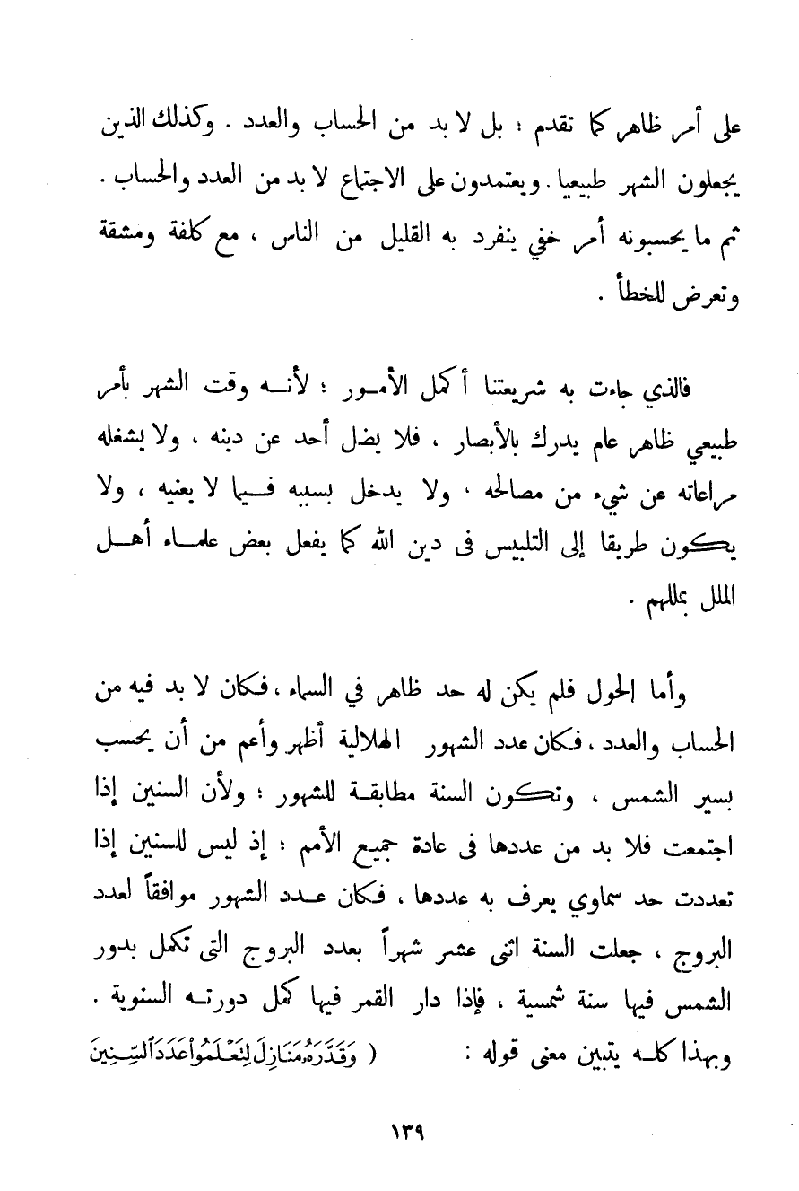 عَلَى أَمْرٍ ظَاهِرٍ كَمَا تَقَدَّمَ؛ بَلْ لَا بُدَّ مِنْ الْحِسَابِ وَالْعَدَدِ. وَكَذَلِكَ الَّذِينَ يَجْعَلُونَ الشَّهْرَ طَبِيعِيًّا. وَيَعْتَمِدُونَ عَلَى الِاجْتِمَاعِ لَا بُدَّ مِنْ الْعَدَدِ وَالْحِسَابِ. ثُمَّ مَا يَحْسِبُونَهُ أَمْرٌ خَفِيٌّ يَنْفَرِدُ بِهِ الْقَلِيلُ مِنْ النَّاسِ مَعَ كُلْفَةٍ وَمَشَقَّةٍ وَتَعَرُّضٍ لِلْخَطَأِ. فَاَلَّذِي جَاءَتْ بِهِ شَرِيعَتُنَا أَكْمَلُ الْأُمُورِ؛ لِأَنَّهُ وَقَّتَ الشَّهْرَ بِأَمْرِ طَبِيعِيٍّ ظَاهِرٍ عَامٍّ يُدْرَكُ بِالْأَبْصَارِ فَلَا يَضِلُّ أَحَدٌ عَنْ دِينِهِ وَلَا يَشْغَلُهُ مُرَاعَاتُهُ عَنْ شَيْءٍ مِنْ مَصَالِحِهِ وَلَا يَدْخُلُ بِسَبَبِهِ فِيمَا لَا يَعْنِيه وَلَا يَكُونُ طَرِيقًا إلَى التَّلْبِيسِ فِي دِينِ اللَّهِ كَمَا يَفْعَلُ بَعْضُ عُلَمَاءَ أَهْلِ الْمِلَلِ بِمِلَلِهِمْ. وَأَمَّا الْحَوْلُ فَلَمْ يَكُنْ لَهُ حَدٌّ ظَاهِرٌ فِي السَّمَاءِ فَكَانَ لَا بُدَّ فِيهِ مِنْ الْحِسَابِ وَالْعَدَدِ فَكَانَ عَدَدُ الشُّهُورِ الْهِلَالِيَّةِ أَظْهَرَ وَأَعَمَّ مِنْ أَنْ يُحْسَبَ بِسَيْرِ الشَّمْسِ وَتَكُونُ السَّنَةُ مُطَابِقَةً لِلشُّهُورِ؛ وَلِأَنَّ السِّنِينَ إذَا اجْتَمَعَتْ فَلَا بُدَّ مِنْ عَدَدِهَا فِي عَادَةِ جَمِيعِ الْأُمَمِ؛ إذْ لَيْسَ لِلسِّنَّيْنِ إذَا تَعَدَّدَتْ حَدٌّ سَمَاوِيٌّ يُعْرَفُ بِهِ عَدَدُهَا فَكَانَ عَدَدُ الشُّهُورِ مُوَافِقًا لِعَدَدِ الْبُرُوجِ جُعِلَتْ السَّنَةُ اثْنَيْ عَشَرَ شَهْرًا بِعَدَدِ الْبُرُوجِ الَّتِي تَكْمُلُ بِدَوْرِ الشَّمْسِ فِيهَا سَنَةً شَمْسِيَّةً فَإِذَا دَارَ الْقَمَرُ فِيهَا كَمَّلَ دَوْرَتَهُ السَّنَوِيَّةَ. وَبِهَذَا كُلِّهِ يَتَبَيَّنُ مَعْنَى قَوْلِهِ: {وَقَدَّرَهُ مَنَازِلَ لِتَعْلَمُوا عَدَدَ السِّنِينَ