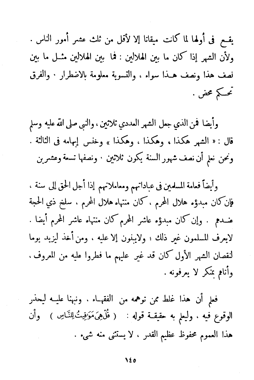 يَقَعُ فِي أَوَّلِهَا لَمَا كَانَتْ مِيقَاتًا إلَّا لِأَقَلَّ مِنْ ثُلُثِ عُشْرِ أُمُورِ النَّاسِ. وَلِأَنَّ الشَّهْرَ إذَا كَانَ مَا بَيْنَ الْهِلَالَيْنِ: فَمَا بَيْنَ الْهِلَالَيْنِ مِثْلُ مَا بَيْنَ نِصْفِ هَذَا وَنِصْفِ هَذَا سَوَاءٌ وَالتَّسْوِيَةُ مَعْلُومَةٌ بِالِاضْطِرَارِ. وَالْفَرْقُ تَحَكُّمٌ مَحْضٌ. وَأَيْضًا فَمَنْ الَّذِي جَعَلَ الشَّهْرَ الْعَدَدِيَّ ثَلَاثِينَ وَالنَّبِيُّ صَلَّى اللَّهُ عَلَيْهِ وَسَلَّمَ قَالَ: {الشَّهْرُ هَكَذَا وَهَكَذَا وَهَكَذَا وَخَنَّسَ إبْهَامَهُ فِي الثَّالِثَةِ} وَنَحْنُ نَعْلَمُ أَنَّ نِصْفَ شُهُورِ السَّنَةِ يَكُونُ ثَلَاثِينَ وَنِصْفَهَا تِسْعَةً وَعِشْرِينَ وَأَيْضًا فَعَامَّةُ الْمُسْلِمِينَ فِي عِبَادَاتِهِمْ وَمُعَامَلَاتِهِمْ إذَا أَجَّلَ الْحَقَّ إلَى سَنَةٍ. فَإِنْ كَانَ مَبْدَؤُهُ هِلَالَ الْمُحَرَّمِ كَانَ مُنْتَهَاهُ هِلَالَ الْمُحَرَّمِ سَلْخَ ذِي الْحِجَّةِ عِنْدَهُمْ. وَإِنْ كَانَ مَبْدَؤُهُ عَاشِرَ الْمُحَرَّمِ كَانَ مُنْتَهَاهُ عَاشِرَ الْمُحَرَّمِ أَيْضًا. لَا يَعْرِفُ الْمُسْلِمُونَ غَيْرَ ذَلِكَ؛ وَلَا يَبْنُونَ إلَّا عَلَيْهِ وَمَنْ أَخَذَ لِيَزِيدَ يَوْمًا لِنُقْصَانِ الشَّهْرِ الْأَوَّلِ كَانَ قَدْ غَيَّرَ عَلَيْهِمْ مَا فُطِرُوا عَلَيْهِ مِنْ الْمَعْرُوفِ وَأَتَاهُمْ بِمُنْكَرِ لَا يَعْرِفُونَهُ. فَعُلِمَ أَنَّ هَذَا غَلَطٌ مِمَّنْ تَوَهَّمَهُ مِنْ الْفُقَهَاءِ وَنَبَّهْنَا عَلَيْهِ لِيُحْذَرَ الْوُقُوعُ فِيهِ وَلِيُعْلَمَ بِهِ حَقِيقَةُ قَوْلِهِ: {قُلْ هِيَ مَوَاقِيتُ لِلنَّاسِ} وَأَنَّ هَذَا الْعُمُومَ مَحْفُوظٌ عَظِيمُ الْقَدْرِ لَا يُسْتَثْنَى مِنْهُ شَيْءٌ.