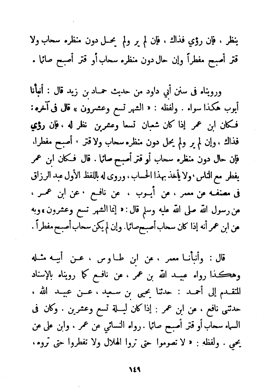 فَإِنْ رُئِيَ فَذَاكَ فَإِنْ لَمْ يُرَ وَلَمْ يَحُلْ دُونَ مَنْظَرِهِ سَحَابٌ وَلَا قَتَرٌ أَصْبَحَ مُفْطِرًا وَإِنْ حَالَ دُونَ مَنْظَرِهِ سَحَابٌ أَوْ قَتَرٌ أَصْبَحَ صَائِمًا. وَرَوَيْنَاهُ. فِي سُنَنِ أَبِي دَاوُد مِنْ حَدِيثِ حَمَّادِ بْنِ زَيْدٍ قَالَ: أَنْبَأَنَا أَيُّوبُ هَكَذَا سَوَاءً. وَلَفْظُهُ: {الشَّهْرُ تِسْعٌ وَعِشْرُونَ} قَالَ فِي آخِرِهِ: فَكَانَ ابْنِ عُمَرَ إذَا كَانَ شَعْبَانُ تِسْعًا وَعِشْرِينَ نُظِرَ لَهُ فَإِنْ رُئِيَ فَذَاكَ وَإِنْ لَمْ يُرَ وَلَمْ يَحُلْ دُونَ مَنْظَرِهِ سَحَابٌ وَلَا قَتَرٌ أَصْبَحَ مُفْطِرًا فَإِنْ حَالَ دُونَ مَنْظَرِهِ سَحَابٌ أَوْ قَتَرٌ أَصْبَحَ صَائِمًا قَالَ فَكَانَ ابْنِ عُمَرَ يُفْطِرُ مَعَ النَّاسِ وَلَا يَأْخُذُ بِهَذَا الْحِسَابِ وَرِوَى لَهُ بِاللَّفْظِ الْأَوَّلِ عَبْدُ الرَّزَّاقِ فِي مُصَنَّفِهِ عَنْ مَعْمَرٍ عَنْ أَيُّوبَ عَنْ نَافِعٍ عَنْ ابْنِ عُمَرَ عَنْ رَسُولِ اللَّهِ صَلَّى اللَّهُ عَلَيْهِ وَسَلَّمَ قَالَ: {إنَّمَا الشَّهْرُ تِسْعٌ وَعِشْرُونَ} وَبِهِ عَنْ ابْنِ عُمَرَ أَنَّهُ إذَا كَانَ سَحَابٌ أَصْبَحَ صَائِمًا. وَإِنْ لَمْ يَكُنْ سَحَابٌ أَصْبَحَ مُفْطِرًا. قَالَ: وَأَنْبَأَنَا مَعْمَرٌ عَنْ ابْنِ طاوس عَنْ أَبِيهِ مِثْلَهُ وَهَكَذَا رَوَاهُ عُبَيْدُ اللَّهِ بْنُ عُمَرَ عَنْ نَافِعٍ كَمَا رَوَيْنَاهُ بِالْإِسْنَادِ الْمُتَقَدِّمِ إلَى أَحْمَد: حَدَّثَنَا يَحْيَى بْنُ سَعِيدٍ عَنْ عُبَيْدِ اللَّهِ حَدَّثَنِي نَافِعٌ عَنْ ابْنِ عُمَرَ: إذَا كَانَ لَيْلَةُ تِسْعٍ وَعِشْرِينَ. وَكَانَ فِي السَّمَاءِ سَحَابٌ أَوْ قَتَرٌ أَصْبَحَ صَائِمًا. رَوَاهُ النَّسَائِي عَنْ عُمَرَو بْنُ عَلِيٍّ عَنْ يَحْيَى. وَلَفْظُهُ: {لَا تَصُومُوا حَتَّى تَرَوْا الْهِلَالَ وَلَا تُفْطِرُوا حَتَّى تَرَوْهُ،