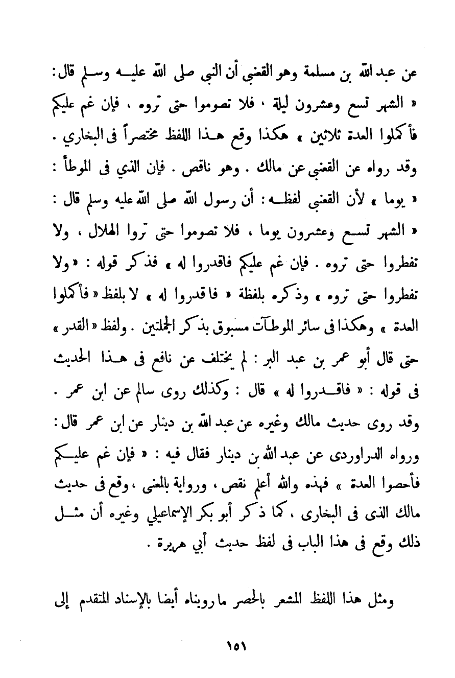 عَنْ عَبْدِ اللَّهِ بْنِ مسلمة وَهُوَ القعنبي أَنَّ النَّبِيَّ صَلَّى اللَّهُ عَلَيْهِ وَسَلَّمَ قَالَ: {الشَّهْرُ تِسْعٌ وَعِشْرُونَ لَيْلَةً فَلَا تَصُومُوا حَتَّى تَرَوْهُ فَإِنْ غُمَّ عَلَيْكُمْ فَأَكْمِلُوا الْعِدَّةَ ثَلَاثِينَ} هَكَذَا وَقَعَ هَذَا اللَّفْظُ مُخْتَصَرًا فِي الْبُخَارِيِّ. وَقَدْ رَوَاهُ عَنْ القعنبي عَنْ مَالِكٍ. وَهُوَ نَاقِصٌ. فَإِنَّ الَّذِي فِي الْمُوَطَّأِ: " يَوْمًا " لِأَنَّ القعنبي لَفْظُهُ: أَنَّ رَسُولَ اللَّهِ صَلَّى اللَّهُ عَلَيْهِ وَسَلَّمَ قَالَ: {الشَّهْرُ تِسْعٌ وَعِشْرُونَ يَوْمًا فَلَا تَصُومُوا حَتَّى تَرَوْا الْهِلَالَ وَلَا تُفْطِرُوا حَتَّى تَرَوْهُ. فَإِنْ غُمَّ عَلَيْكُمْ فَاقْدُرُوا لَهُ} فَذَكَرَ قَوْلَهُ: {وَلَا تُفْطِرُوا حَتَّى تَرَوْهُ} وَذَكَرَهُ بِلَفْظَةِ {فَاقْدُرُوا لَهُ} لَا بِلَفْظِ {فَأَكْمِلُوا الْعِدَّةَ} وَهَكَذَا فِي سَائِر الْمُوَطَّآتِ مَسْبُوقٌ بِذِكْرِ الْجُمْلَتَيْنِ. وَلَفْظُ " الْقَدْر " حَتَّى قَالَ أَبُو عُمَرَ بْنُ عَبْدِ الْبَرِّ: لَمْ يُخْتَلَفْ عَنْ نَافِعٍ فِي هَذَا الْحَدِيثِ فِي قَوْلِهِ: {فَاقْدُرُوا لَهُ} قَالَ: وَكَذَلِكَ رَوَى سَالِمٌ عَنْ ابْنِ عُمَرَ. وَقَدْ رَوَى حَدِيثَ مَالِكٍ وَغَيْرِهِ عَنْ عَبْدِ اللَّهِ بْنِ دِينَارٍ عَنْ ابْنِ عُمَرَ قَالَ: وَرَوَاهُ الدراوردي عَنْ عَبْدِ اللَّهِ بْنِ دِينَارٍ فَقَالَ فِيهِ: {فَإِنْ غُمَّ عَلَيْكُمْ فَأَحْصُوا الْعِدَّةَ} فَهَذِهِ وَاَللَّهُ أَعْلَمُ نَقْصٌ وَرِوَايَةٌ بِالْمَعْنَى وَقَعَ فِي حَدِيثِ مَالِكٍ الَّذِي فِي الْبُخَارِيِّ كَمَا ذَكَرَ أَبُو بَكْرٍ الْإِسْمَاعِيلِيُّ وَغَيْرُهُ أَنَّ مِثْلَ ذَلِكَ وَقَعَ فِي هَذَا الْبَابِ فِي لَفْظِ حَدِيثِ أَبِي هُرَيْرَةَ. وَمِثْلُ هَذَا اللَّفْظِ الْمُشْعِرُ بِالْحَصْرِ مَا رَوَيْنَاهُ أَيْضًا بِالْإِسْنَادِ الْمُتَقَدِّمِ إلَى