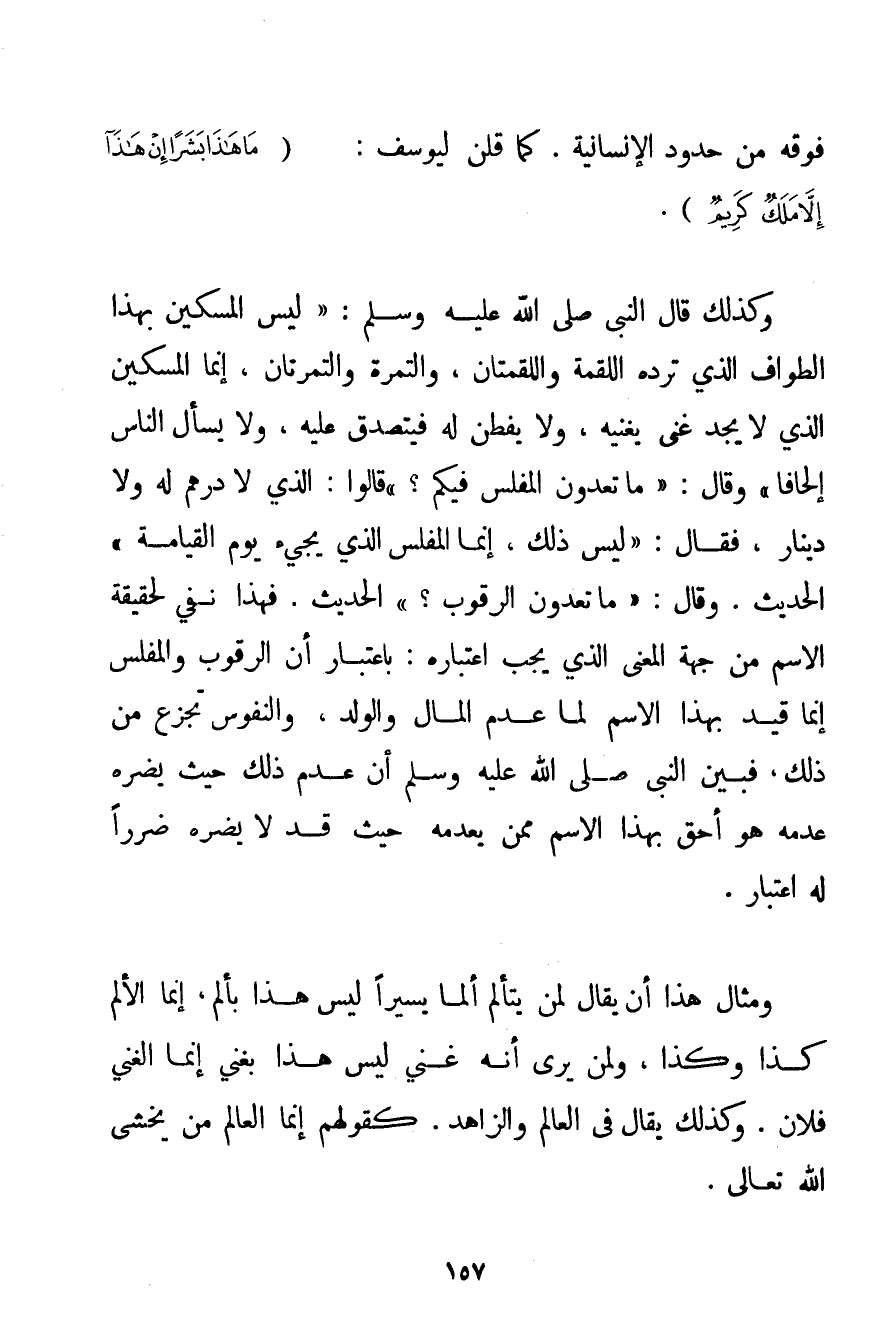 فَوْقَهُ مِنْ حُدُودِ الْإِنْسَانِيَّةِ. كَمَا قُلْنَ لِيُوسُفَ: {مَا هَذَا بَشَرًا إنْ هَذَا إلَّا مَلَكٌ كَرِيمٌ} . وَكَذَلِكَ قَالَ النَّبِيُّ صَلَّى اللَّهُ عَلَيْهِ وَسَلَّمَ {لَيْسَ الْمِسْكِينُ بِهَذَا الطَّوَّافِ الَّذِي تَرُدُّهُ اللُّقْمَةُ وَاللُّقْمَتَانِ وَالتَّمْرَةُ وَالتَّمْرَتَانِ إنَّمَا الْمِسْكِينُ الَّذِي لَا يَجِدُ غِنًى يُغْنِيهِ وَلَا يُفْطَنُ لَهُ فَيُتَصَدَّقُ عَلَيْهِ وَلَا يَسْأَلُ النَّاسَ إلْحَافًا} وَقَالَ: {مَا تَعُدُّونَ الْمُفْلِسَ فِيكُمْ؟ قَالُوا: الَّذِي لَا دِرْهَمَ لَهُ وَلَا دِينَارَ فَقَالَ: لَيْسَ ذَلِكَ إنَّمَا الْمُفْلِسُ الَّذِي يَجِيءُ يَوْمَ الْقِيَامَةِ} الْحَدِيثَ. وَقَالَ: {مَا تُعِدُّونَ الرَّقُوبَ؟} الْحَدِيثَ. فَهَذَا نَفْيٌ لِحَقِيقَةِ الِاسْمِ مِنْ جِهَةِ الْمَعْنَى الَّذِي يَجِبُ اعْتِبَارُهُ: بِاعْتِبَارِ أَنَّ الرَّقُوبَ وَالْمُفْلِسَ إنَّمَا قُيِّدَ بِهَذَا الِاسْمِ لَمَّا عَدِمَ الْمَالَ وَالْوَلَدَ وَالنُّفُوسُ تَجْزَعُ مِنْ ذَلِكَ فَبَيَّنَ النَّبِيُّ صَلَّى اللَّهُ عَلَيْهِ وَسَلَّمَ أَنَّ عَدَمَ ذَلِكَ حَيْثُ يَضُرُّهُ عَدَمُهُ هُوَ أَحَقُّ بِهَذَا الِاسْمِ مِمَّنْ يَعْدَمُهُ حَيْثُ قَدْ لَا يَضُرُّهُ ضَرَرًا لَهُ اعْتِبَارٌ. وَمَثَّالُ هَذَا أَنْ يُقَالَ لِمَنْ يَتَأَلَّمُ أَلَمًا يَسِيرًا لَيْسَ هَذَا بِأَلَمِ إنَّمَا الْأَلَمُ كَذَا وَكَذَا وَلِمَنْ يَرَى أَنَّهُ غَنِيٌّ لَيْسَ هَذَا بِغَنِيِّ إنَّمَا الْغَنِيُّ فُلَانٌ. وَكَذَلِكَ يُقَالُ فِي الْعَالَمِ وَالزَّاهِدِ. كَقَوْلِهِمْ إنَّمَا الْعَالِمُ مَنْ يَخْشَى اللَّهَ تَعَالَى.