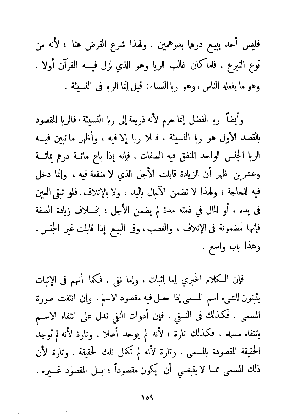 فَلَيْسَ أَحَدٌ يَبِيعُ دِرْهَمًا بِدِرْهَمَيْنِ. وَلِهَذَا شُرِعَ الْقَرْضُ هُنَا؛ لِأَنَّهُ مِنْ نَوْعِ التَّبَرُّعِ. فَلَمَّا كَانَ غَالِبُ الرِّبَا وَهُوَ الَّذِي نَزَلَ فِيهِ الْقُرْآنُ أَوَّلًا وَهُوَ مَا يَفْعَلُهُ النَّاسُ وَهُوَ رِبَا النَّسَاءِ: قِيلَ إنَّمَا الرِّبَا فِي النَّسِيئَةِ. وَأَيْضًا رِبَا الْفَضْلِ إنَّمَا حُرِّمَ لِأَنَّهُ ذَرِيعَةٌ إلَى رِبَا النَّسِيئَةِ فَالرِّبَا الْمَقْصُودُ بِالْقَصْدِ الْأَوَّلِ هُوَ رِبَا النَّسِيئَةِ فَلَا رِبَا إلَّا فِيهِ وَأَظْهَرُ مَا تَبَيَّنَ فِيهِ الرِّبَا الْجِنْسُ الْوَاحِدُ الْمُتَّفَقُ فِيهِ الصِّفَاتُ فَإِنَّهُ إذَا بَاعَ مِائَةَ دِرْهَمٍ بِمِائَةِ وَعِشْرِينَ ظَهَرَ أَنَّ الزِّيَادَةَ قَابَلَتْ الْأَجَلَ الَّذِي لَا مَنْفَعَةَ فِيهِ وَإِنَّمَا دَخَلَ فِيهِ لِلْحَاجَةِ؛ وَلِهَذَا لَا تُضْمَنُ الْآجَالُ بِالْيَدِ وَلَا بِالْإِتْلَافِ. فَلَوْ تَبَقَّى الْعَيْنُ فِي يَدِهِ أَوْ الْمَالُ فِي ذِمَّتِهِ مُدَّةً لَمْ يَضْمَنْ الْأَجَلَ؛ بِخِلَافِ زِيَادَةِ الصِّفَةِ فَإِنَّهَا مَضْمُونَةٌ فِي الْإِتْلَافِ وَالْغَصْبِ وَفِي الْبَيْعِ إذَا قَابَلَتْ غَيْرَ الْجِنْسِ. وَهَذَا بَابٌ وَاسِعٌ. فَإِنَّ الْكَلَامَ الْخَبَرِيَّ إمَّا إثْبَاتٌ وَإِمَّا نَفْيٌ. فَكَمَا أَنَّهُمْ فِي الْإِثْبَاتِ يُثْبِتُونَ لِلشَّيْءِ اسْمَ الْمُسَمَّى إذَا حَصَلَ فِيهِ مَقْصُودُ الِاسْمِ وَإِنْ انْتَفَتْ صُورَةُ الْمُسَمَّى. فَكَذَلِكَ فِي النَّفْيِ. فَإِنَّ أَدَوَاتِ النَّفْيِ تَدُلُّ عَلَى انْتِفَاءِ الِاسْمِ بِانْتِفَاءِ مُسَمَّاهُ فَكَذَلِكَ تَارَةً؛ لِأَنَّهُ لَمْ يُوجَدْ أَصْلًا. وَتَارَةً لِأَنَّهُ لَمْ تُوجَدْ الْحَقِيقَةُ الْمَقْصُودَةُ بِالْمُسَمَّى. وَتَارَةً لِأَنَّهُ لَمْ تَكْمُلْ تِلْكَ الْحَقِيقَةُ. وَتَارَةً لِأَنَّ ذَلِكَ الْمُسَمَّى مِمَّا لَا يَنْبَغِي أَنْ يَكُونَ مَقْصُودًا؛ بَلْ الْمَقْصُودُ غَيْرُهُ.