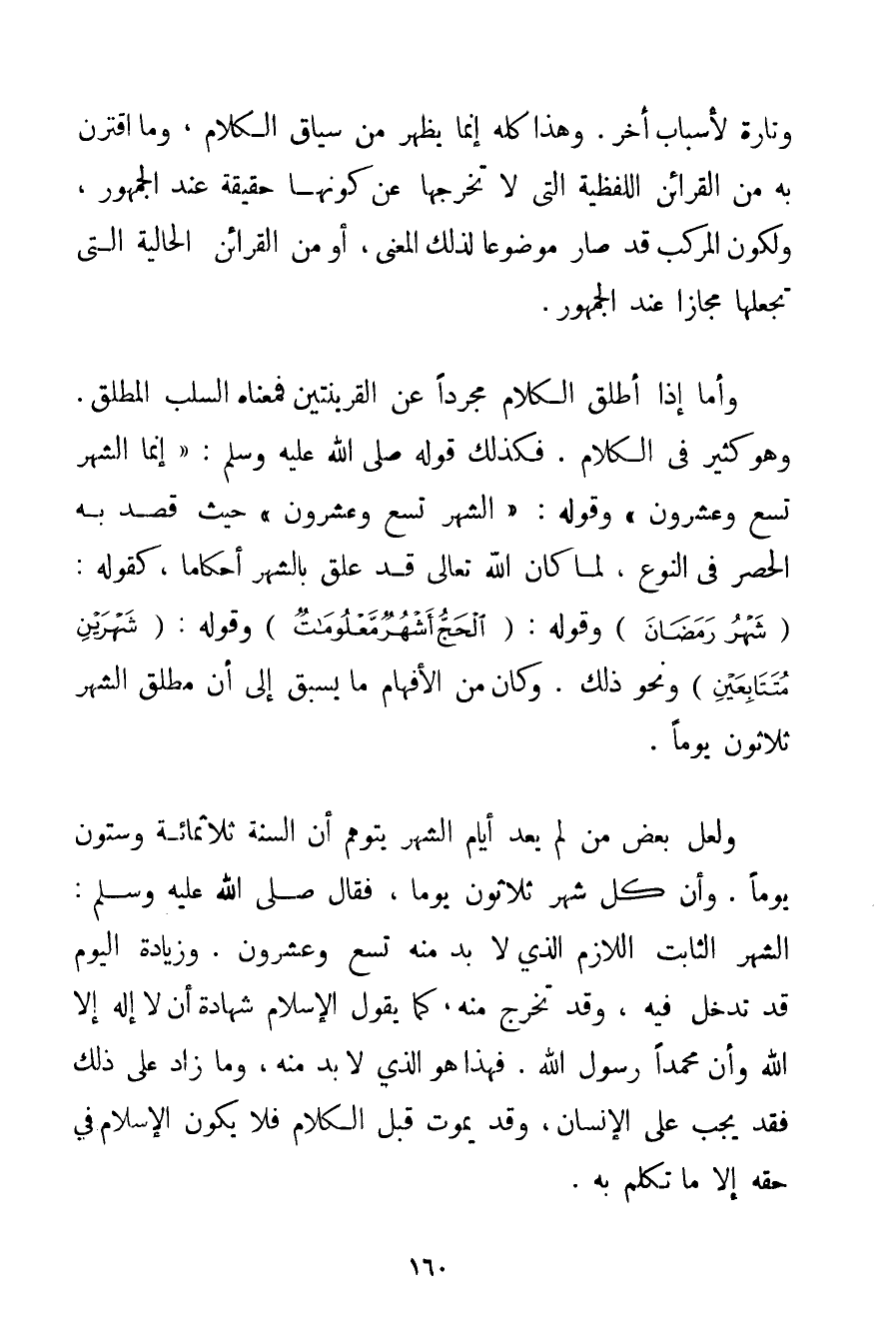 وَتَارَةً لِأَسْبَابِ أُخَرَ. وَهَذَا كُلُّهُ إنَّمَا يَظْهَرُ مِنْ سِيَاقِ الْكَلَامِ وَمَا اقْتَرَنَ بِهِ مِنْ الْقَرَائِنِ اللَّفْظِيَّةِ الَّتِي لَا تُخْرِجُهَا عَنْ كَوْنِهَا حَقِيقَةً عِنْدَ الْجُمْهُورِ وَلِكَوْنِ الْمُرَكَّبِ قَدْ صَارَ مَوْضُوعًا لِذَلِكَ الْمَعْنَى أَوْ مِنْ الْقَرَائِنِ الْحَالِيَّةِ الَّتِي تَجْعَلُهَا مَجَازًا عِنْدَ الْجُمْهُورِ. وَأَمَّا إذَا أُطْلِقَ الْكَلَامُ مُجَرَّدًا عَنْ الْقَرِينَتَيْنِ فَمَعْنَاهُ السَّلْبُ الْمُطْلَقُ وَهُوَ كَثِيرٌ فِي الْكَلَامِ. فَكَذَلِكَ قَوْلُهُ صَلَّى اللَّهُ عَلَيْهِ وَسَلَّمَ {إنَّمَا الشَّهْرُ تِسْعٌ وَعِشْرُونَ} وَقَوْلُهُ: {الشَّهْرُ تِسْعٌ وَعِشْرُونَ} حَيْثُ قَصَدَ بِهِ الْحَصْرَ فِي النَّوْعِ لَمَّا كَانَ اللَّهُ تَعَالَى قَدْ عَلَّقَ بِالشَّهْرِ أَحْكَامًا كَقَوْلِهِ: {شَهْرُ رَمَضَانَ} وَقَوْلِهِ: {الْحَجُّ أَشْهُرٌ مَعْلُومَاتٌ} وَقَوْلِهِ: {شَهْرَيْنِ مُتَتَابِعَيْنِ} وَنَحْوِ ذَلِكَ. وَكَانَ مِنْ الْأَفْهَامِ مَا يَسْبِقُ إلَى أَنَّ مُطْلَقَ الشَّهْرِ ثَلَاثُونَ يَوْمًا. وَلَعَلَّ بَعْضَ مَنْ لَمْ يَعُدَّ أَيَّامَ الشَّهْرِ يَتَوَهَّمُ أَنَّ السَّنَةَ ثَلَاثُمِائَةٍ وَسِتُّونَ يَوْمًا. وَأَنَّ كُلَّ شَهْرٍ ثَلَاثُونَ يَوْمًا فَقَالَ صَلَّى اللَّهُ عَلَيْهِ وَسَلَّمَ الشَّهْرُ الثَّابِتُ اللَّازِمُ الَّذِي لَا بُدَّ مِنْهُ تِسْعٌ وَعِشْرُونَ. وَزِيَادَةُ الْيَوْمِ قَدْ تَدْخُلُ فِيهِ وَقَدْ تَخْرُجُ مِنْهُ كَمَا يَقُولُ الْإِسْلَامُ شَهَادَةُ أَنْ لَا إلَهَ إلَّا اللَّهُ وَأَنْ مُحَمَّدًا رَسُولُ اللَّهِ. فَهَذَا هُوَ الَّذِي لَا بُدَّ مِنْهُ وَمَا زَادَ عَلَى ذَلِكَ فَقَدْ يَجِبُ عَلَى الْإِنْسَانِ وَقَدْ يَمُوتُ قَبْلَ الْكَلَامِ فَلَا يَكُونُ الْإِسْلَامُ فِي حَقِّهِ إلَّا مَا تَكَلَّمَ بِهِ.