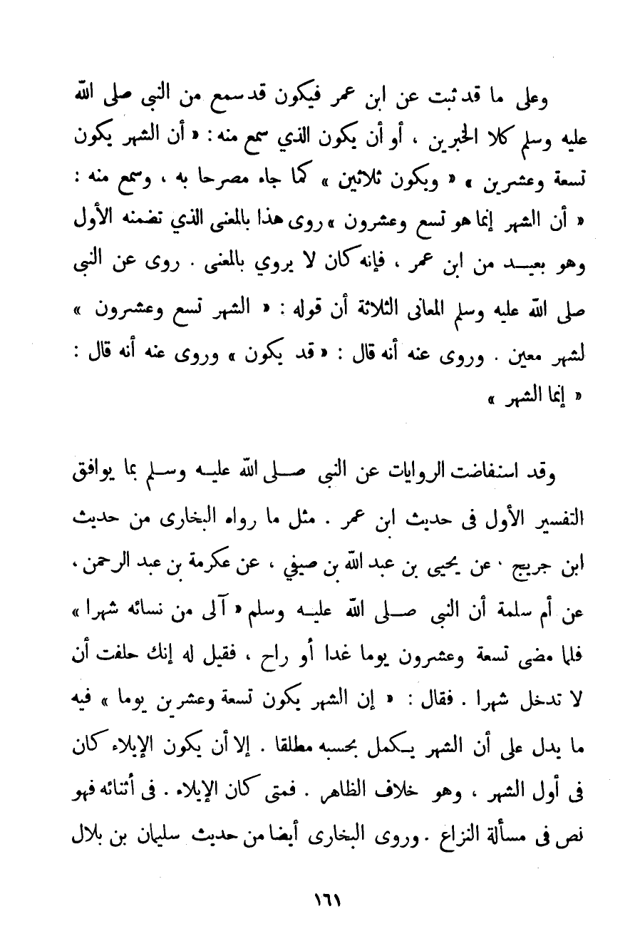 وَعَلَى مَا قَدْ ثَبَتَ عَنْ ابْنِ عُمَرَ فَيَكُونُ قَدْ سَمِعَ مِنْ النَّبِيِّ صَلَّى اللَّهُ عَلَيْهِ وَسَلَّمَ كِلَا الْخِبْرَيْنِ أَوْ أَنْ يَكُونَ الَّذِي سَمِعَ مِنْهُ: {أَنَّ الشَّهْرَ يَكُونُ تِسْعَةً وَعِشْرِينَ وَيَكُونُ ثَلَاثِينَ} كَمَا جَاءَ مُصَرَّحًا بِهِ وَسُمِعَ مِنْهُ: {أَنَّ الشَّهْرَ إنَّمَا هُوَ تِسْعٌ وَعِشْرُونَ} رُوِيَ هَذَا بِالْمَعْنَى الَّذِي تَضَمَّنَهُ الْأَوَّلُ وَهُوَ بَعِيدٌ مِنْ ابْنِ عُمَرَ فَإِنَّهُ كَانَ لَا يَرْوِي بِالْمَعْنَى. رُوِيَ عَنْ النَّبِيِّ صَلَّى اللَّهُ عَلَيْهِ وَسَلَّمَ الْمَعَانِي الثَّلَاثَةُ أَنَّ قَوْلَهُ: {الشَّهْرُ تِسْعٌ وَعِشْرُونَ} لِشَهْرِ مُعَيَّنٍ. وَرُوِيَ عَنْهُ أَنَّهُ قَالَ: {قَدْ يَكُونُ} وَرُوِيَ عَنْهُ أَنَّهُ قَالَ: {إنَّمَا الشَّهْرُ} وَقَدْ اسْتَفَاضَتْ الرِّوَايَاتُ عَنْ النَّبِيِّ صَلَّى اللَّهُ عَلَيْهِ وَسَلَّمَ بِمَا يُوَافِقُ التَّفْسِيرَ الْأَوَّلَ فِي حَدِيثِ ابْنِ عُمَرَ. مِثْلُ مَا رَوَاهُ الْبُخَارِيُّ مِنْ حَدِيثِ ابْنِ جريج. عَنْ يَحْيَى بْنِ عَبْدِ اللَّهِ بْنِ صَيْفِيٍّ عَنْ عِكْرِمَةَ بْنِ عَبْدِ الرَّحْمَنِ عَنْ أُمِّ سَلَمَةَ أَنَّ النَّبِيَّ صَلَّى اللَّهُ عَلَيْهِ وَسَلَّمَ {آلَى مِنْ نِسَائِهِ شَهْرًا فَلَمَّا مَضَى تِسْعَةٌ وَعِشْرُونَ يَوْمًا غَدَا أَوْ رَاحَ فَقِيلَ لَهُ إنَّك حَلَفْت أَنْ لَا تَدْخُلُ شَهْرًا. فَقَالَ: إنَّ الشَّهْرَ يَكُونُ تِسْعَةً وَعِشْرِينَ يَوْمًا} فِيهِ مَا يَدُلُّ عَلَى أَنَّ الشَّهْرَ يَكْمُلُ بِحَسْبِهِ مُطْلَقًا. إلَّا أَنْ يَكُونَ الْإِيلَاءُ كَانَ فِي أَوَّلِ الشَّهْرِ وَهُوَ خِلَافُ الظَّاهِرِ. فَمَتَى كَانَ الْإِيلَاءُ. فِي أَثْنَائِهِ فَهُوَ نَصٌّ فِي مَسْأَلَةِ النِّزَاعِ. وَرَوَى الْبُخَارِيُّ أَيْضًا مِنْ حَدِيثِ سُلَيْمَانَ بْنِ بِلَالٍ