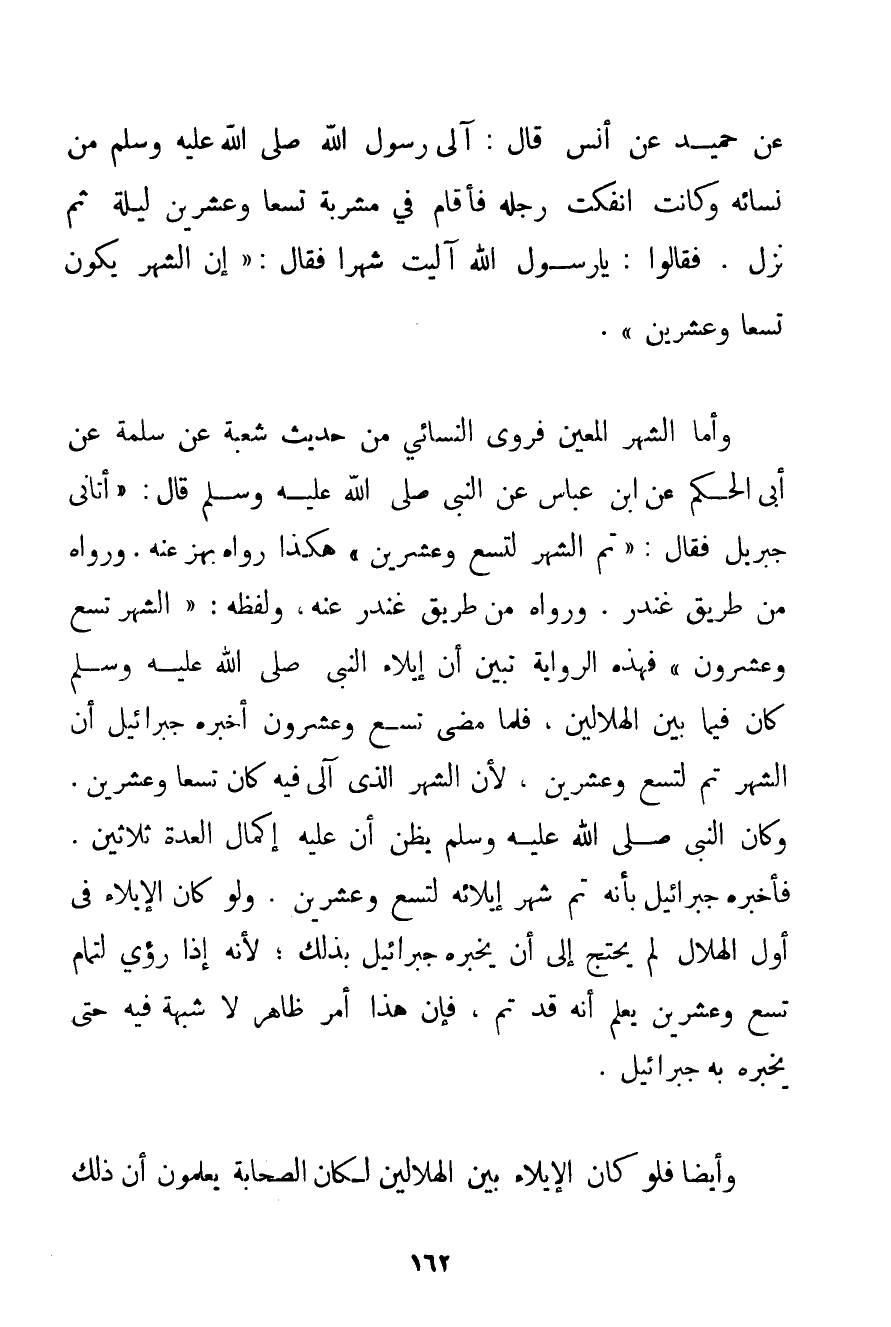 عَنْ حَمِيدٍ عَنْ أَنَسٍ {قَالَ: آلَى رَسُولُ اللَّهِ صَلَّى اللَّهُ عَلَيْهِ وَسَلَّمَ مِنْ نِسَائِهِ وَكَانَتْ انْفَكَّتْ رِجْلُهُ فَأَقَامَ فِي مَشْرَبَةٍ تِسْعًا وَعِشْرِينَ لَيْلَةً ثُمَّ نَزَلَ. فَقَالُوا: يَا رَسُولَ اللَّهِ آلَيْت شَهْرًا فَقَالَ: إنَّ الشَّهْرَ يَكُونُ تِسْعًا وَعِشْرِينَ} . وَأَمَّا الشَّهْرُ الْمُعَيَّنُ فَرَوَى النَّسَائِي مِنْ حَدِيثِ شُعْبَةَ عَنْ سَلَمَةَ عَنْ أَبِي الْحَكَمِ عَنْ ابْنِ عَبَّاسٍ عَنْ النَّبِيِّ صَلَّى اللَّهُ عَلَيْهِ وَسَلَّمَ قَالَ: {أَتَانِي جِبْرِيلُ فَقَالَ: تَمَّ الشَّهْرُ لِتِسْعِ وَعِشْرِينَ} هَكَذَا رَوَاهُ بَهْز عَنْهُ. وَرَوَاهُ مِنْ طَرِيقِ غُنْدُرٍ. وَرَوَاهُ مِنْ طَرِيقِ غُنْدُرٍ عَنْهُ وَلَفْظُهُ: {الشَّهْرُ تِسْعٌ وَعِشْرُونَ} فَهَذِهِ الرِّوَايَةُ تُبَيِّنُ أَنَّ إيلَاءَ النَّبِيِّ صَلَّى اللَّهُ عَلَيْهِ وَسَلَّمَ كَانَ فِيمَا بَيْنَ الْهِلَالَيْنِ. فَلَمَّا مَضَى تِسْعٌ وَعِشْرُونَ أَخْبَرَهُ جِبْرِيلُ أَنَّ الشَّهْرَ تَمَّ لِتِسْعِ وَعِشْرِينَ لِأَنَّ الشَّهْرَ الَّذِي آلَى فِيهِ كَانَ تِسْعًا وَعِشْرِينَ. وَكَانَ النَّبِيُّ صَلَّى اللَّهُ عَلَيْهِ وَسَلَّمَ يَظُنُّ أَنَّ عَلَيْهِ إكْمَالَ الْعِدَّةِ ثَلَاثِينَ. فَأَخْبَرَهُ جبرائيل بِأَنَّهُ تَمَّ شَهْرُ إيلَائِهِ لِتِسْعِ وَعِشْرِينَ. وَلَوْ كَانَ الْإِيلَاءُ فِي أَوَّلِ الْهِلَالِ لَمْ يَحْتَجْ إلَى أَنْ يُخْبِرَهُ جبرائيل بِذَلِكَ؛ لِأَنَّهُ إذَا رُئِيَ لِتَمَامِ تِسْعٍ وَعِشْرِينَ يُعْلَمُ أَنَّهُ قَدْ تَمَّ فَإِنَّ هَذَا أَمْرٌ ظَاهِرٌ لَا شُبْهَةَ فِيهِ حَتَّى يُخْبِرَهُ بِهِ جبرائيل. وَأَيْضًا فَلَوْ كَانَ الْإِيلَاءُ بَيْنَ الْهِلَالَيْنِ لَكَانَ الصَّحَابَةُ يَعْلَمُونَ أَنَّ ذَلِكَ