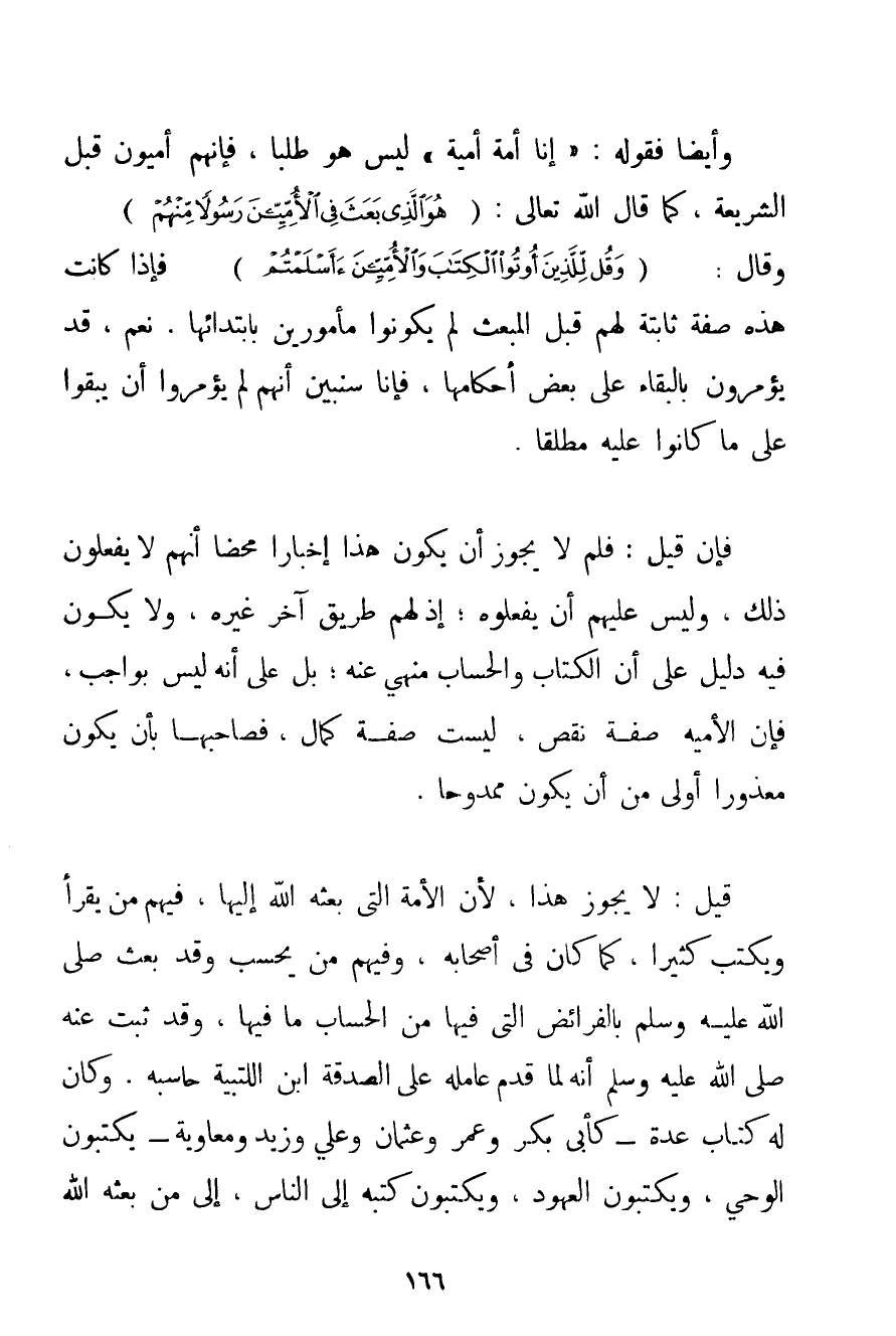 وَأَيْضًا فَقَوْلُهُ: {إنَّا أُمَّةٌ أُمِّيَّةٌ} لَيْسَ هُوَ طَلَبًا فَإِنَّهُمْ أُمِّيُّونَ قَبْلَ الشَّرِيعَةِ كَمَا قَالَ اللَّهُ تَعَالَى: {هُوَ الَّذِي بَعَثَ فِي الْأُمِّيِّينَ رَسُولًا مِنْهُمْ} وَقَالَ: {وَقُلْ لِلَّذِينَ أُوتُوا الْكِتَابَ وَالْأُمِّيِّينَ أَأَسْلَمْتُمْ} فَإِذَا كَانَتْ هَذِهِ صِفَةً ثَابِتَةً لَهُمْ قَبْلَ الْمَبْعَثِ لَمْ يَكُونُوا مَأْمُورِينَ بِابْتِدَائِهَا. نَعَمْ قَدْ يُؤْمَرُونَ بِالْبَقَاءِ عَلَى بَعْضِ أَحْكَامِهَا فَإِنَّا سَنُبَيِّنُ أَنَّهُمْ لَمْ يُؤْمَرُوا أَنْ يَبْقَوْا عَلَى مَا كَانُوا عَلَيْهِ مُطْلَقًا. فَإِنْ قِيلَ: فَلِمَ لَا يَجُوزُ أَنْ يَكُونَ هَذَا إخْبَارًا مَحْضًا أَنَّهُمْ لَا يَفْعَلُونَ ذَلِكَ وَلَيْسَ عَلَيْهِمْ أَنْ يَفْعَلُوهُ؛ إذْ لَهُمْ طَرِيقٌ آخَرُ غَيْرُهُ وَلَا يَكُونُ فِيهِ دَلِيلٌ عَلَى أَنَّ الْكِتَابَ وَالْحِسَابَ مَنْهِيٌّ عَنْهُ؛ بَلْ عَلَى أَنَّهُ لَيْسَ بِوَاجِبِ فَإِنَّ الْأُمِّيَّةَ صِفَةُ نَقْصٍ لَيْسَتْ صِفَةَ كَمَالٍ فَصَاحِبُهَا بِأَنْ يَكُونَ مَعْذُورًا أَوْلَى مِنْ أَنْ يَكُونَ مَمْدُوحًا. قِيلَ: لَا يَجُوزُ هَذَا لِأَنَّ الْأُمَّةَ الَّتِي بَعَثَهُ اللَّهُ إلَيْهَا فِيهِمْ مَنْ يَقْرَأُ وَيَكْتُبُ كَثِيرًا كَمَا كَانَ فِي أَصْحَابِهِ وَفِيهِمْ مَنْ يَحْسُبُ وَقَدْ بُعِثَ صَلَّى اللَّهُ عَلَيْهِ وَسَلَّمَ بِالْفَرَائِضِ الَّتِي فِيهَا مِنْ الْحِسَابِ مَا فِيهَا وَقَدْ ثَبَتَ عَنْهُ صَلَّى اللَّهُ عَلَيْهِ وَسَلَّمَ أَنَّهُ لَمَّا قَدِمَ عَامِلُهُ عَلَى الصَّدَقَةِ ابْنُ اللتبية حَاسَبَهُ. وَكَانَ لَهُ كُتَّابٌ عِدَّةٌ - كَأَبِي بَكْرٍ وَعُمَرَ وَعُثْمَانَ وَعَلِيٍّ وَزَيْدٍ وَمُعَاوِيَةَ - يَكْتُبُونَ الْوَحْيَ وَيَكْتُبُونَ الْعُهُودَ وَيَكْتُبُونَ كُتُبَهُ إلَى النَّاسِ إلَى مَنْ بَعَثَهُ اللَّهُ