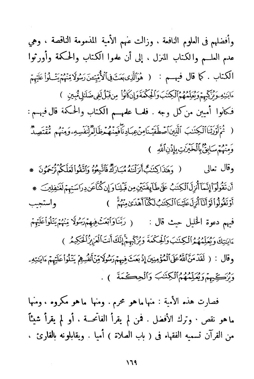 وَأَفْضَلَهُمْ فِي الْعُلُومِ النَّافِعَةِ وَزَالَتْ عَنْهُمْ الْأُمِّيَّةُ الْمَذْمُومَةُ النَّاقِصَةُ وَهِيَ عَدَمُ الْعِلْمِ وَالْكِتَابِ الْمُنَزَّلِ إلَى أَنْ عَلِمُوا الْكِتَابَ وَالْحِكْمَةَ وَأُورِثُوا الْكِتَابَ. كَمَا قَالَ فِيهِمْ: {هُوَ الَّذِي بَعَثَ فِي الْأُمِّيِّينَ رَسُولًا مِنْهُمْ يَتْلُو عَلَيْهِمْ آيَاتِهِ وَيُزَكِّيهِمْ وَيُعَلِّمُهُمُ الْكِتَابَ وَالْحِكْمَةَ وَإِنْ كَانُوا مِنْ قَبْلُ لَفِي ضَلَالٍ مُبِينٍ} فَكَانُوا أُمِّيِّينَ مِنْ كُلِّ وَجْهٍ. فَلَمَّا عَلَّمَهُمْ الْكِتَابُ وَالْحِكْمَةَ قَالَ فِيهِمْ: {ثُمَّ أَوْرَثْنَا الْكِتَابَ الَّذِينَ اصْطَفَيْنَا مِنْ عِبَادِنَا فَمِنْهُمْ ظَالِمٌ لِنَفْسِهِ وَمِنْهُمْ مُقْتَصِدٌ وَمِنْهُمْ سَابِقٌ بِالْخَيْرَاتِ بِإِذْنِ اللَّهِ} وَقَالَ تَعَالَى {وَهَذَا كِتَابٌ أَنْزَلْنَاهُ مُبَارَكٌ فَاتَّبِعُوهُ وَاتَّقُوا لَعَلَّكُمْ تُرْحَمُونَ} {أَنْ تَقُولُوا إنَّمَا أُنْزِلَ الْكِتَابُ عَلَى طَائِفَتَيْنِ مِنْ قَبْلِنَا وَإِنْ كُنَّا عَنْ دِرَاسَتِهِمْ لَغَافِلِينَ} {أَوْ تَقُولُوا لَوْ أَنَّا أُنْزِلَ عَلَيْنَا الْكِتَابُ لَكُنَّا أَهْدَى مِنْهُمْ} وَاسْتُجِيبَ فِيهِمْ دَعْوَةُ الْخَلِيلِ حَيْثُ قَالَ: {رَبَّنَا وَابْعَثْ فِيهِمْ رَسُولًا مِنْهُمْ يَتْلُو عَلَيْهِمْ آيَاتِكَ وَيُعَلِّمُهُمُ الْكِتَابَ وَالْحِكْمَةَ وَيُزَكِّيهِمْ إنَّكَ أَنْتَ الْعَزِيزُ الْحَكِيمُ} وَقَالَ: {لَقَدْ مَنَّ اللَّهُ عَلَى الْمُؤْمِنِينَ إذْ بَعَثَ فِيهِمْ رَسُولًا مِنْ أَنْفُسِهِمْ يَتْلُو عَلَيْهِمْ آيَاتِهِ وَيُزَكِّيهِمْ وَيُعَلِّمُهُمُ الْكِتَابَ وَالْحِكْمَةَ} . فَصَارَتْ هَذِهِ الْأُمِّيَّةُ: مِنْهَا مَا هُوَ مُحَرَّمٌ. وَمِنْهَا مَا هُوَ مَكْرُوهٌ وَمِنْهَا مَا هُوَ نَقْصٌ وَتَرْكُ الْأَفْضَلِ. فَمَنْ لَمْ يَقْرَأْ الْفَاتِحَةَ أَوْ لَمْ يَقْرَأْ شَيْئًا مِنْ الْقُرْآنِ تُسَمِّيهِ الْفُقَهَاءُ فِي بَابِ الصَّلَاةِ أُمِّيًّا. وَيُقَابِلُونَهُ بِالْقَارِئِ