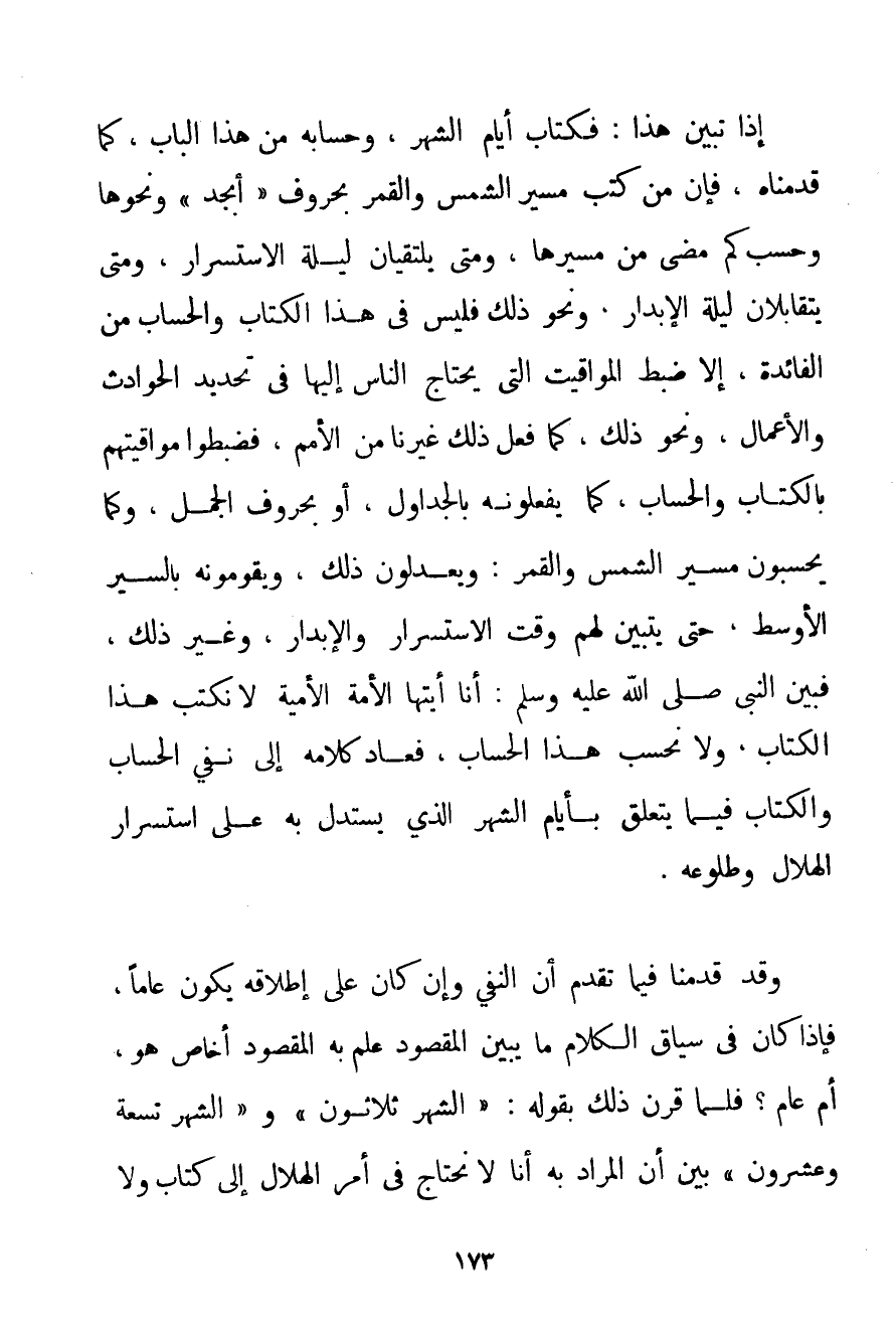 إذَا تَبَيَّنَ هَذَا: فَكِتَابُ أَيَّامِ الشَّهْرِ وَحِسَابِهِ مِنْ هَذَا الْبَابِ كَمَا قَدَّمْنَاهُ فَإِنَّ مَنْ كَتَبَ مَسِيرَ الشَّمْسِ وَالْقَمَرِ بِحُرُوفِ " أَبِجَدِّ " وَنَحْوِهَا وَحَسَبَ كَمْ مَضَى مِنْ مَسِيرِهَا وَمَتَى يَلْتَقِيَانِ لَيْلَةَ الِاسْتِسْرَارِ وَمَتَى يَتَقَابَلَانِ لَيْلَةَ الْإِبْدَارِ وَنَحْوَ ذَلِكَ فَلَيْسَ فِي هَذَا الْكِتَابِ وَالْحِسَابِ مِنْ الْفَائِدَةِ إلَّا ضَبْطُ الْمَوَاقِيتِ الَّتِي يَحْتَاجُ النَّاسُ إلَيْهَا فِي تَحْدِيدِ الْحَوَادِثِ وَالْأَعْمَالِ وَنَحْوِ ذَلِكَ. كَمَا فَعَلَ ذَلِكَ غَيْرُنَا مِنْ الْأُمَمِ فَضَبَطُوا مَوَاقِيتَهُمْ بِالْكِتَابِ وَالْحِسَابِ كَمَا يَفْعَلُونَهُ بِالْجَدَاوِلِ أَوْ بِحُرُوفِ الْجُمَلِ وَكَمَا يَحْسُبُونَ مَسِيرَ الشَّمْسِ وَالْقَمَرِ: وَيَعْدِلُونَ ذَلِكَ وَيُقَوِّمُونَهُ بِالسَّيْرِ الْأَوْسَطِ حَتَّى يَتَبَيَّنَ لَهُمْ وَقْتُ الِاسْتِسْرَارِ وَالْإِبْدَارِ وَغَيْرُ ذَلِكَ فَبَيَّنَ النَّبِيُّ صَلَّى اللَّهُ عَلَيْهِ وَسَلَّمَ أَنَّا أَيَّتُهَا الْأُمَّةَ الْأُمِّيَّةَ لَا نَكْتُبُ هَذَا الْكِتَابَ وَلَا نَحْسُبُ هَذَا الْحِسَابَ فَعَادَ كَلَامُهُ إلَى نَفْيِ الْحِسَابِ وَالْكِتَابِ فِيمَا يَتَعَلَّقُ بِأَيَّامِ الشَّهْرِ الَّذِي يُسْتَدَلُّ بِهِ عَلَى اسْتِسْرَارِ الْهِلَالِ وَطُلُوعِهِ. وَقَدْ قَدَّمْنَا فِيمَا تَقَدَّمَ أَنَّ النَّفْيَ وَإِنْ كَانَ عَلَى إطْلَاقِهِ يَكُونُ عَامًّا فَإِذَا كَانَ فِي سِيَاقِ الْكَلَامِ مَا يُبَيِّنُ الْمَقْصُودَ عُلِمَ بِهِ الْمَقْصُودُ أَخَاصٌّ هُوَ أَمْ عَامٌّ؟ فَلَمَّا قَرَنَ ذَلِكَ بِقَوْلِهِ: {الشَّهْرُ ثَلَاثُونَ} وَ {الشَّهْرُ تِسْعَةٌ وَعِشْرُونَ} بَيَّنَ أَنَّ الْمُرَادَ بِهِ أَنَّا لَا نَحْتَاجُ فِي أَمْرِ الْهِلَالِ إلَى كِتَابٍ وَلَا