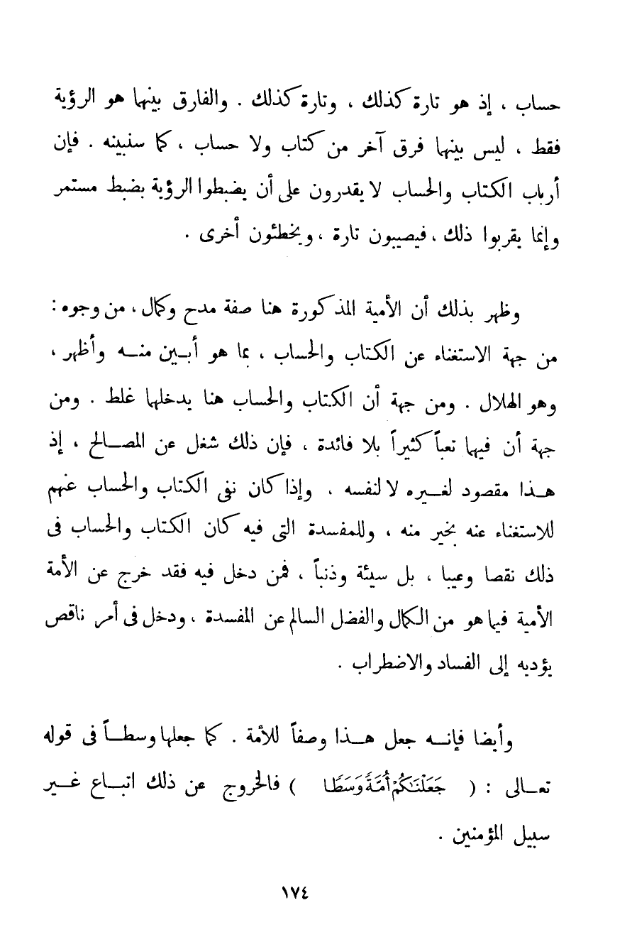 حِسَابٍ إذْ هُوَ تَارَةً كَذَلِكَ وَتَارَةً كَذَلِكَ. وَالْفَارِقُ بَيْنَهُمَا هُوَ الرُّؤْيَةُ فَقَطْ لَيْسَ بَيْنَهَا فَرْقٌ آخَرُ مِنْ كِتَابٍ وَلَا حِسَابٍ كَمَا سَنُبَيِّنُهُ. فَإِنَّ أَرْبَابَ الْكِتَابِ وَالْحِسَابِ لَا يَقْدِرُونَ عَلَى أَنْ يَضْبُطُوا الرُّؤْيَةَ بِضَبْطِ مُسْتَمِرٍّ وَإِنَّمَا يُقَرِّبُوا ذَلِكَ فَيُصِيبُونَ تَارَةً وَيُخْطِئُونَ أُخْرَى. وَظَهَرَ بِذَلِكَ أَنَّ الْأُمِّيَّةَ الْمَذْكُورَةَ هُنَا صِفَةُ مَدْحٍ وَكَمَالٍ مِنْ وُجُوهٍ: مِنْ جِهَةِ الِاسْتِغْنَاءِ عَنْ الْكِتَابِ وَالْحِسَابِ بِمَا هُوَ أَبْيَنُ مِنْهُ وَأَظْهَرُ وَهُوَ الْهِلَالُ. وَمِنْ جِهَةِ أَنَّ الْكِتَابَ وَالْحِسَابَ هُنَا يَدْخُلُهُمَا غَلَطٌ. وَمِنْ جِهَةِ أَنَّ فِيهِمَا تَعَبًا كَثِيرًا بِلَا فَائِدَةٍ فَإِنَّ ذَلِكَ شُغْلٌ عَنْ الْمَصَالِحِ إذْ هَذَا مَقْصُودٌ لِغَيْرِهِ لَا لِنَفْسِهِ وَإِذَا كَانَ نَفْيُ الْكِتَابِ وَالْحِسَابِ عَنْهُمْ لِلِاسْتِغْنَاءِ عَنْهُ بِخَيْرٍ مِنْهُ وَلِلْمَفْسَدَةِ الَّتِي فِيهِ كَانَ الْكِتَابُ وَالْحِسَابُ فِي ذَلِكَ نَقْصًا وَعَيْبًا بَلْ سَيِّئَةً وَذَنْبًا فَمَنْ دَخَلَ فِيهِ فَقَدْ خَرَجَ عَنْ الْأُمَّةِ الْأُمِّيَّةِ فِيمَا هُوَ مِنْ الْكَمَالِ وَالْفَضْلِ السَّالِمِ عَنْ الْمَفْسَدَةِ وَدَخَلَ فِي أَمْرٍ نَاقِصٍ يُؤَدِّيهِ إلَى الْفَسَادِ وَالِاضْطِرَابِ. وَأَيْضًا فَإِنَّهُ جَعَلَ هَذَا وَصْفًا لِلْأُمَّةِ. كَمَا جَعَلَهَا وَسَطًا فِي قَوْله تَعَالَى {جَعَلْنَاكُمْ أُمَّةً وَسَطًا} فَالْخُرُوجُ عَنْ ذَلِكَ اتِّبَاعُ غَيْرِ سَبِيلِ الْمُؤْمِنِينَ.