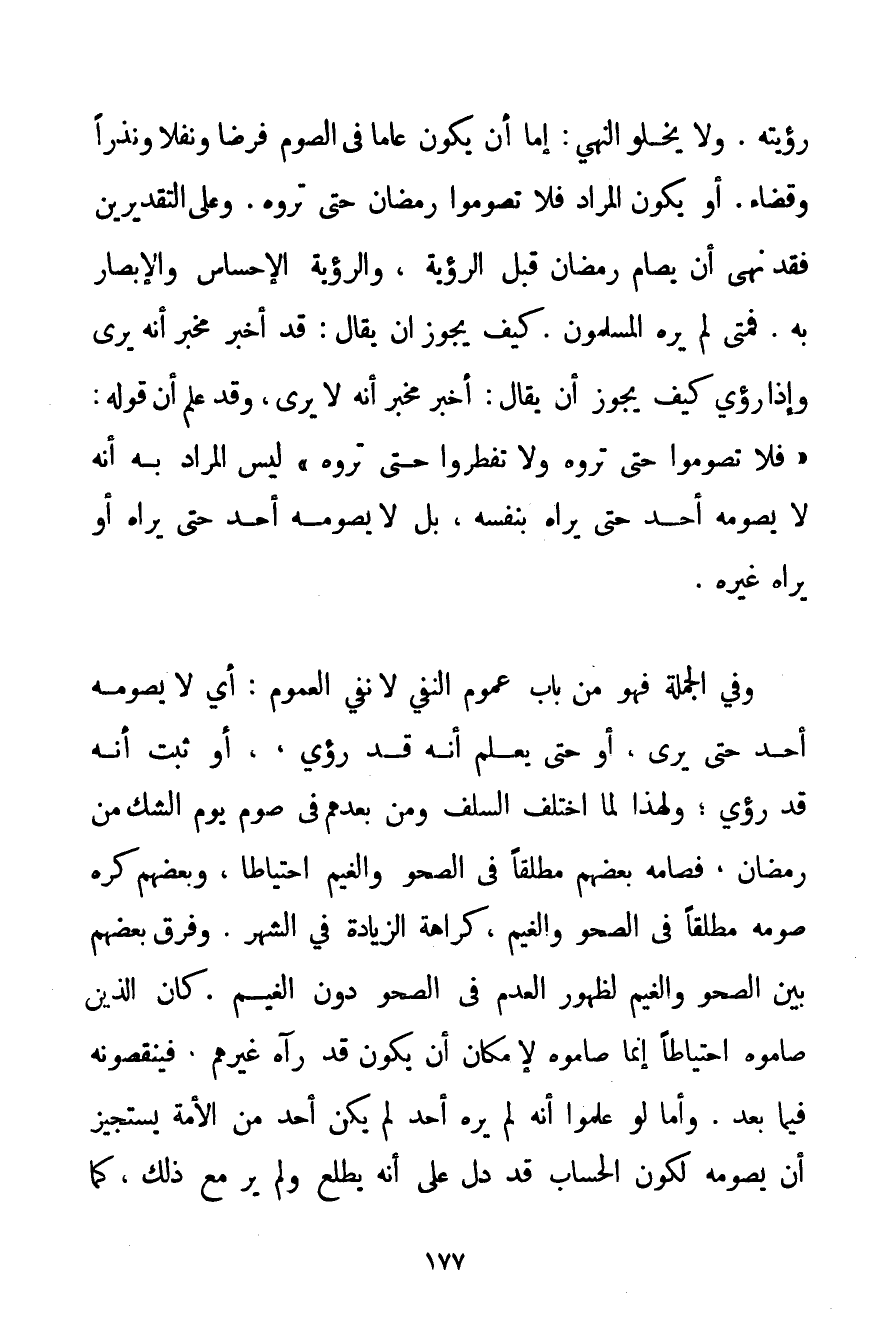 رُؤْيَتِهِ. وَلَا يَخْلُو النَّهْيُ: إمَّا أَنْ يَكُونَ عَامًّا فِي الصَّوْمِ فَرْضًا وَنَفْلًا وَنَذْرًا وَقَضَاءً. أَوْ يَكُونَ الْمُرَادُ فَلَا تَصُومُوا رَمَضَانَ حَتَّى تَرَوْهُ. وَعَلَى التَّقْدِيرَيْنِ فَقَدْ نَهَى أَنْ يُصَامُ رَمَضَانُ قَبْلَ الرُّؤْيَةِ وَالرُّؤْيَةُ الْإِحْسَاسُ وَالْإِبْصَارُ بِهِ. فَمَتَى لَمْ يَرَهُ الْمُسْلِمُونَ. كَيْفَ يَجُوزُ أَنْ يُقَالَ: قَدْ أَخْبَرَ مُخْبِرٌ أَنَّهُ يُرَى وَإِذَا رُئِيَ كَيْفَ يَجُوزُ أَنْ يُقَالَ: أَخْبَرَ مُخْبَرٌ أَنَّهُ لَا يُرَى وَقَدْ عُلِمَ أَنَّ قَوْلَهُ: {فَلَا تَصُومُوا حَتَّى تَرَوْهُ وَلَا تُفْطِرُوا حَتَّى تَرَوْهُ} لَيْسَ الْمُرَادُ بِهِ أَنَّهُ لَا يَصُومُهُ أَحَدٌ حَتَّى يَرَاهُ بِنَفْسِهِ بَلْ لَا يَصُومُهُ أَحَدٌ حَتَّى يَرَاهُ أَوْ يَرَاهُ غَيْرُهُ. وَفِي الْجُمْلَةِ فَهُوَ مِنْ بَابِ عُمُومِ النَّفْيِ لَا نَفْيِ الْعُمُومِ: أَيْ لَا يَصُومُهُ أَحَدٌ حَتَّى يَرَى أَوْ حَتَّى يَعْلَمَ أَنَّهُ قَدْ رُئِيَ أَوْ ثَبَتَ أَنَّهُ قَدْ رُئِيَ؛ وَلِهَذَا لَمَّا اخْتَلَفَ السَّلَفُ وَمَنْ بَعْدَهُمْ فِي صَوْمِ يَوْمِ الشَّكِّ مِنْ رَمَضَانَ فَصَامَهُ بَعْضُهُمْ مُطْلَقًا فِي الصَّحْوِ وَالْغَيْمِ احْتِيَاطًا وَبَعْضُهُمْ كَرِهَ صَوْمَهُ مُطْلَقًا فِي الصَّحْوِ وَالْغَيْمِ كَرَاهَةَ الزِّيَادَةِ فِي الشَّهْرِ. وَفَرَّقَ بَعْضُهُمْ بَيْنَ الصَّحْوِ وَالْغَيْمِ لِظُهُورِ الْعَدَمِ فِي الصَّحْوِ دُونَ الْغَيْمِ. كَانَ الَّذِي صَامُوهُ احْتِيَاطًا إنَّمَا صَامُوهُ لِإِمْكَانِ أَنْ يَكُونَ قَدْ رَآهُ غَيْرُهُمْ. فَيَنْقُصُونَهُ فِيمَا بَعْدُ. وَأَمَّا لَوْ عَلِمُوا أَنَّهُ لَمْ يَرَهُ أَحَدٌ لَمْ يَكُنْ أَحَدٌ مِنْ الْأُمَّةِ يَسْتَجِيزُ أَنْ يَصُومَهُ لِكَوْنِ الْحِسَابِ قَدْ دَلَّ عَلَى أَنَّهُ يَطْلُعُ وَلَمْ يُرَ مَعَ ذَلِكَ كَمَا