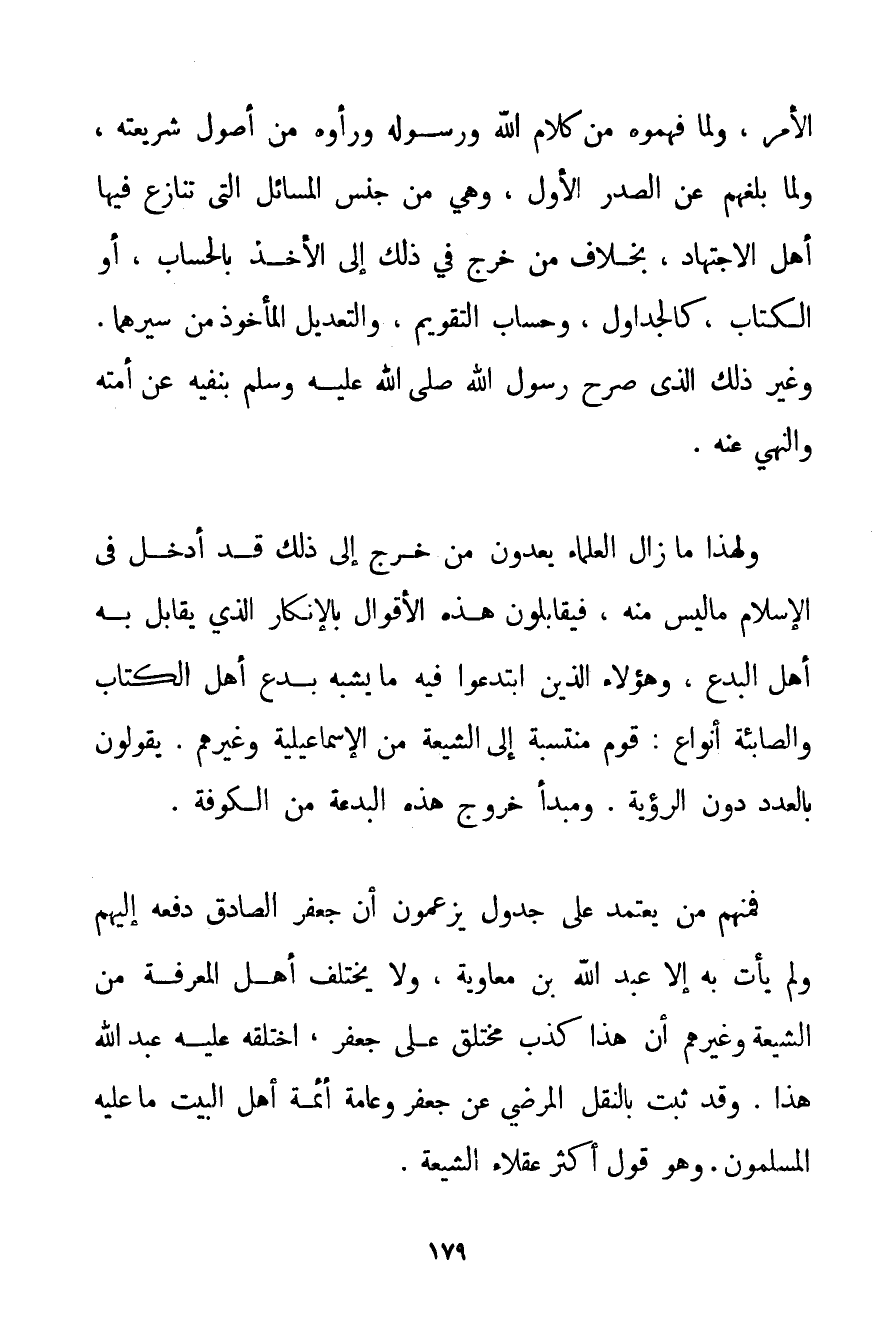 الْأَمْرِ وَلِمَا فَهِمُوهُ مِنْ كَلَامِ اللَّهِ وَرَسُولِهِ وَرَأَوْهُ مِنْ أُصُولِ شَرِيعَتِهِ وَلِمَا بَلَغَهُمْ عَنْ الصَّدْرِ الْأَوَّلِ وَهِيَ مَنْ جِنْسِ الْمَسَائِلِ الَّتِي تَنَازَعَ فِيهَا أَهْلُ الِاجْتِهَادِ بِخِلَافِ مَنْ خَرَجَ فِي ذَلِكَ إلَى الْأَخْذِ بِالْحِسَابِ أَوْ الْكِتَابِ كَالْجَدَاوِلِ وَحِسَابِ التَّقْوِيمِ وَالتَّعْدِيلِ الْمَأْخُوذِ مَنْ سَيْرِهِمَا. وَغَيْرِ ذَلِكَ الَّذِي صَرَّحَ رَسُولُ اللَّهِ صَلَّى اللَّهُ عَلَيْهِ وَسَلَّمَ بِنَفْيِهِ عَنْ أُمَّتِهِ وَالنَّهْيِ عَنْهُ. وَلِهَذَا مَا زَالَ الْعُلَمَاءُ يَعُدُّونَ مَنْ خَرَجَ إلَى ذَلِكَ قَدْ أَدْخَلَ فِي الْإِسْلَامِ مَا لَيْسَ مِنْهُ فَيُقَابِلُونَ هَذِهِ الْأَقْوَالَ بِالْإِنْكَارِ الَّذِي يُقَابَلُ بِهِ أَهْلُ الْبِدَعِ وَهَؤُلَاءِ الَّذِينَ ابْتَدَعُوا فِيهِ مَا يُشْبِهُ بِدَعَ أَهْلِ الْكِتَابِ وَالصَّابِئَةِ أَنْوَاعٌ: قَوْمٌ مُنْتَسِبَةٌ إلَى الشِّيعَةِ مِنْ الْإِسْمَاعِيلِيَّة وَغَيْرِهِمْ. يَقُولُونَ بِالْعَدَدِ دُونَ الرُّؤْيَةِ. وَمَبْدَأُ خُرُوجِ هَذِهِ الْبِدْعَةِ مِنْ الْكُوفَةِ. فَمِنْهُمْ مَنْ يَعْتَمِدُ عَلَى جَدْوَلٍ يَزْعُمُونَ أَنَّ جَعْفَرًا الصَّادِقَ دَفَعَهُ إلَيْهِمْ وَلَمْ يَأْتِ بِهِ إلَّا عَبْدُ اللَّهِ بْنُ مُعَاوِيَةَ وَلَا يَخْتَلِفُ أَهْلُ الْمَعْرِفَةِ مِنْ الشِّيعَةِ وَغَيْرِهِمْ أَنَّ هَذَا كَذِبٌ مُخْتَلَقٌ عَلَى جَعْفَرٍ اخْتَلَقَهُ عَلَيْهِ عَبْدُ اللَّهِ هَذَا. وَقَدْ ثَبَتَ بِالنَّقْلِ الْمَرْضِيِّ عَنْ جَعْفَرٍ وَعَامَّةِ أَئِمَّةِ أَهْلِ الْبَيْتِ مَا عَلَيْهِ الْمُسْلِمُونَ. وَهُوَ قَوْلُ أَكْثَرِ عُقَلَاءَ الشِّيعَةِ.