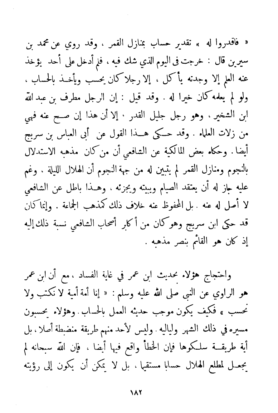 {فَاقْدُرُوا لَهُ} تَقْدِيرُ حِسَابٍ بِمَنَازِلِ الْقَمَرِ وَقَدْ رُوِيَ عَنْ مُحَمَّدِ بْنِ سِيرِين قَالَ: خَرَجْت فِي الْيَوْمِ الَّذِي شُكَّ فِيهِ فَلَمْ أَدْخُلْ عَلَى أَحَدٍ يُؤْخَذُ عَنْهُ الْعِلْمُ إلَّا وَجَدْته يَأْكُلُ إلَّا رَجُلًا كَانَ يَحْسُبُ وَيَأْخُذُ بِالْحِسَابِ وَلَوْ لَمْ يَعْلَمْهُ كَانَ خَيْرًا لَهُ. وَقَدْ قِيلَ: إنَّ الرَّجُلَ مُطَرِّفُ بْنُ عَبْدِ اللَّهِ بْنِ الشخير وَهُوَ رَجُلٌ جَلِيلُ الْقَدْرِ إلَّا أَنَّ هَذَا إنْ صَحَّ عَنْهُ فَهِيَ مِنْ زَلَّاتِ الْعُلَمَاءِ. وَقَدْ حُكِيَ هَذَا الْقَوْلُ عَنْ أَبِي الْعَبَّاسِ بْنِ سُرَيْجٍ أَيْضًا. وَحَكَاهُ بَعْضُ الْمَالِكِيَّةِ عَنْ الشَّافِعِيِّ أَنَّ مَنْ كَانَ مَذْهَبُهُ الِاسْتِدْلَالَ بِالنُّجُومِ وَمَنَازِلِ الْقَمَرِ لَمْ يَتَبَيَّنْ لَهُ مِنْ جِهَةِ النُّجُومِ أَنَّ الْهِلَالَ اللَّيْلَةَ وَغُمَّ عَلَيْهِ جَازَ لَهُ أَنْ يَعْتَقِدَ الصِّيَامَ وَيُبَيِّتَهُ وَيُجْزِئُهُ وَهَذَا بَاطِلٌ عَنْ الشَّافِعِيِّ لَا أَصْلَ لَهُ عَنْهُ. بَلْ الْمَحْفُوظُ عَنْهُ خِلَافُ ذَلِكَ كَمَذْهَبِ الْجَمَاعَةِ. وَإِنَّمَا كَانَ قَدْ حَكَى ابْنُ سُرَيْجٍ وَهُوَ كَانَ مِنْ أَكَابِرِ أَصْحَابِ الشَّافِعِيِّ نِسْبَةَ ذَلِكَ إلَيْهِ إذْ كَانَ هُوَ الْقَائِمَ بِنَصْرِ مَذْهَبِهِ. وَاحْتِجَاجُ هَؤُلَاءِ بِحَدِيثِ ابْنِ عُمَرَ فِي غَايَةِ الْفَسَادِ مَعَ أَنَّ ابْنَ عُمَرَ هُوَ الرَّاوِي عَنْ النَّبِيِّ صَلَّى اللَّهُ عَلَيْهِ وَسَلَّمَ {إنَّا أُمَّةٌ أُمِّيَّةٌ لَا نَكْتُبُ وَلَا نَحْسُبُ} فَكَيْفَ يَكُونُ مُوجَبُ حَدِيثِهِ الْعَمَلَ بِالْحِسَابِ. وَهَؤُلَاءِ يَحْسَبُونَ مَسِيرَهُ فِي ذَلِكَ الشَّهْرِ وَلَيَالِيُهُ. وَلَيْسَ لِأَحَدٍ مِنْهُمْ طَرِيقَةٌ مُنْضَبِطَةٌ أَصْلًا بَلْ أَيَّةُ طَرِيقَةٍ سَلَكُوهَا فَإِنَّ الْخَطَأَ وَاقِعٌ فِيهَا أَيْضًا فَإِنَّ اللَّهَ سُبْحَانَهُ لَمْ يَجْعَلْ لِمَطْلَعِ الْهِلَالِ حِسَابًا مُسْتَقِيمًا بَلْ لَا يُمْكِنُ أَنْ يَكُونَ إلَى رُؤْيَتِهِ