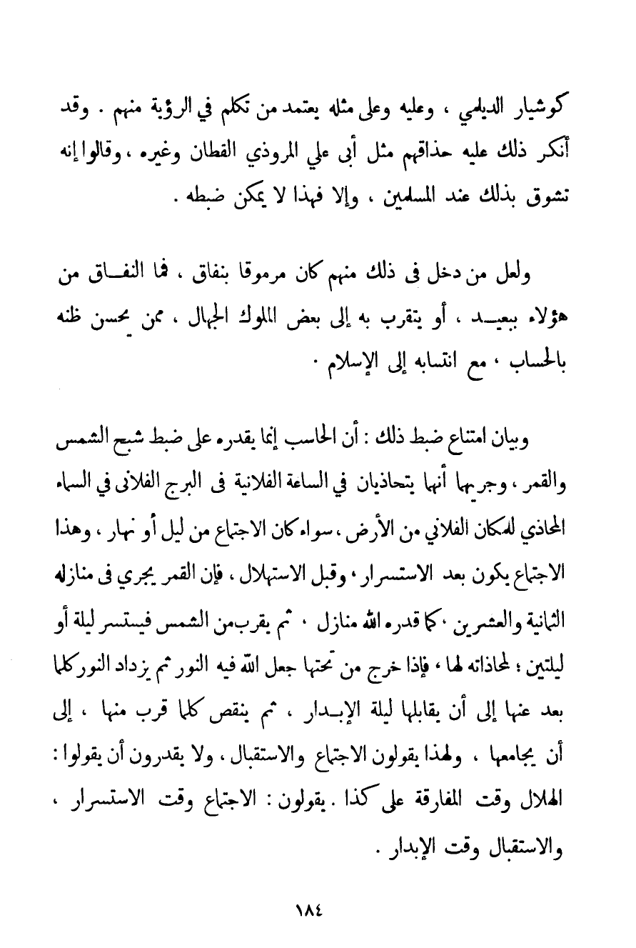 كوشيار الديلمي وَعَلَيْهِ وَعَلَى مِثْلُهُ يَعْتَمِدُ مَنْ تَكَلَّمَ فِي الرُّؤْيَةِ مِنْهُمْ. وَقَدْ أَنْكَرَ ذَلِكَ عَلَيْهِ حُذَّاقُهُمْ مِثْلُ أَبِي عَلِيٍّ المروذي الْقَطَّانِ وَغَيْرِهِ وَقَالُوا إنَّهُ تَشَوَّقَ بِذَلِكَ عِنْدَ الْمُسْلِمِينَ وَإِلَّا فَهَذَا لَا يُمْكِنُ ضَبْطُهُ. وَلَعَلَّ مَنْ دَخَلَ فِي ذَلِكَ مِنْهُمْ كَانَ مَرْمُوقًا بِنِفَاقٍ، فَمَا النِّفَاقُ مِنْ هَؤُلَاءِ بِبَعِيدِ أَوْ يَتَقَرَّبُ بِهِ إلَى بَعْضِ الْمُلُوكِ الْجُهَّالِ مِمَّنْ يُحْسِنُ ظَنَّهُ بِالْحِسَابِ مَعَ انْتِسَابِهِ إلَى الْإِسْلَامِ. وَبَيَانُ امْتِنَاعِ ضَبْطِ ذَلِكَ: أَنَّ الْحِسَابَ إنَّمَا يُقَدِّرُهُ عَلَى ضَبْطِ شَبَحِ الشَّمْسِ وَالْقَمَرِ وَجَرْيِهِمَا أَنَّهُمَا يَتَحَاذَيَانِ فِي السَّاعَةِ الْفُلَانِيَّةِ فِي الْبُرْجِ الْفُلَانِيِّ فِي السَّمَاءِ الْمُحَاذِي لِلْمَكَانِ الْفُلَانِيِّ مِنْ الْأَرْضِ سَوَاءٌ كَانَ الِاجْتِمَاعُ مِنْ لَيْلٍ أَوْ نَهَارٍ وَهَذَا الِاجْتِمَاعُ يَكُونُ بَعْدَ الِاسْتِسْرَارِ وَقَبْلَ الِاسْتِهْلَالِ فَإِنَّ الْقَمَرَ يَجْرِي فِي مَنَازِلِهِ الثَّمَانِيَةِ وَالْعِشْرِينَ كَمَا قَدَّرَهُ اللَّهُ مَنَازِلَ ثُمَّ يَقْرُبُ مِنْ الشَّمْسِ فَيَسْتَسِرُّ لَيْلَةً أَوْ لَيْلَتَيْنِ؛ لِمُحَاذَاتِهِ لَهَا فَإِذَا خَرَجَ مِنْ تَحْتِهَا جَعَلَ اللَّهُ فِيهِ النُّورَ ثُمَّ يَزْدَادُ النُّورُ كُلَّمَا بَعُدَ عَنْهَا إلَى أَنْ يُقَابِلَهَا لَيْلَةَ الْإِبْدَارِ ثُمَّ يَنْقُصُ كُلَّمَا قَرُبَ مِنْهَا إلَى أَنْ يُجَامِعَهَا وَلِهَذَا يَقُولُونَ الِاجْتِمَاعُ وَالِاسْتِقْبَالُ وَلَا يَقْدِرُونَ أَنْ يَقُولُوا: الْهِلَالُ وَقْتَ الْمُفَارَقَةِ عَلَى كَذَا. يَقُولُونَ: الِاجْتِمَاعُ وَقْتَ الِاسْتِسْرَارِ وَالِاسْتِقْبَالُ وَقْتَ الْإِبْدَارِ.