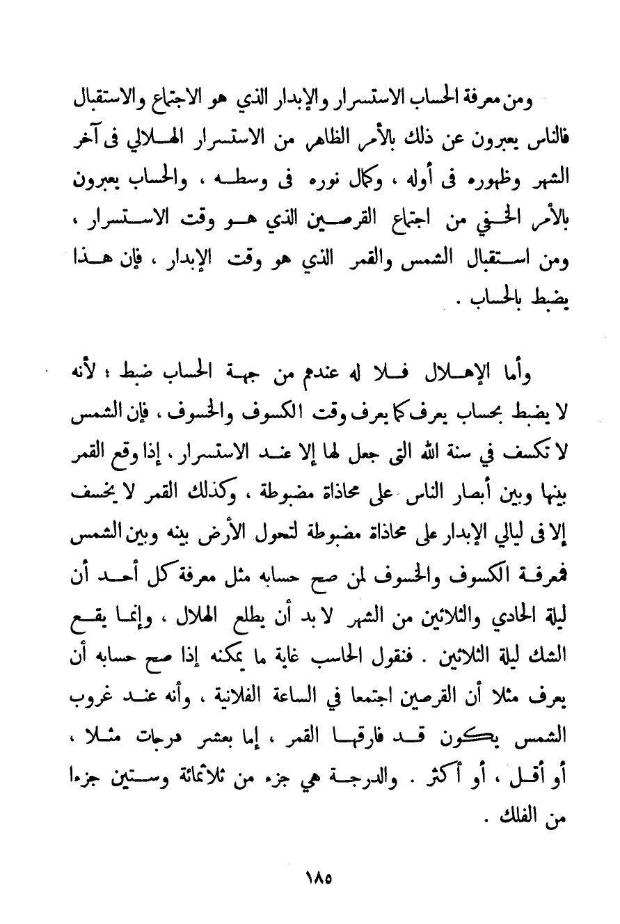 وَمِنْ مَعْرِفَةِ الْحِسَابِ الِاسْتِسْرَارُ وَالْإِبْدَارُ الَّذِي هُوَ الِاجْتِمَاعُ وَالِاسْتِقْبَالُ فَالنَّاسُ يُعَبِّرُونَ عَنْ ذَلِكَ بِالْأَمْرِ الظَّاهِرِ مِنْ الِاسْتِسْرَارِ الْهِلَالِيِّ فِي آخِرِ الشَّهْرِ وَظُهُورِهِ فِي أَوَّلِهِ وَكَمَالِ نُورِهِ فِي وَسَطِهِ والحساب يُعَبِّرُونَ بِالْأَمْرِ الْخَفِيِّ مِنْ اجْتِمَاعِ الْقُرْصَيْنِ الَّذِي هُوَ وَقْتُ الِاسْتِسْرَارِ وَمِنْ اسْتِقْبَالِ الشَّمْسِ وَالْقَمَرِ الَّذِي هُوَ وَقْتُ الْإِبْدَارِ فَإِنَّ هَذَا يُضْبَطُ بِالْحِسَابِ. وَأَمَّا الْإِهْلَالُ فَلَا لَهُ عِنْدَهُمْ مِنْ جِهَةِ الْحِسَابِ ضَبْطٌ؛ لِأَنَّهُ لَا يُضْبَطُ بِحِسَابٍ يُعْرَفُ كَمَا يُعْرَفُ وَقْتُ الْكُسُوفِ وَالْخُسُوفِ فَإِنَّ الشَّمْسَ لَا تَكْسِفُ فِي سُنَّةِ اللَّهِ الَّتِي جَعَلَ لَهَا إلَّا عِنْدَ الِاسْتِسْرَارِ إذَا وَقَعَ الْقَمَرُ بَيْنَهَا وَبَيْنَ أَبْصَارِ النَّاسِ عَلَى مُحَاذَاةٍ مَضْبُوطَةٍ وَكَذَلِكَ الْقَمَرُ لَا يَخْسِفُ إلَّا فِي لَيَالِي الْإِبْدَارِ عَلَى مُحَاذَاةٍ مَضْبُوطَةٍ لِتَحَوُّلِ الْأَرْضِ بَيْنَهُ وَبَيْنَ الشَّمْسِ فَمَعْرِفَةُ الْكُسُوفِ وَالْخُسُوفِ لِمَنْ صَحَّ حِسَابُهُ مِثْلُ مَعْرِفَةِ كُلِّ أَحَدٍ أَنَّ لَيْلَةَ الْحَادِيَ وَالثَّلَاثِينَ مِنْ الشَّهْرِ لَا بُدَّ أَنْ يَطْلُعَ الْهِلَالُ وَإِنَّمَا يَقَعُ الشَّكُّ لَيْلَةَ الثَّلَاثِينَ. فَنَقُولُ الْحَاسِبُ غَايَةُ مَا يُمْكِنُهُ إذَا صَحَّ حِسَابُهُ أَنْ يَعْرِفَ مَثَلًا أَنَّ الْقُرْصَيْنِ اجْتَمَعَا فِي السَّاعَةِ الْفُلَانِيَّةِ وَأَنَّهُ عِنْدَ غُرُوبِ الشَّمْسِ يَكُونُ قَدْ فَارَقَهَا الْقَمَرُ إمَّا بِعَشْرِ دَرَجَاتٍ مَثَلًا أَوْ أَقَلَّ أَوْ أَكْثَرَ. وَالدَّرَجَةُ هِيَ جُزْءٌ مِنْ ثَلَاثِمِائَةٍ وَسِتِّينَ جُزْءًا مِنْ الْفَلَكِ.