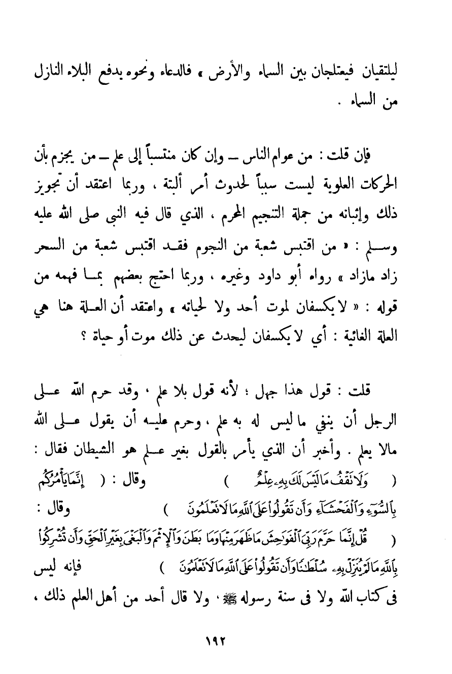 لَيَلْتَقِيَانِ فَيَعْتَلِجَانِ بَيْنَ السَّمَاءِ وَالْأَرْضِ} فَالدُّعَاءُ وَنَحْوُهُ يَدْفَعُ الْبَلَاءَ النَّازِلَ مِنْ السَّمَاءِ. فَإِنْ قُلْت: مِنْ عَوَامِّ النَّاسِ - وَإِنْ كَانَ مُنْتَسِبًا إلَى عِلْمِ - مَنْ يَجْزِمُ بِأَنَّ الْحَرَكَاتِ الْعُلْوِيَّةَ لَيْسَتْ سَبَبًا لِحُدُوثِ أَمْرٍ أَلْبَتَّةَ وَرُبَّمَا اعْتَقَدَ أَنَّ تَجْوِيزَ ذَلِكَ وَإِثْبَاتَهُ مِنْ جُمْلَةِ التَّنْجِيمِ الْمُحَرَّمِ الَّذِي قَالَ فِيهِ النَّبِيُّ صَلَّى اللَّهُ عَلَيْهِ وَسَلَّمَ {مَنْ اقْتَبَسَ شُعْبَةً مِنْ النُّجُومِ فَقَدْ اقْتَبَسَ شُعْبَةً مِنْ السِّحْرِ زَادَ مَا زَادَ} رَوَاهُ أَبُو دَاوُد وَغَيْرُهُ وَرُبَّمَا احْتَجَّ بَعْضُهُمْ بِمَا فَهِمَهُ مِنْ قَوْلِهِ: {لَا يَكْسِفَانِ لِمَوْتِ أَحَدٍ وَلَا لِحَيَاتِهِ} وَاعْتَقَدَ أَنَّ الْعِلَّةَ هُنَا هِيَ الْعِلَّةُ الغائية: أَيْ لَا يَكْسِفَانِ لِيَحْدُثَ عَنْ ذَلِكَ مَوْتٌ أَوْ حَيَاةٌ؟ قُلْت: قَوْلُ هَذَا جَهْلٌ؛ لِأَنَّهُ قَوْلٌ بِلَا عِلْمٍ وَقَدْ حَرَّمَ اللَّهُ عَلَى الرَّجُلِ أَنْ يَنْفِيَ مَا لَيْسَ لَهُ بِهِ عِلْمٌ وَحَرَّمَ عَلَيْهِ أَنْ يَقُولَ عَلَى اللَّهِ مَا لَا يَعْلَمُ. وَأَخْبَرَ أَنَّ الَّذِي يَأْمُرُ بِالْقَوْلِ بِغَيْرِ عِلْمٍ هُوَ الشَّيْطَانُ فَقَالَ: {وَلَا تَقْفُ مَا لَيْسَ لَكَ بِهِ عِلْمٌ} وَقَالَ: {إنَّمَا يَأْمُرُكُمْ بِالسُّوءِ وَالْفَحْشَاءِ وَأَنْ تَقُولُوا عَلَى اللَّهِ مَا لَا تَعْلَمُونَ} وَقَالَ: {قُلْ إنَّمَا حَرَّمَ رَبِّيَ الْفَوَاحِشَ مَا ظَهَرَ مِنْهَا وَمَا بَطَنَ وَالْإِثْمَ وَالْبَغْيَ بِغَيْرِ الْحَقِّ وَأَنْ تُشْرِكُوا بِاللَّهِ مَا لَمْ يُنَزِّلْ بِهِ سُلْطَانًا وَأَنْ تَقُولُوا عَلَى اللَّهِ مَا لَا تَعْلَمُونَ} فَإِنَّهُ لَيْسَ فِي كِتَابِ اللَّهِ وَلَا فِي سُنَّةِ رَسُولِهِ وَلَا قَالَ أَحَدٌ مِنْ أَهْلِ الْعِلْمِ ذَلِكَ