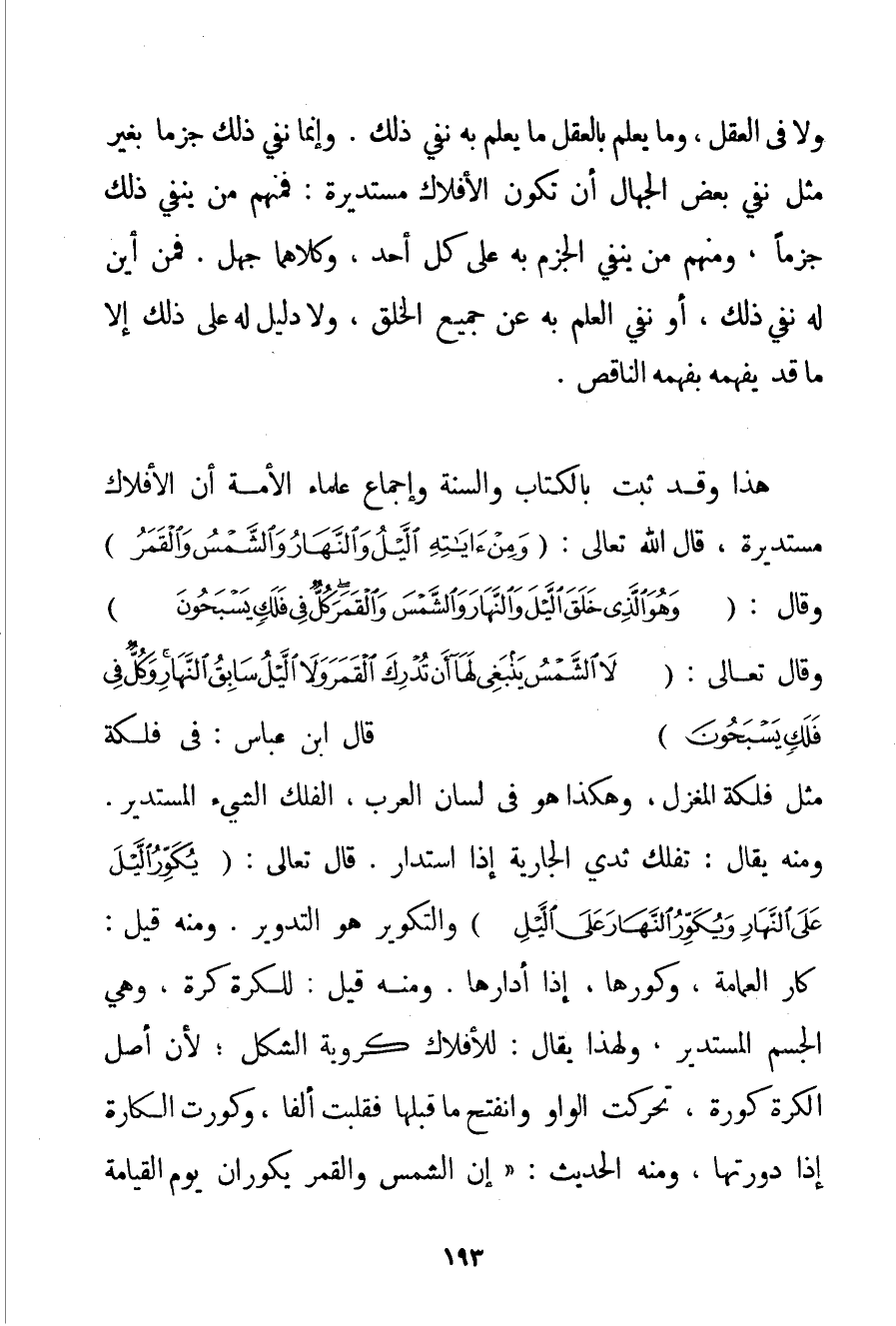 وَلَا فِي الْعَقْلِ وَمَا يُعْلَمُ بِالْعَقْلِ مَا يُعْلَمُ بِهِ نَفْيُ ذَلِكَ. وَإِنَّمَا نَفْيُ ذَلِكَ جَزْمًا بِغَيْرِ مِثْلُ نَفْيِ بَعْضِ الْجُهَّالِ أَنْ تَكُونَ الْأَفْلَاكُ مُسْتَدِيرَةً: فَمِنْهُمْ مَنْ يَنْفِي ذَلِكَ جَزْمًا وَمِنْهُمْ مَنْ يَنْفِي الْجَزْمَ بِهِ عَلَى كُلِّ أَحَدٍ وَكِلَاهُمَا جَهْلٌ. فَمِنْ أَيْنَ لَهُ نَفْيُ ذَلِكَ أَوْ نَفْيُ الْعَامِّ بِهِ عَنْ جَمِيعِ الْخَلْقِ وَلَا دَلِيلَ لَهُ عَلَى ذَلِكَ إلَّا مَا قَدْ يَفْهَمُهُ بِفَهْمِهِ النَّاقِصِ. هَذَا وَقَدْ ثَبَتَ بِالْكِتَابِ وَالسُّنَّةِ وَإِجْمَاعِ عُلَمَاءِ الْأُمَّةِ أَنَّ الْأَفْلَاكَ مُسْتَدِيرَةٌ قَالَ اللَّهُ تَعَالَى: {وَمِنْ آيَاتِهِ اللَّيْلُ وَالنَّهَارُ وَالشَّمْسُ وَالْقَمَرُ} وَقَالَ: {وَهُوَ الَّذِي خَلَقَ اللَّيْلَ وَالنَّهَارَ وَالشَّمْسَ وَالْقَمَرَ كُلٌّ فِي فَلَكٍ يَسْبَحُونَ} وَقَالَ تَعَالَى: {لَا الشَّمْسُ يَنْبَغِي لَهَا أَنْ تُدْرِكَ الْقَمَرَ وَلَا اللَّيْلُ سَابِقُ النَّهَارِ وَكُلٌّ فِي فَلَكٍ يَسْبَحُونَ} قَالَ ابْنِ عَبَّاسٍ: فِي فَلْكَةٍ مِثْلِ فَلْكَةِ الْمِغْزَلِ وَهَكَذَا هُوَ فِي لِسَانِ الْعَرَبِ الْفَلَكُ الشَّيْءُ الْمُسْتَدِيرُ. وَمِنْهُ يُقَالُ: تَفَلَّكَ ثَدْيُ الْجَارِيَةِ إذَا اسْتَدَارَ. قَالَ تَعَالَى: {يُكَوِّرُ اللَّيْلَ عَلَى النَّهَارِ وَيُكَوِّرُ النَّهَارَ عَلَى اللَّيْلِ} وَالتَّكْوِيرُ هُوَ التَّدْوِيرُ. وَمِنْهُ قِيلَ: كَارَ الْعِمَامَةَ وَكَوَّرَهَا إذَا أَدَارَهَا. وَمِنْهُ قِيلَ: لِلْكُرَةِ كُرَةٌ وَهِيَ الْجِسْمُ الْمُسْتَدِيرُ وَلِهَذَا يُقَالُ: لِلْأَفْلَاكِ كُرَوِيَّةُ الشَّكْلِ؛ لِأَنَّ أَصْلَ الْكُرَةِ كورة تَحَرَّكَتْ الْوَاوُ وَانْفَتَحَ مَا قَبْلَهَا فَقُلِبَتْ أَلِفًا وَكَوَّرْت الْكَارَةَ إذَا دَوَّرْتهَا وَمِنْهُ الْحَدِيثُ: {إنَّ الشَّمْسَ وَالْقَمَرَ يُكَوَّرَانِ يَوْمَ الْقِيَامَةِ