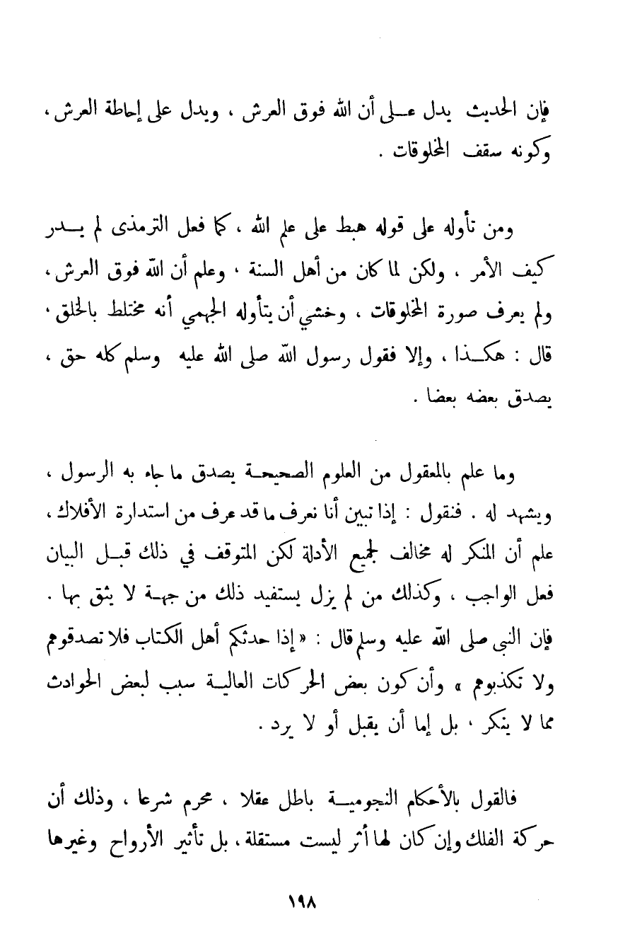 فَإِنَّ الْحَدِيثَ يَدُلُّ عَلَى أَنَّ اللَّهَ فَوْقَ الْعَرْشِ وَيَدُلُّ عَلَى إحَاطَةِ الْعَرْشِ كَوْنُهُ سَقْفَ الْمَخْلُوقَاتِ. وَمَنْ تَأَوَّلَهُ عَلَى قَوْلِهِ هَبَطَ عَلَى عِلْمِ اللَّهِ كَمَا فَعَلَ التِّرْمِذِيُّ لَمْ يَدْرِ كَيْفَ الْأَمْرُ وَلَكِنْ لَمَّا كَانَ مِنْ أَهْلِ السُّنَّةِ وَعَلِمَ أَنَّ اللَّهَ فَوْقَ الْعَرْشِ وَلَمْ يَعْرِفْ صُورَةَ الْمَخْلُوقَاتِ وَخَشِيَ أَنْ يَتَأَوَّلهُ الجهمي أَنَّهُ مُخْتَلِطٌ بِالْخَلْقِ قَالَ: هَكَذَا وَإِلَّا فَقَوْلُ رَسُولِ اللَّهِ صَلَّى اللَّهُ عَلَيْهِ وَسَلَّمَ كُلُّهُ حَقٌّ يُصَدِّقُ بَعْضُهُ بَعْضًا. وَمَا عُلِمَ بِالْمَعْقُولِ مِنْ الْعُلُومِ الصَّحِيحَةِ يُصَدِّقُ مَا جَاءَ بِهِ الرَّسُولُ وَيَشْهَدُ لَهُ. فَنَقُولُ: إذَا تَبَيَّنَ أَنَّا نَعْرِفُ مَا قَدْ عُرِفَ مِنْ اسْتِدَارَةِ الْأَفْلَاكِ عُلِمَ أَنَّ الْمُنْكِرَ لَهُ مُخَالِفٌ لِجَمِيعِ الْأَدِلَّةِ لَكِنْ الْمُتَوَقِّفُ فِي ذَلِكَ قَبْلَ الْبَيَانِ فَعَلَ الْوَاجِبَ وَكَذَلِكَ مَنْ لَمْ يَزَلْ يَسْتَفِيدُ ذَلِكَ مِنْ جِهَةٍ لَا يَثِقُ بِهَا. فَإِنَّ النَّبِيَّ صَلَّى اللَّهُ عَلَيْهِ وَسَلَّمَ قَالَ: {إذَا حَدَّثَكُمْ أَهْلُ الْكِتَابِ فَلَا تُصَدِّقُوهُمْ وَلَا تُكَذِّبُوهُمْ} وَأَنَّ كَوْنَ بَعْضِ الْحَرَكَاتِ الْعَالِيَةِ سَبَبٌ لِبَعْضِ الْحَوَادِثِ مِمَّا لَا يُنْكَرُ بَلْ إمَّا أَنْ يُقْبَلَ أَوْ لَا يُرَدَّ. فَالْقَوْلُ بِالْأَحْكَامِ النُّجُومِيَّةُ بَاطِلٌ عَقْلًا مُحَرَّمٌ شَرْعًا وَذَلِكَ أَنَّ حَرَكَةَ الْفَلَكِ وَإِنْ كَانَ لَهَا أَثَرٌ لَيْسَتْ مُسْتَقِلَّةً بَلْ تَأْثِيرُ الْأَرْوَاحِ وَغَيْرِهَا