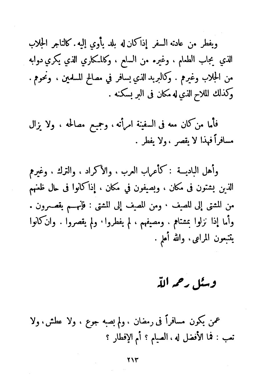 وَيُفْطِرُ مَنْ عَادَتُهُ السَّفَرُ إذَا كَانَ لَهُ بَلَدٌ يَأْوِي إلَيْهِ. كَالتَّاجِرِ الْجَلَّابِ الَّذِي يَجْلِبُ الطَّعَامَ وَغَيْرَهُ مِنْ السِّلَعِ وَكَالْمُكَارِي الَّذِي يَكْرِي دَوَابَّهُ مِنْ الْجُلَّابِ وَغَيْرِهِمْ. وَكَالْبَرِيدِ الَّذِي يُسَافِرُ فِي مَصَالِحِ الْمُسْلِمِينَ وَنَحْوِهِمْ. وَكَذَلِكَ الْمَلَّاحُ الَّذِي لَهُ مَكَانٌ فِي الْبَرِّ يَسْكُنُهُ. فَأَمَّا مَنْ كَانَ مَعَهُ فِي السَّفِينَةِ امْرَأَتُهُ وَجَمِيعُ مَصَالِحِهِ وَلَا يَزَالُ مُسَافِرًا فَهَذَا لَا يَقْصُرُ وَلَا يُفْطِرُ. وَأَهْلُ الْبَادِيَةِ: كَأَعْرَابِ الْعَرَبِ وَالْأَكْرَادِ وَالتُّرْكِ وَغَيْرِهِمْ الَّذِينَ يُشَتُّونَ فِي مَكَانٍ وَيُصَيِّفُونَ فِي مَكَانٍ إذَا كَانُوا فِي حَالِ ظَعْنِهِمْ مِنْ الْمَشْتَى إلَى الْمَصِيفِ وَمِنْ الْمَصِيفِ إلَى الْمَشْتَى: فَإِنَّهُمْ يَقْصُرُونَ. وَأَمَّا إذَا نَزَلُوا بِمَشْتَاهُمْ وَمَصِيفِهِمْ لَمْ يُفْطِرُوا وَلَمْ يَقْصُرُوا. وَإِنْ كَانُوا يَتَتَبَّعُونَ الْمَرَاعِيَ وَاَللَّهُ أَعْلَمُ.