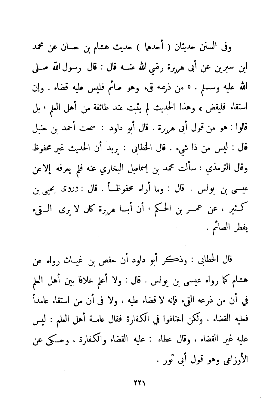 وَفِي السُّنَنِ حَدِيثَانِ: أَحَدُهُمَا حَدِيثُ هِشَامِ بْنِ حَسَّانٍ عَنْ مُحَمَّدِ بْنِ سِيرِين عَنْ أَبِي هُرَيْرَةَ رَضِيَ اللَّهُ عَنْهُ قَالَ: قَالَ رَسُولُ اللَّهِ صَلَّى اللَّهُ عَلَيْهِ وَسَلَّمَ " {مَنْ ذَرَعَهُ قَيْءٌ وَهُوَ صَائِمٌ فَلَيْسَ عَلَيْهِ قَضَاءٌ. وَإِنْ استقاء فَلْيَقْضِ} وَهَذَا الْحَدِيثُ لَمْ يَثْبُتْ عِنْدَ طَائِفَةٍ مِنْ أَهْلِ الْعِلْمِ بَلْ قَالُوا: هُوَ مِنْ قَوْلِ أَبِي هُرَيْرَةَ قَالَ أَبُو دَاوُد: سَمِعْت أَحْمَد بْنُ حَنْبَلٍ قَالَ: لَيْسَ مِنْ ذَا شَيْءٌ. قَالَ الخطابي: يُرِيدُ أَنَّ الْحَدِيثَ غَيْرُ مَحْفُوظٍ وَقَالَ التِّرْمِذِيُّ: سَأَلْت مُحَمَّدَ بْنَ إسْمَاعِيلَ الْبُخَارِيَّ عَنْهُ فَلَمْ يَعْرِفْهُ إلَّا عَنْ عِيسَى بْنِ يُونُسَ قَالَ: وَمَا أَرَاهُ مَحْفُوظًا. قَالَ: وَرَوَى يَحْيَى بْنُ كَثِيرٍ عَنْ عُمَرَ بْنِ الْحَكَمِ أَنَّ أَبَا هُرَيْرَةَ كَانَ لَا يَرَى الْقَيْءَ يُفْطِرُ الصَّائِمَ. قَالَ الْخَطَّابِيَّ: وَذَكَرَ أَبُو دَاوُد أَنَّ حَفْصَ بْنَ غِيَاثٍ رَوَاهُ. عَنْ هِشَامٍ كَمَا رَوَاهُ عِيسَى بْنُ يُونُسَ. قَالَ: وَلَا أَعْلَمُ خِلَافًا بَيْنَ أَهْلِ الْعِلْمِ فِي أَنَّ مَنْ ذَرَعَهُ الْقَيْءُ فَإِنَّهُ لَا قَضَاءَ عَلَيْهِ وَلَا فِي أَنَّ مَنْ استقاء عَامِدًا فَعَلَيْهِ الْقَضَاءُ وَلَكِنْ اخْتَلَفُوا فِي الْكَفَّارَةِ فَقَالَ عَامَّةُ أَهْلِ الْعِلْمِ: لَيْسَ عَلَيْهِ غَيْرُ الْقَضَاءِ وَقَالَ عَطَاءٍ: عَلَيْهِ الْقَضَاءُ وَالْكَفَّارَةُ وَحُكِيَ عَنْ الأوزاعي وَهُوَ قَوْلُ أَبِي ثَوْرٍ.