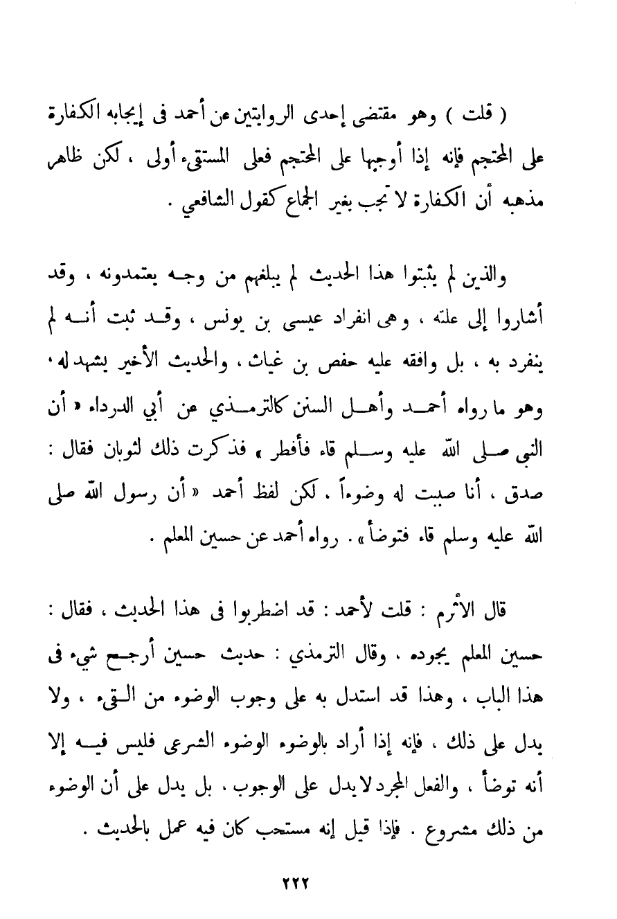 قُلْت وَهُوَ مُقْتَضَى إحْدَى الرِّوَايَتَيْنِ عَنْ أَحْمَد فِي إيجَابِهِ الْكَفَّارَةَ عَلَى الْمُحْتَجِمِ فَإِنَّهُ إذَا أَوْجَبَهَا عَلَى الْمُحْتَجِمِ فَعَلَى المستقيء أَوْلَى لَكِنْ ظَاهِرُ مَذْهَبِهِ أَنَّ الْكَفَّارَةَ لَا تَجِبُ بِغَيْرِ الْجِمَاعِ كَقَوْلِ الشَّافِعِيِّ. وَاَلَّذِينَ لَمْ يُثْبِتُوا هَذَا الْحَدِيثَ لَمْ يَبْلُغْهُمْ مِنْ وَجْهٍ يَعْتَمِدُونَهُ وَقَدْ أَشَارُوا: إلَى عِلَّتِهِ وَهُوَ انْفِرَادُ عِيسَى بْنِ يُونُسَ وَقَدْ ثَبَتَ أَنَّهُ لَمْ يَنْفَرِدْ بِهِ بَلْ وَافَقَهُ عَلَيْهِ حَفْصُ بْنُ غِيَاثٍ وَالْحَدِيثُ الْأَخِيرُ يَشْهَدُ لَهُ وَهُوَ مَا رَوَاهُ أَحْمَد وَأَهْلُ السُّنَنِ كَالتِّرْمِذِيِّ عَنْ أَبِي الدَّرْدَاءِ " {أَنَّ النَّبِيَّ صَلَّى اللَّهُ عَلَيْهِ وَسَلَّمَ قَاءَ فَأَفْطَرَ} فَذَكَرْت ذَلِكَ لثوبان فَقَالَ: صَدَقَ أَنَا صَبَبْت لَهُ وَضُوءًا لَكِنَّ لَفْظَ أَحْمَد " {أَنَّ رَسُولَ اللَّهِ صَلَّى اللَّهُ عَلَيْهِ وَسَلَّمَ قَاءَ فَتَوَضَّأَ} . رَوَاهُ. أَحْمَد عَنْ حُسَيْنٍ الْمُعَلِّمِ. قَالَ الْأَثْرَمُ: قُلْت لِأَحْمَدَ: قَدْ اضْطَرَبُوا فِي هَذَا الْحَدِيثِ فَقَالَ: حُسَيْنٌ الْمُعَلِّمُ يُجَوِّدُهُ وَقَالَ التِّرْمِذِيُّ: حَدِيثُ حُسَيْنٍ أَرْجَحُ شَيْءٍ فِي هَذَا الْبَابِ وَهَذَا قَدْ اُسْتُدِلَّ بِهِ عَلَى وُجُوبِ الْوُضُوءِ مِنْ الْقَيْءِ وَلَا يَدُلُّ عَلَى ذَلِكَ فَإِنَّهُ إذَا أَرَادَ بِالْوُضُوءِ الْوُضُوءَ الشَّرْعِيَّ فَلَيْسَ فِيهِ إلَّا أَنَّهُ تَوَضَّأَ وَالْفِعْلُ الْمُجَرَّدُ لَا يَدُلُّ عَلَى الْوُجُوبِ بَلْ يَدُلُّ عَلَى أَنَّ الْوُضُوءَ مِنْ ذَلِكَ مَشْرُوعٌ. فَإِذَا قِيلَ إنَّهُ مُسْتَحَبٌّ كَانَ فِيهِ عَمَلٌ بِالْحَدِيثِ.