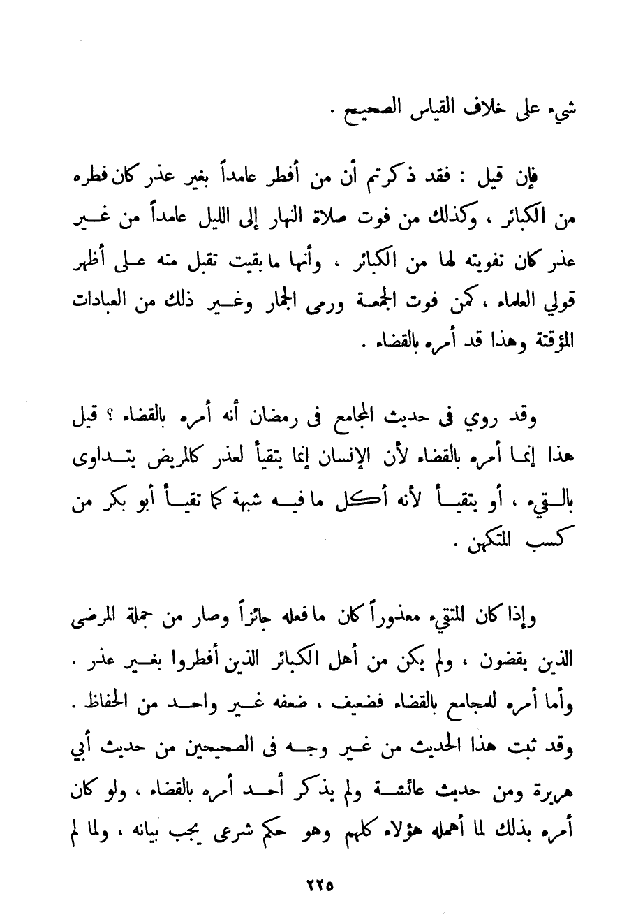 شَيْءٌ عَلَى خِلَافِ الْقِيَاسِ الصَّحِيحِ. فَإِنْ قِيلَ: فَقَدْ ذَكَرْتُمْ أَنَّ مَنْ أَفْطَرَ عَامِدًا بِغَيْرِ عُذْرٍ كَانَ فِطْرُهُ مِنْ الْكَبَائِرِ وَكَذَلِكَ مَنْ فَوَّتَ صَلَاةَ النَّهَارِ إلَى اللَّيْلِ عَامِدًا مِنْ غَيْرِ عُذْرٍ كَانَ تَفْوِيتُهُ لَهَا مِنْ الْكَبَائِرِ وَأَنَّهَا مَا بَقِيَتْ تُقْبَلُ مِنْهُ عَلَى أَظْهَرِ قَوْلَيْ الْعُلَمَاءِ كَمَنْ فَوَّتَ الْجُمْعَةَ وَرَمَى الْجِمَارَ وَغَيْرِ ذَلِكَ مِنْ الْعِبَادَاتِ الْمُؤَقَّتَةِ وَهَذَا قَدْ أَمَرَهُ بِالْقَضَاءِ. وَقَدْ رُوِيَ فِي حَدِيثِ الْمُجَامِعِ فِي رَمَضَانَ أَنَّهُ أَمَرَهُ بِالْقَضَاءِ؟ قِيلَ هَذَا إنَّمَا أَمَرَهُ بِالْقَضَاءِ لِأَنَّ الْإِنْسَانَ إنَّمَا يَتَقَيَّأُ لِعُذْرٍ كَالْمَرِيضِ يَتَدَاوَى بِالْقَيْءِ أَوْ يَتَقَيَّأُ لِأَنَّهُ أَكَلَ مَا فِيهِ شُبْهَةٌ كَمَا تَقَيَّأَ أَبُو بَكْرٍ مِنْ كَسْبِ الْمُتَكَهِّنِ. وَإِذَا كَانَ الْمُتَقَيِّئُ مَعْذُورًا كَانَ مَا فَعَلَهُ جَائِزًا وَصَارَ مِنْ جُمْلَةِ الْمَرْضَى الَّذِينَ يَقْضُونَ وَلَمْ يَكُنْ مِنْ أَهْلِ الْكَبَائِرِ الَّذِينَ أَفْطَرُوا بِغَيْرِ عُذْرٍ. وَأَمَّا أَمْرُهُ لِلْمُجَامِعِ بِالْقَضَاءِ فَضَعِيفٌ ضَعَّفَهُ غَيْرُ وَاحِدٍ مِنْ الْحُفَّاظِ. وَقَدْ ثَبَتَ هَذَا الْحَدِيثُ مِنْ غَيْرِ وَجْهٍ فِي الصَّحِيحَيْنِ مِنْ حَدِيثِ أَبِي هُرَيْرَةَ وَمِنْ حَدِيثِ عَائِشَةَ وَلَمْ يَذْكُرْ أَحَدٌ أَمْرَهُ بِالْقَضَاءِ وَلَوْ كَانَ أَمَرَهُ بِذَلِكَ لَمَا أَهْمَلَهُ هَؤُلَاءِ كُلُّهُمْ وَهُوَ حُكْمٌ شَرْعِيٌّ يَجِبُ بَيَانُهُ وَلَمَّا لَمْ