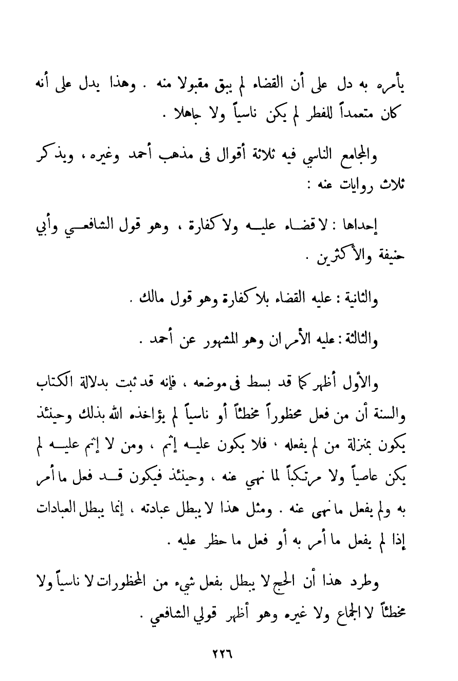 يَأْمُرْهُ بِهِ دَلَّ عَلَى أَنَّ الْقَضَاءَ لَمْ يَبْقَ مَقْبُولًا مِنْهُ. وَهَذَا يَدُلُّ عَلَى أَنَّهُ كَانَ مُتَعَمِّدًا لِلْفِطْرِ لَمْ يَكُنْ نَاسِيًا وَلَا جَاهِلًا. وَالْمَجَامِعُ النَّاسِي فِيهِ ثَلَاثَةُ أَقْوَالٍ فِي مَذْهَبِ أَحْمَد وَغَيْرِهِ وَيُذْكَرُ ثَلَاثُ رِوَايَاتٍ عَنْهُ: أَحَدُهُمَا: لَا قَضَاءَ عَلَيْهِ وَلَا كَفَّارَةَ وَهُوَ قَوْلُ الشَّافِعِيِّ وَأَبِي حَنِيفَةَ وَالْأَكْثَرِينَ. وَالثَّانِيَةُ: عَلَيْهِ الْقَضَاءُ بِلَا كَفَّارَةٍ وَهُوَ قَوْلُ مَالِكٌ. وَالثَّالِثَةُ: عَلَيْهِ الْأَمْرَانِ وَهُوَ الْمَشْهُورُ عَنْ أَحْمَد. وَالْأَوَّلُ أَظْهَرُ كَمَا قَدْ بُسِطَ فِي مَوْضِعِهِ فَإِنَّهُ قَدْ ثَبَتَ بِدَلَالَةِ الْكِتَابِ وَالسُّنَّةِ أَنَّ مَنْ فَعَلَ مَحْظُورًا مُخْطِئًا أَوْ نَاسِيًا لَمْ يُؤَاخِذْهُ اللَّهُ بِذَلِكَ وَحِينَئِذٍ يَكُونُ بِمَنْزِلَةِ مَنْ لَمْ يَفْعَلْهُ فَلَا يَكُونُ عَلَيْهِ إثْمٌ وَمَنْ لَا إثْمَ عَلَيْهِ لَمْ يَكُنْ عَاصِيًا وَلَا مُرْتَكِبًا لِمَا نُهِيَ عَنْهُ وَحِينَئِذٍ فَيَكُونُ قَدْ فَعَلَ مَا أُمِرَ بِهِ وَلَمْ يَفْعَلْ مَا نُهِيَ عَنْهُ. وَمِثْلُ هَذَا لَا يُبْطِلُ عِبَادَتَهُ إنَّمَا يُبْطِلُ الْعِبَادَاتِ إذَا لَمْ يَفْعَلْ مَا أُمِرَ بِهِ أَوْ فَعَلَ مَا حُظِرَ عَلَيْهِ. وَطَرْدُ هَذَا أَنَّ الْحَجَّ لَا يَبْطُلُ بِفِعْلِ شَيْءٍ مِنْ الْمَحْظُورَاتِ لَا نَاسِيًا وَلَا مُخْطِئًا لَا الْجِمَاعُ وَلَا غَيْرُهُ. وَهُوَ أَظْهَرُ قَوْلَيْ الشَّافِعِيِّ.