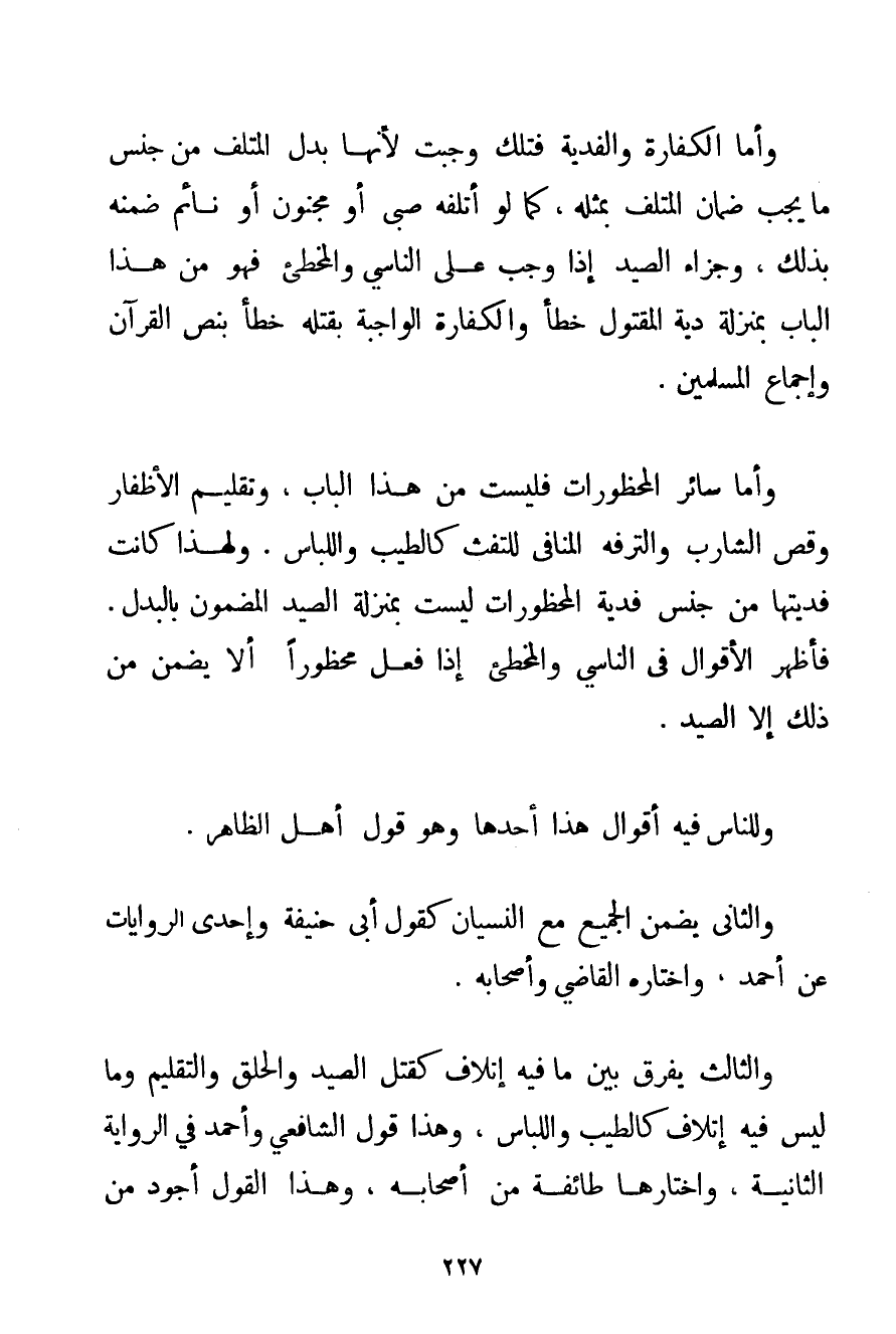 وَأَمَّا الْكَفَّارَةُ وَالْفِدْيَةُ فَتِلْكَ وَجَبَتْ لِأَنَّهَا بَدَلُ الْمُتْلَفِ مِنْ جِنْسِ مَا يَجِبُ ضَمَانُ الْمُتْلَفِ بِمِثْلِهِ كَمَا لَوْ أَتْلَفَهُ صَبِيٌّ أَوْ مَجْنُونٌ أَوْ نَائِمٌ ضَمِنَهُ بِذَلِكَ وَجَزَاءُ الصَّيْدِ إذَا وَجَبَ عَلَى النَّاسِي وَالْمُخْطِئِ فَهُوَ مِنْ هَذَا الْبَابِ بِمَنْزِلَةِ دِيَةِ الْمَقْتُولِ خَطَأً وَالْكَفَّارَةِ الْوَاجِبَةِ بِقَتْلِهِ خَطَأً بِنَصِّ الْقُرْآنِ وَإِجْمَاعِ الْمُسْلِمِينَ. وَأَمَّا سَائِرُ الْمَحْظُورَاتِ فَلَيْسَتْ مِنْ هَذَا الْبَابِ وَتَقْلِيمُ الْأَظْفَارِ وَقَصُّ الشَّارِبِ وَالتَّرَفُّهُ الْمُنَافِي لِلتَّفَثِ كَالطِّيبِ وَاللِّبَاسِ. وَلِهَذَا كَانَتْ فِدْيَتُهَا مِنْ جِنْسِ فِدْيَةِ الْمَحْظُورَاتِ لَيْسَتْ بِمَنْزِلَةِ الصَّيْدِ الْمَضْمُونِ بِالْبَدَلِ. فَأَظْهَرُ الْأَقْوَالِ فِي النَّاسِي وَالْمُخْطِئِ إذَا فَعَلَ مَحْظُورًا أَلَّا يَضْمَنَ مِنْ ذَلِكَ إلَّا الصَّيْدَ. وَلِلنَّاسِ فِيهِ أَقْوَالٌ هَذَا أَحَدُهَا وَهُوَ قَوْلُ أَهْلِ الظَّاهِرِ. وَالثَّانِي يَضْمَنُ الْجَمِيعَ مَعَ النِّسْيَانِ كَقَوْلِ أَبِي حَنِيفَةَ وَإِحْدَى الرِّوَايَاتِ عَنْ أَحْمَد وَاخْتَارَهُ الْقَاضِي وَأَصْحَابُهُ. وَالثَّالِثُ يُفَرِّقُ بَيْنَ مَا فِيهِ إتْلَافٌ كَقَتْلِ الصَّيْدِ وَالْحَلْقِ وَالتَّقْلِيمِ وَمَا لَيْسَ فِيهِ إتْلَافٌ كَالطِّيبِ وَاللِّبَاسِ وَهَذَا قَوْلُ الشَّافِعِيِّ وَأَحْمَد فِي الرِّوَايَةِ الثَّانِيَةِ وَاخْتَارَهَا طَائِفَةٌ مِنْ أَصْحَابِهِ وَهَذَا الْقَوْلُ أَجْوَدُ مِنْ