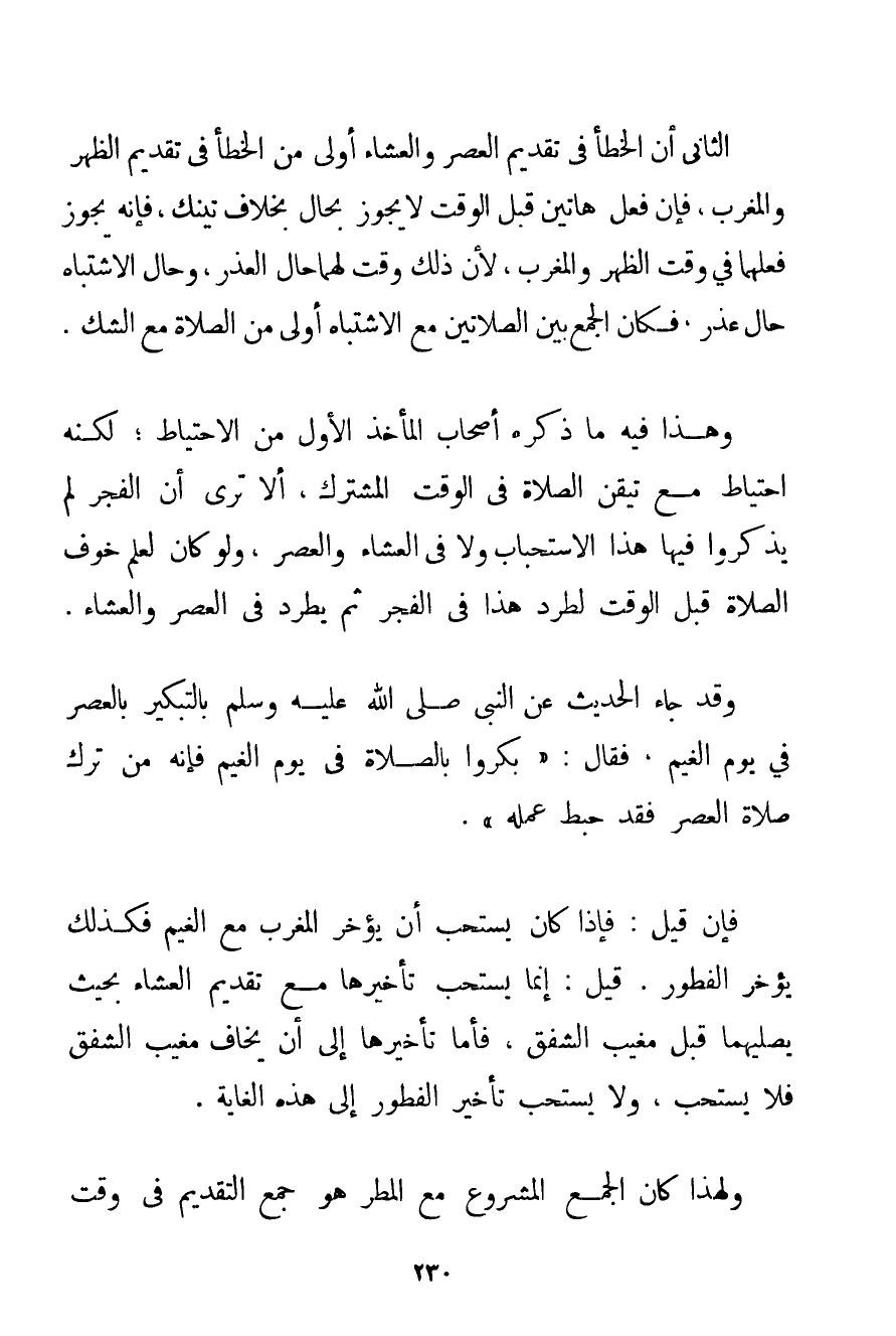 الثَّانِي أَنَّ الْخَطَأَ فِي تَقْدِيمِ الْعَصْرِ وَالْعِشَاءِ أَوْلَى مِنْ الْخَطَأِ فِي تَقْدِيمِ الظُّهْرِ وَالْمَغْرِبِ فَإِنَّ فِعْلَ هَاتَيْنِ قَبْلَ الْوَقْتِ لَا يَجُوزُ بِحَالٍ بِخِلَافِ تينك فَإِنَّهُ يَجُوزُ فِعْلُهُمَا فِي وَقْتِ الظُّهْرِ وَالْمَغْرِبِ لِأَنَّ ذَلِكَ وَقْتٌ لَهُمَا حَالَ الْعُذْرِ وَحَال الِاشْتِبَاهِ حَالُ عُذْرٍ فَكَانَ الْجَمْعُ بَيْنَ الصَّلَاتَيْنِ مَعَ الِاشْتِبَاهِ أَوْلَى مِنْ الصَّلَاةِ مَعَ الشَّكِّ. وَهَذَا فِيهِ مَا ذَكَرَهُ أَصْحَابُ الْمَأْخَذِ الْأَوَّلِ مِنْ الِاحْتِيَاطِ؛ لَكِنَّهُ احْتِيَاطٌ مَعَ تَيَقُّنِ الصَّلَاةِ فِي الْوَقْتِ الْمُشْتَرَكِ أَلَا تَرَى أَنَّ الْفَجْرَ لَمْ يَذْكُرُوا فِيهَا هَذَا الِاسْتِحْبَابَ وَلَا فِي الْعِشَاءِ وَالْعَصْرِ وَلَوْ كَانَ لِعِلْمِ خَوْفِ الصَّلَاةِ قَبْلَ الْوَقْتِ لَطُرِدَ هَذَا فِي الْفَجْرِ ثُمَّ يَطَّرِدُ فِي الْعَصْرِ وَالْعِشَاءِ. وَقَدْ جَاءَ الْحَدِيثُ عَنْ النَّبِيِّ صَلَّى اللَّهُ عَلَيْهِ وَسَلَّمَ بِالتَّبْكِيرِ بِالْعَصْرِ فِي يَوْمِ الْغَيْمِ فَقَالَ: " {بَكِّرُوا بِالصَّلَاةِ فِي يَوْمِ الْغَيْمِ فَإِنَّهُ مَنْ تَرَكَ صَلَاةَ الْعَصْرِ فَقَدْ حَبِطَ عَمَلُهُ} . فَإِنْ قِيلَ. فَإِذَا كَانَ يُسْتَحَبُّ أَنْ يُؤَخَّرَ الْمَغْرِبُ مَعَ الْغَيْمِ فَكَذَلِكَ يُؤَخَّرُ الْفُطُورُ قِيلَ: إنَّمَا يُسْتَحَبُّ تَأْخِيرُهَا مَعَ تَقْدِيمِ الْعِشَاءِ بِحَيْثُ يُصَلِّيهِمَا قَبْلَ مَغِيبِ الشَّفَقِ فَأَمَّا تَأْخِيرُهَا إلَى أَنْ يَخَافَ مَغِيبَ الشَّفَقِ فَلَا يُسْتَحَبُّ وَلَا يُسْتَحَبُّ تَأْخِيرُ الْفُطُورِ إلَى هَذِهِ الْغَايَةِ. وَلِهَذَا كَانَ الْجَمْعُ الْمَشْرُوعُ مَعَ الْمَطَرِ هُوَ جَمْعَ التَّقْدِيمِ فِي وَقْتِ