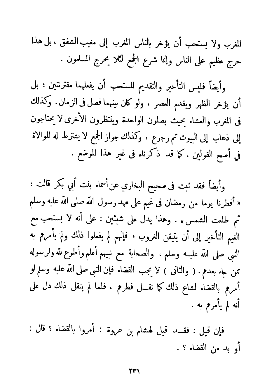 الْمَغْرِبِ وَلَا يُسْتَحَبُّ أَنْ يُؤَخِّرَ بِالنَّاسِ الْمَغْرِب إلَى مَغِيبِ الشَّفَقِ بَلْ هَذَا حَرَجٌ عَظِيمٌ عَلَى النَّاسِ وَإِنَّمَا شُرِعَ الْجَمْعُ لِئَلَّا يُحْرَجَ الْمُسْلِمُونَ. وَأَيْضًا فَلَيْسَ التَّأْخِيرُ وَالتَّقْدِيمُ الْمُسْتَحَبُّ أَنْ يَفْعَلَهُمَا مُقْتَرِنَتَيْنِ؛ بَلْ أَنْ يُؤَخِّرَ الظُّهْرَ وَيُقَدِّمَ الْعَصْرَ وَلَوْ كَانَ بَيْنَهُمَا فَصْلٌ فِي الزَّمَانِ. وَكَذَلِكَ فِي الْمَغْرِبِ وَالْعِشَاءِ بِحَيْثُ يُصَلُّونَ الْوَاحِدَةَ وَيَنْتَظِرُونَ الْأُخْرَى لَا يَحْتَاجُونَ إلَى ذَهَابٍ إلَى الْبُيُوتِ ثُمَّ رُجُوعٍ وَكَذَلِكَ جَوَازُ الْجَمْعِ لَا يُشْتَرَطُ لَهُ الْمُوَالَاةُ فِي أَصَحِّ الْقَوْلَيْنِ كَمَا قَدْ ذَكَرْنَاهُ فِي غَيْرِ هَذَا الْمَوْضِعِ. وَأَيْضًا فَقَدْ ثَبَتَ فِي صَحِيحِ الْبُخَارِيِّ عَنْ {أَسْمَاءَ بِنْتِ أَبِي بَكْرٍ قَالَتْ: أَفْطَرْنَا يَوْمًا مِنْ رَمَضَانَ فِي غَيْمٍ عَلَى عَهْدِ رَسُولِ اللَّهِ صَلَّى اللَّهُ عَلَيْهِ وَسَلَّمَ ثُمَّ طَلَعَتْ الشَّمْسُ} . وَهَذَا يَدُلُّ عَلَى شَيْئَيْنِ: عَلَى أَنَّهُ لَا يُسْتَحَبُّ مَعَ الْغَيْمِ التَّأْخِيرُ إلَى أَنْ يَتَيَقَّنَ الْغُرُوبَ؛ فَإِنَّهُمْ لَمْ يَفْعَلُوا ذَلِكَ وَلَمْ يَأْمُرْهُمْ بِهِ النَّبِيُّ صَلَّى اللَّهُ عَلَيْهِ وَسَلَّمَ وَالصَّحَابَةُ مَعَ نَبِيِّهِمْ أَعْلَمُ وَأَطْوَعُ لِلَّهِ وَلِرَسُولِهِ مِمَّنْ جَاءَ بَعْدَهُمْ. وَالثَّانِي لَا يَجِبُ الْقَضَاءُ فَإِنَّ النَّبِيَّ صَلَّى اللَّهُ عَلَيْهِ وَسَلَّمَ لَوْ أَمَرَهُمْ بِالْقَضَاءِ لَشَاعَ ذَلِكَ كَمَا نُقِلَ فِطْرُهُمْ فَلَمَّا لَمْ يُنْقَلْ ذَلِكَ دَلَّ عَلَى إنَّهُ لَمْ يَأْمُرْهُمْ بِهِ. فَإِنْ قِيلَ: فَقَدْ قِيلَ لِهِشَامِ بْنِ عُرْوَةَ: أُمِرُوا بِالْقَضَاءِ؟ قَالَ: أو بُدٌّ مِنْ الْقَضَاءِ؟ .