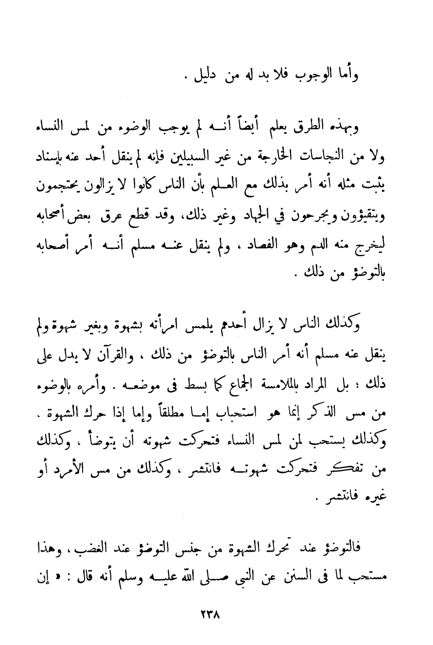 وَأَمَّا الْوُجُوبُ فَلَا بُدَّ لَهُ مِنْ دَلِيلٍ. وَبِهَذِهِ. الطُّرُقِ يُعْلَمُ أَيْضًا أَنَّهُ لَمْ يُوجِبْ الْوُضُوءَ مِنْ لَمْسِ النِّسَاءِ وَلَا مِنْ النَّجَاسَاتِ الْخَارِجَةِ مِنْ غَيْرِ السَّبِيلَيْنِ فَإِنَّهُ لَمْ يَنْقُلْ أَحَدٌ عَنْهُ بِإِسْنَادٍ يَثْبُتُ مِثْلُهُ أَنَّهُ أَمَرَ بِذَلِكَ مَعَ الْعِلْمِ بِأَنَّ النَّاسَ كَانُوا لَا يَزَالُونَ يَحْتَجِمُونَ وَيَتَقَيَّئُونَ وَيُجْرَحُونَ فِي الْجِهَادِ وَغَيْرِ ذَلِكَ وَقَدْ قُطِعَ عِرْقُ بَعْضِ أَصْحَابِهِ لِيَخْرُجَ مِنْهُ الدَّمُ وَهُوَ الْفِصَادُ وَلَمْ يَنْقُلْ عَنْهُ مُسْلِمٌ أَنَّهُ أَمَرَ أَصْحَابَهُ بِالتَّوَضُّؤِ مِنْ ذَلِكَ. وَكَذَلِكَ النَّاسُ لَا يَزَالُ أَحَدُهُمْ يَلْمِسُ امْرَأَتَهُ بِشَهْوَةٍ وَبِغَيْرِ شَهْوَةٍ وَلَمْ يَنْقُلْ عَنْهُ مُسْلِمٌ أَنَّهُ أَمَرَ النَّاسَ بِالتَّوَضُّؤِ مِنْ ذَلِكَ وَالْقُرْآنُ لَا يَدُلُّ عَلَى ذَلِكَ؛ بَلْ الْمُرَادُ بِالْمُلَامَسَةِ الْجِمَاعُ كَمَا بُسِطَ فِي مَوْضِعِهِ. وَأَمْرُهُ بِالْوُضُوءِ مِنْ مَسِّ الذَّكَرِ إنَّمَا هُوَ اسْتِحْبَابٌ إمَّا مُطْلَقًا وَإِمَّا إذَا حَرَّكَ الشَّهْوَةَ وَكَذَلِكَ يُسْتَحَبُّ لِمَنْ لَمَسَ النِّسَاءَ فَتَحَرَّكَتْ شَهْوَتُهُ أَنْ يَتَوَضَّأَ وَكَذَلِكَ مَنْ تَفَكَّرَ فَتَحَرَّكَتْ شَهْوَتُهُ فَانْتَشَرَ وَكَذَلِكَ مَنْ مَسَّ الْأَمْرَدَ أَوْ غَيْرَهُ فَانْتَشَرَ. فَالتَّوَضُّؤُ عِنْدَ تَحَرُّكِ الشَّهْوَةِ مِنْ جِنْسِ التَّوَضُّؤِ عِنْدَ الْغَضَبِ وَهَذَا مُسْتَحَبٌّ لِمَا فِي السُّنَنِ عَنْ النَّبِيِّ صَلَّى اللَّهُ عَلَيْهِ وَسَلَّمَ أَنَّهُ قَالَ: " {إنَّ