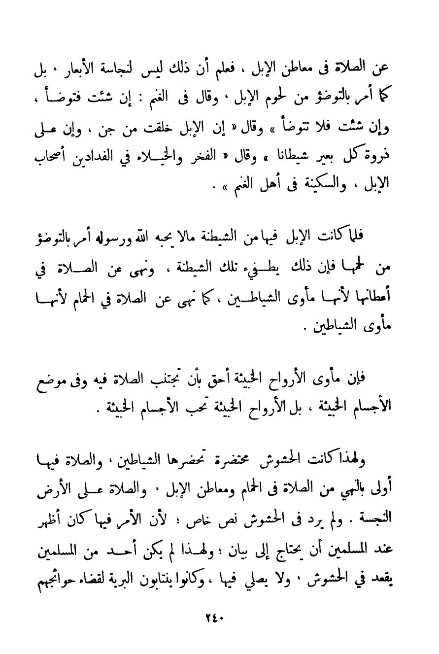 عَنْ الصَّلَاةِ فِي مَعَاطِنِ الْإِبِلِ فَعُلِمَ أَنَّ ذَلِكَ لَيْسَ لِنَجَاسَةِ الأبعار بَلْ كَمَا أَمَرَ بِالتَّوَضُّؤِ مِنْ لُحُومِ الْإِبِلِ وَقَالَ فِي الْغَنَمِ: إنْ شِئْت فَتَوَضَّأَ وَإِنْ شِئْت فَلَا تَتَوَضَّأْ " وَقَالَ " {إنَّ الْإِبِلَ خُلِقَتْ مِنْ جِنٍّ وَإِنَّ عَلَى ذُرْوَةِ كُلِّ بَعِيرٍ شَيْطَانًا} وَقَالَ " {الْفَخْرُ وَالْخُيَلَاءُ فِي الْفَدَّادِينَ أَصْحَابِ الْإِبِلِ وَالسَّكِينَةُ فِي أَهْلِ الْغَنَمِ} . فَلَمَّا كَانَتْ الْإِبِلُ فِيهَا مِنْ الشَّيْطَنَةِ مَا لَا يُحِبُّهُ اللَّهُ وَرَسُوله أَمَرَ بِالتَّوَضُّؤِ مِنْ لَحْمِهَا فَإِنَّ ذَلِكَ يُطْفِئُ تِلْكَ الشَّيْطَنَةَ وَنَهَى عَنْ الصَّلَاةِ فِي أَعْطَانِهَا لِأَنَّهَا مَأْوَى الشَّيَاطِينِ كَمَا نَهَى عَنْ الصَّلَاةِ فِي الْحَمَّامِ لِأَنَّهَا مَأْوَى الشَّيَاطِينِ. فَإِنَّ مَأْوَى الْأَرْوَاحِ الْخَبِيثَةِ أَحَقُّ بِأَنْ تُجْتَنَبَ الصَّلَاةُ فِيهِ وَفِي مَوْضِعِ الْأَجْسَامِ الْخَبِيثَةِ بَلْ الْأَرْوَاحُ الْخَبِيثَةُ تُحِبُّ الْأَجْسَامَ الْخَبِيثَةَ. وَلِهَذَا كَانَتْ الْحُشُوشُ مُحْتَضَرَةً تَحْضُرُهَا الشَّيَاطِينُ وَالصَّلَاةُ فِيهَا أَوْلَى بِالنَّهْيِ مِنْ الصَّلَاةِ فِي الْحَمَّامِ وَمَعَاطِنِ الْإِبِلِ وَالصَّلَاةِ عَلَى الْأَرْضِ النَّجِسَةِ. وَلَمْ يَرِدْ فِي الْحُشُوشِ نَصٌّ خَاصٌّ؛ لِأَنَّ الْأَمْرَ فِيهَا كَانَ أَظْهَرَ عِنْدَ الْمُسْلِمِينَ أَنْ يَحْتَاجَ إلَى بَيَانٍ؛ وَلِهَذَا لَمْ يَكُنْ أَحَدٌ مِنْ الْمُسْلِمِينَ يَقْعُدُ فِي الْحُشُوشِ وَلَا يُصَلِّي فِيهَا وَكَانُوا يَنْتَابُونَ الْبَرِّيَّةَ لِقَضَاءِ حَوَائِجِهِمْ