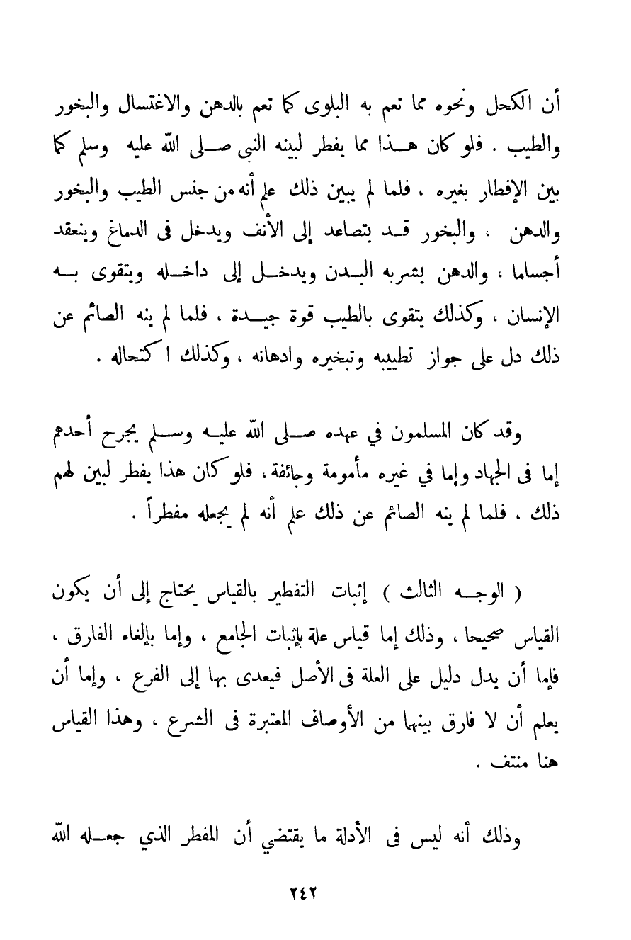 أَنَّ الْكُحْلَ وَنَحْوَهُ مِمَّا تَعُمُّ بِهِ الْبَلْوَى كَمَا تَعُمُّ بِالدُّهْنِ وَالِاغْتِسَالِ وَالْبَخُورِ وَالطِّيبِ. فَلَوْ كَانَ هَذَا مِمَّا يُفْطِرُ لَبَيَّنَهُ النَّبِيُّ صَلَّى اللَّهُ عَلَيْهِ وَسَلَّمَ كَمَا بَيَّنَ الْإِفْطَارَ بِغَيْرِهِ فَلَمَّا لَمْ يُبَيِّنْ ذَلِكَ عُلِمَ أَنَّهُ مِنْ جِنْسِ الطِّيبِ وَالْبَخُورِ وَالدُّهْنِ وَالْبَخُورُ قَدْ يَتَصَاعَدُ إلَى الْأَنْفِ وَيَدْخُلُ فِي الدِّمَاغِ وَيَنْعَقِدُ أَجْسَامًا وَالدُّهْنُ يَشْرَبُهُ الْبَدَنُ وَيَدْخُلُ إلَى دَاخِلِهِ وَيَتَقَوَّى بِهِ الْإِنْسَانُ وَكَذَلِكَ يَتَقَوَّى بِالطِّيبِ قُوَّةً جَيِّدَةً فَلَمَّا لَمْ يَنْهَ الصَّائِمَ عَنْ ذَلِكَ دَلَّ عَلَى جَوَازِ تَطْيِيبِهِ وَتَبْخِيرِهِ وَادِّهَانِهِ وَكَذَلِكَ اكْتِحَالُهُ. وَقَدْ كَانَ الْمُسْلِمُونَ فِي عَهْدِهِ صَلَّى اللَّهُ عَلَيْهِ وَسَلَّمَ يُجْرَحُ أَحَدُهُمْ إمَّا فِي الْجِهَادِ وَإِمَّا فِي غَيْرِهِ مَأْمُومَةً وَجَائِفَةً فَلَوْ كَانَ هَذَا يُفْطِرُ لَبَيَّنَ لَهُمْ ذَلِكَ فَلَمَّا لَمْ يَنْهَ الصَّائِمَ عَنْ ذَلِكَ عُلِمَ أَنَّهُ لَمْ يَجْعَلْهُ مُفْطِرًا. (الْوَجْهُ الثَّالِثُ إثْبَاتُ التَّفْطِيرِ بِالْقِيَاسِ يَحْتَاجُ إلَى أَنْ يَكُونَ الْقِيَاسُ صَحِيحًا وَذَلِكَ إمَّا قِيَاسُ عِلَّةٍ بِإِثْبَاتِ الْجَامِعِ وَإِمَّا بِإِلْغَاءِ الْفَارِقِ فَإِمَّا أَنْ يَدُلَّ دَلِيلٌ عَلَى الْعِلَّةِ فِي الْأَصْلِ فَيُعَدَّى بِهَا إلَى الْفَرْعِ وَإِمَّا أَنْ يُعْلَمَ أَنْ لَا فَارِقَ بَيْنَهُمَا مِنْ الْأَوْصَافِ الْمُعْتَبَرَةِ فِي الشَّرْعِ وَهَذَا الْقِيَاسُ هُنَا مُنْتَفٍ. وَذَلِكَ أَنَّهُ لَيْسَ فِي الْأَدِلَّةِ مَا يَقْتَضِي أَنَّ الْمُفَطِّرَ الَّذِي جَعَلَهُ اللَّهُ