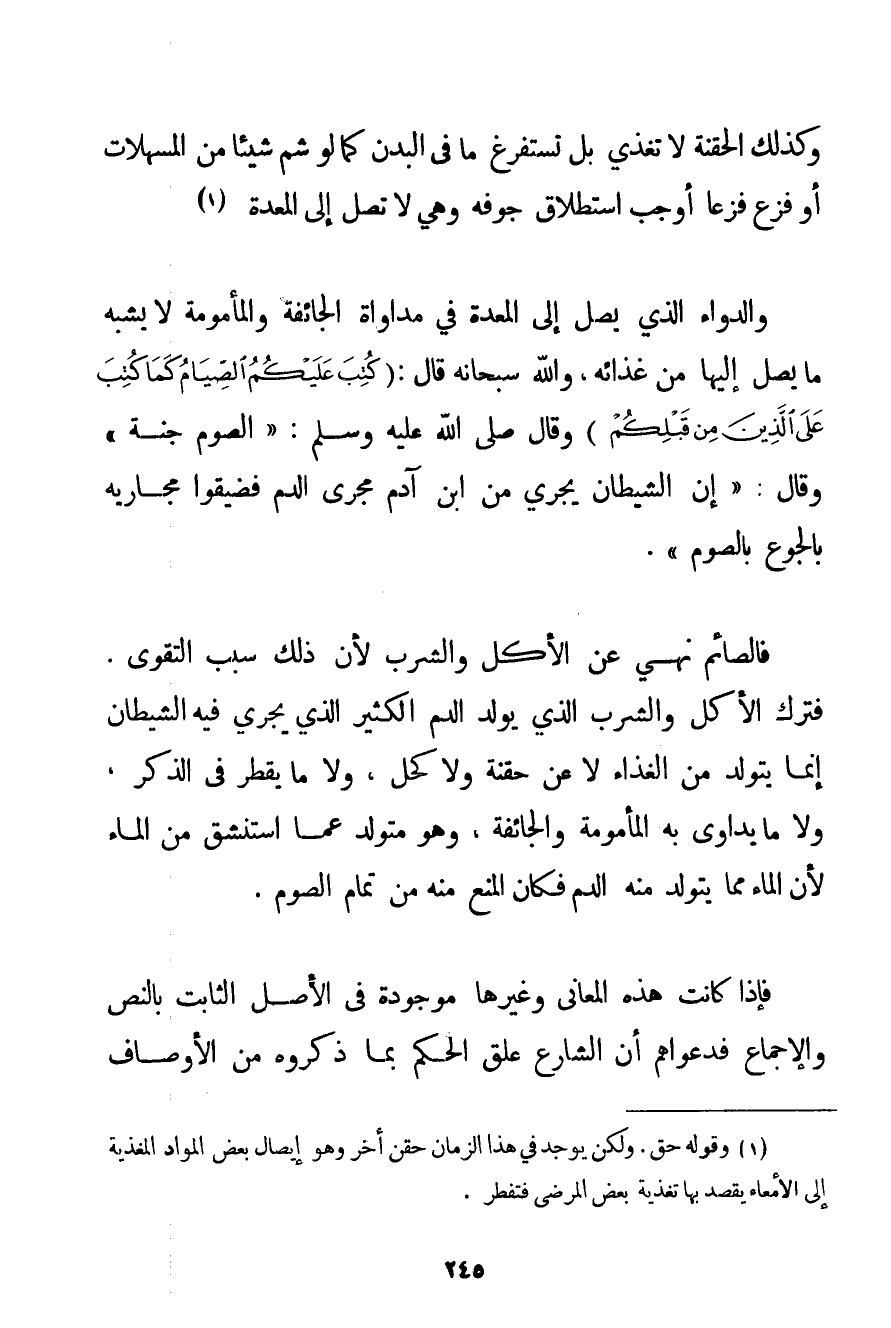 وَكَذَلِكَ الْحُقْنَةُ لَا تُغَذِّي بَلْ تَسْتَفْرِغُ مَا فِي الْبَدَنِ كَمَا لَوْ شَمَّ شَيْئًا مِنْ الْمُسَهِّلَاتِ أَوْ فَزِعَ فَزَعًا أَوْجَبَ اسْتِطْلَاقَ جَوْفِهِ وَهِيَ لَا تَصِلُ إلَى الْمَعِدَةِ وَالدَّوَاءُ الَّذِي يَصِلُ إلَى الْمَعِدَةِ فِي مُدَاوَاةِ الْجَائِفَةِ وَالْمَأْمُومَةِ لَا يُشْبِهُ مَا يَصِلُ إلَيْهَا مِنْ غِذَائِهِ وَاَللَّهُ سُبْحَانَهُ قَالَ: {كُتِبَ عَلَيْكُمُ الصِّيَامُ كَمَا كُتِبَ عَلَى الَّذِينَ مِنْ قَبْلِكُمْ} وَقَالَ صَلَّى اللَّهُ عَلَيْهِ وَسَلَّمَ " {الصَّوْمُ جُنَّةٌ} وَقَالَ: " {إنَّ الشَّيْطَانَ يَجْرِي مِنْ ابْنِ آدَمَ مَجْرَى الدَّمِ فَضَيِّقُوا مَجَارِيَهُ بِالْجُوعِ بِالصَّوْمِ} . فَالصَّائِمُ نُهِيَ عَنْ الْأَكْلِ وَالشُّرْبِ لِأَنَّ ذَلِكَ سَبَبُ التَّقَوِّي. فَتَرْكُ الْأَكْلِ وَالشُّرْبِ الَّذِي يُوَلِّدُ الدَّمَ الْكَثِيرَ الَّذِي يَجْرِي فِيهِ الشَّيْطَانُ إنَّمَا يَتَوَلَّدُ مِنْ الْغِذَاءِ لَا عَنْ حُقْنَةٍ وَلَا كُحْلٍ وَلَا مَا يُقْطَرُ فِي الذَّكَرِ وَلَا مَا يُدَاوِي بِهِ الْمَأْمُومَةَ وَالْجَائِفَةَ وَهُوَ مُتَوَلِّدٌ عَمَّا اُسْتُنْشِقَ مِنْ الْمَاءِ لِأَنَّ الْمَاءَ مِمَّا يَتَوَلَّدُ مِنْهُ الدَّمُ فَكَانَ الْمَنْعُ مِنْهُ مِنْ تَمَامِ الصَّوْمِ. فَإِذَا كَانَتْ هَذِهِ. الْمَعَانِي وَغَيْرُهَا مَوْجُودَةً فِي الْأَصْلِ الثَّابِتِ بِالنَّصِّ وَالْإِجْمَاعِ فَدَعْوَاهُمْ أَنَّ الشَّارِعَ عَلَّقَ الْحُكْمَ بِمَا ذَكَرُوهُ مِنْ الْأَوْصَافِ