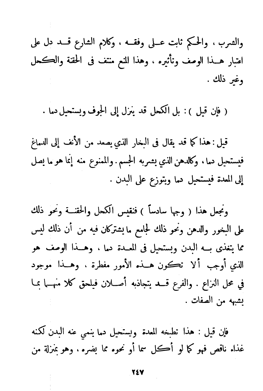 وَالشُّرْبِ وَالْحُكْمُ ثَابِتٌ عَلَى وَفْقِهِ وَكَلَامُ الشَّارِعِ قَدْ دَلَّ عَلَى اعْتِبَارِ هَذَا الْوَصْفِ وَتَأْثِيرِهِ وَهَذَا الْمَنْعُ مُنْتَفٍ فِي الْحُقْنَةِ وَالْكُحْلِ وَغَيْرِ ذَلِكَ. فَإِنْ قِيلَ: بَلْ الْكُحْلُ قَدْ يَنْزِلُ إلَى الْجَوْفِ وَيَسْتَحِيلُ دَمًا. قِيلَ: هَذَا كَمَا قَدْ يُقَالُ فِي الْبُخَارِ الَّذِي يَصْعَدُ مِنْ الْأَنْفِ إلَى الدِّمَاغِ فَيَسْتَحِيلُ دَمًا وَكَالدُّهْنِ الَّذِي يَشْرَبُهُ الْجِسْمُ. وَالْمَمْنُوعُ مِنْهُ إنَّمَا هُوَ مَا يَصِلُ إلَى الْمَعِدَةِ فَيَسْتَحِيلُ دَمًا وَيَتَوَزَّعُ عَلَى الْبَدَنِ. وَنَجْعَلُ هَذَا (وَجْهًا سَادِسًا فَنَقِيسُ الْكُحْلَ وَالْحُقْنَةَ وَنَحْوَ ذَلِكَ عَلَى الْبَخُورِ وَالدُّهْنِ وَنَحْوِ ذَلِكَ لِجَامِعِ مَا يَشْتَرِكَانِ فِيهِ مِنْ أَنَّ ذَلِكَ لَيْسَ مِمَّا يَتَغَذَّى بِهِ الْبَدَنُ وَيَسْتَحِيلُ فِي الْمَعِدَةِ دَمًا وَهَذَا الْوَصْفُ هُوَ الَّذِي أَوْجَبَ أَنْ لَا تَكُونَ هَذِهِ الْأُمُورُ مُفْطِرَةً وَهَذَا مَوْجُودٌ فِي مَحَلِّ النِّزَاعِ. وَالْفَرْعُ قَدْ يَتَجَاذَبُهُ أَصْلَانِ فَيَلْحَقُ كُلًّا مِنْهُمَا بِمَا يُشْبِهُهُ مِنْ الصِّفَاتِ. فَإِنْ قِيلَ: هَذَا تَطْبُخُهُ الْمَعِدَةُ وَيَسْتَحِيلُ دَمًا يَنْمُو عَنْهُ الْبَدَنُ لَكِنَّهُ غِذَاءٌ نَاقِصٌ فَهُوَ كَمَا لَوْ أَكَلَ سُمًّا أَوْ نَحْوَهُ مِمَّا يَضُرُّهُ وَهُوَ بِمَنْزِلَةِ مَنْ