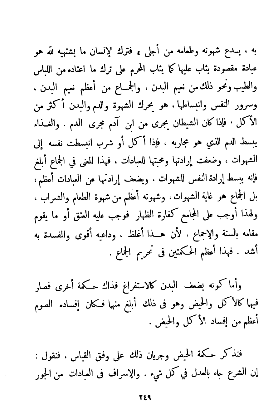 بِهِ يَدَعُ شَهْوَتَهُ وَطَعَامَهُ مِنْ أَجْلِي} فَتَرْكُ الْإِنْسَانِ مَا يَشْتَهِيهِ لِلَّهِ هُوَ عِبَادَةٌ مَقْصُودَةٌ يُثَابُ عَلَيْهَا كَمَا يُثَابُ الْمُحْرِمُ عَلَى تَرْكِ مَا اعْتَادَهُ مِنْ اللِّبَاسِ وَالطِّيبِ وَنَحْوِ ذَلِكَ مِنْ نَعِيمِ الْبَدَنِ وَالْجِمَاعُ مِنْ أَعْظَمِ نَعِيمِ الْبَدَنِ وَسُرُورِ النَّفْسِ وَانْبِسَاطِهَا هُوَ يُحَرِّكُ الشَّهْوَةَ وَالدَّمَ وَالْبَدَنَ أَكْثَرَ مِنْ الْأَكْلِ فَإِذَا كَانَ الشَّيْطَانُ يَجْرِي مِنْ ابْنِ آدَمَ مَجْرَى الدَّمِ. وَالْغِذَاءُ يَبْسُطُ الدَّمَ الَّذِي هُوَ مَجَارِيهِ فَإِذَا أَكَلَ أَوْ شَرِبَ انْبَسَطَتْ نَفْسُهُ إلَى الشَّهَوَاتِ وَضَعُفَتْ إرَادَتُهَا وَمَحَبَّتُهَا لِلْعِبَادَاتِ فَهَذَا الْمَعْنَى فِي الْجِمَاعِ أَبْلَغُ فَإِنَّهُ يَبْسُطُ إرَادَةَ النَّفْسِ لِلشَّهَوَاتِ وَيُضْعِفُ إرَادَتَهَا عَنْ الْعِبَادَاتِ أَعْظَمَ؛ بَلْ الْجِمَاعُ هُوَ غَايَةُ الشَّهَوَاتِ وَشَهْوَتُهُ أَعْظَمُ مِنْ شَهْوَةِ الطَّعَامِ وَالشَّرَابِ وَلِهَذَا أَوْجَبَ عَلَى الْمُجَامِعِ كَفَّارَةَ الظِّهَارِ فَوَجَبَ عَلَيْهِ الْعِتْقُ أَوْ مَا يَقُومُ مَقَامَهُ بِالسُّنَّةِ وَالْإِجْمَاعِ لِأَنَّ هَذَا أَغْلَظُ وَدَاعِيَهُ أَقْوَى وَالْمَفْسَدَةَ بِهِ أَشَدُّ. فَهَذَا أَعْظَمُ الْحِكْمَتَيْنِ فِي تَحْرِيمِ الْجِمَاعِ. وَأَمَّا كَوْنُهُ يُضْعِفُ الْبَدَنَ كَالِاسْتِفْرَاغِ فَذَاكَ حِكْمَةٌ أُخْرَى فَصَارَ فِيهِمَا كَالْأَكْلِ وَالْحَيْضِ وَهُوَ فِي ذَلِكَ أَبْلَغُ مِنْهُمَا فَكَانَ إفْسَادُهُ الصَّوْمَ أَعْظَمَ مِنْ إفْسَادِ الْأَكْلِ وَالْحَيْضِ. فَنَذْكُرُ حِكْمَةَ الْحَيْضِ وَجَرَيَانَ ذَلِكَ عَلَى وَفْقِ الْقِيَاسِ فَنَقُولُ: إنَّ الشَّرْعَ جَاءَ بِالْعَدْلِ فِي كُلِّ شَيْءٍ. وَالْإِسْرَافُ فِي الْعِبَادَاتِ مِنْ الْجَوْرِ
