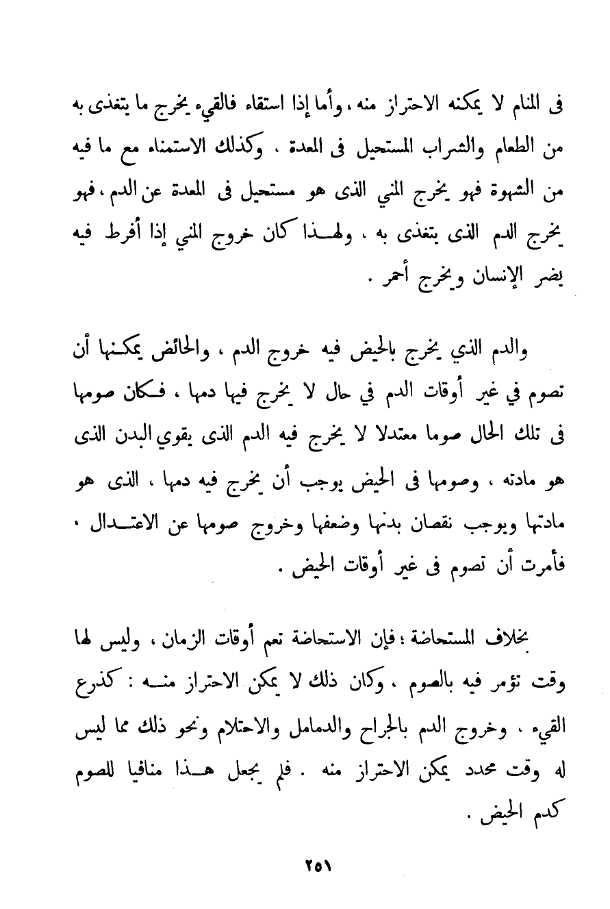 فِي الْمَنَامِ لَا يُمْكِنُهُ الِاحْتِرَازُ مِنْهُ وَأَمَّا إذَا استقاء فَالْقَيْءُ يُخْرِجُ مَا يَتَغَذَّى بِهِ مِنْ الطَّعَامِ وَالشَّرَابِ الْمُسْتَحِيلِ فِي الْمَعِدَةِ وَكَذَلِكَ الِاسْتِمْنَاءُ مَعَ مَا فِيهِ مِنْ الشَّهْوَةِ فَهُوَ يُخْرِجُ الْمَنِيَّ الَّذِي هُوَ مُسْتَحِيلٌ فِي الْمَعِدَةِ عَنْ الدَّمِ فَهُوَ يُخْرِجُ الدَّمَ الَّذِي يَتَغَذَّى بِهِ وَلِهَذَا كَانَ خُرُوجُ الْمَنِيِّ إذَا أَفْرَطَ فِيهِ يَضُرُّ الْإِنْسَانَ وَيَخْرُجُ أَحْمَرَ. وَالدَّمُ الَّذِي يَخْرُجُ بِالْحَيْضِ فِيهِ خُرُوجُ الدَّمِ وَالْحَائِضُ يُمْكِنُهَا أَنْ تَصُومَ فِي غَيْرِ أَوْقَاتِ الدَّمِ فِي حَالٍ لَا يَخْرُجُ فِيهَا دَمُهَا فَكَانَ صَوْمُهَا فِي تِلْكَ الْحَالِ صَوْمًا مُعْتَدِلًا لَا يَخْرُجُ فِيهِ الدَّمُ الَّذِي يُقَوِّي الْبَدَنَ الَّذِي هُوَ مَادَّتُهُ وَصَوْمُهَا فِي الْحَيْضِ يُوجِبُ أَنْ يَخْرُجَ فِيهِ دَمُهَا الَّذِي هُوَ مَادَّتُهَا وَيُوجِبُ نُقْصَانَ بَدَنِهَا وَضِعْفَهَا وَخُرُوجَ صَوْمِهَا عَنْ الِاعْتِدَالِ فَأُمِرَتْ أَنْ تَصُومَ فِي غَيْرِ أَوْقَاتِ الْحَيْضِ. بِخِلَافِ الْمُسْتَحَاضَةِ؛ فَإِنَّ الِاسْتِحَاضَةَ تَعُمُّ أَوْقَاتَ الزَّمَانِ وَلَيْسَ لَهَا وَقْتٌ تُؤْمَرُ فِيهِ بِالصَّوْمِ وَكَانَ ذَلِكَ لَا يُمْكِنُ الِاحْتِرَازُ مِنْهُ: كَذَرْعِ الْقَيْءِ وَخُرُوجِ الدَّمِ بِالْجِرَاحِ وَالدَّمَامِلِ وَالِاحْتِلَامِ وَنَحْوِ ذَلِكَ مِمَّا لَيْسَ لَهُ وَقْتٌ مُحَدَّدٌ يُمْكِنُ الِاحْتِرَازُ مِنْهُ. فَلَمْ يُجْعَلْ هَذَا مُنَافِيًا لِلصَّوْمِ كَدَمِ الْحَيْضِ.