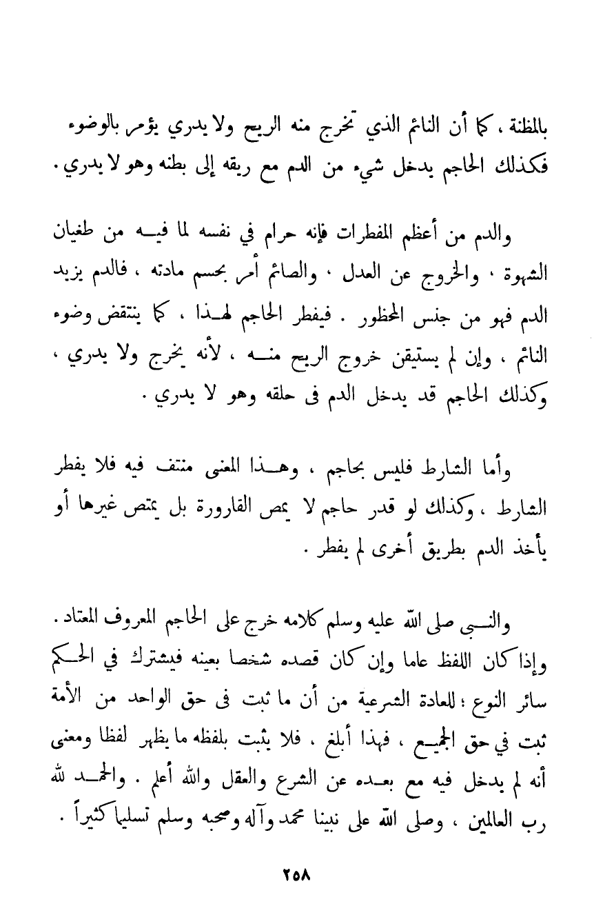 بِالْمَظِنَّةِ كَمَا أَنَّ النَّائِمَ الَّذِي تَخْرُجُ مِنْهُ الرِّيحُ وَلَا يَدْرِي يُؤْمَرُ بِالْوُضُوءِ فَكَذَلِكَ الْحَاجِمُ يَدْخُلُ شَيْءٌ مِنْ الدَّمِ مَعَ رِيقِهِ إلَى بَطْنِهِ وَهُوَ لَا يَدْرِي. وَالدَّمُ مِنْ أَعْظَمِ الْمُفْطِرَاتِ فَإِنَّهُ حَرَامٌ فِي نَفْسِهِ لِمَا فِيهِ مِنْ طُغْيَانِ الشَّهْوَةِ وَالْخُرُوجِ عَنْ الْعَدْلِ وَالصَّائِمُ أُمِرَ بِحَسْمِ مَادَّتِهِ فَالدَّمُ يَزِيدُ الدَّمَ فَهُوَ مِنْ جِنْسِ الْمَحْظُورِ. فَيُفْطِرُ الْحَاجِمُ لِهَذَا كَمَا يَنْتَقِضُ وُضُوءُ النَّائِمِ وَإِنْ لَمْ يَسْتَيْقِنْ خُرُوجَ الرِّيحِ مِنْهُ لِأَنَّهُ يَخْرُجُ وَلَا يَدْرِي وَكَذَلِكَ الْحَاجِمُ قَدْ يَدْخُلُ الدَّمُ فِي حَلْقِهِ وَهُوَ لَا يَدْرِي. وَأَمَّا الشَّارِطُ فَلَيْسَ بِحَاجِمِ وَهَذَا الْمَعْنَى مُنْتَفٍ فِيهِ فَلَا يُفْطِرُ الشَّارِطُ وَكَذَلِكَ لَوْ قُدِّرَ حَاجِمٌ لَا يَمُصُّ الْقَارُورَةَ بَلْ يَمْتَصُّ غَيْرَهَا أَوْ يَأْخُذُ الدَّمَ بِطَرِيقٍ أُخْرَى لَمْ يُفْطِرْ. وَالنَّبِيُّ صَلَّى اللَّهُ عَلَيْهِ وَسَلَّمَ كَلَامُهُ خَرَجَ عَلَى الْحَاجِمِ الْمَعْرُوفِ الْمُعْتَادِ. وَإِذَا كَانَ اللَّفْظُ عَامًّا وَإِنْ كَانَ قَصْدُهُ شَخْصًا بِعَيْنِهِ فَيَشْتَرِكُ فِي الْحُكْمِ سَائِرُ النَّوْعِ؛ لِلْعَادَةِ الشَّرْعِيَّةِ مِنْ أَنَّ مَا ثَبَتَ فِي حَقِّ الْوَاحِدِ مِنْ الْأُمَّةِ ثَبَتَ فِي حَقِّ الْجَمِيعِ فَهَذَا أَبْلَغُ فَلَا يَثْبُتُ بِلَفْظِهِ مَا يَظْهَرُ لَفْظًا وَمَعْنًى أَنَّهُ لَمْ يَدْخُلْ فِيهِ مَعَ بُعْدِهِ عَنْ الشَّرْعِ وَالْعَقْلِ وَاَللَّهُ أَعْلَمُ. وَالْحَمْدُ لِلَّهِ رَبِّ الْعَالَمِينَ وَصَلَّى اللَّهُ عَلَى نَبِيِّنَا مُحَمَّدٍ وَآلِهِ وَصَحْبِهِ وَسَلَّمَ تَسْلِيمًا كَثِيرًا.