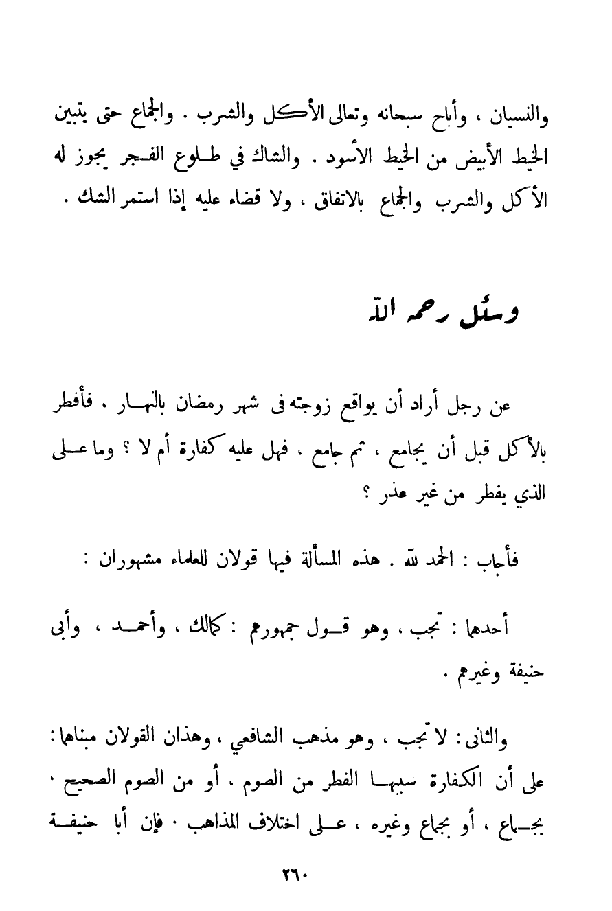 وَالنِّسْيَانِ وَأَبَاحَ سُبْحَانَهُ وَتَعَالَى الْأَكْلَ وَالشُّرْبَ. وَالْجِمَاعَ حَتَّى يَتَبَيَّنَ الْخَيْطُ الْأَبْيَضُ مِنْ الْخَيْطِ الْأَسْوَدِ. وَالشَّاكُّ فِي طُلُوعِ الْفَجْرِ يَجُوزُ لَهُ الْأَكْلُ وَالشُّرْبُ وَالْجِمَاعُ بِالِاتِّفَاقِ وَلَا قَضَاءَ عَلَيْهِ إذَا اسْتَمَرَّ الشَّكُّ.