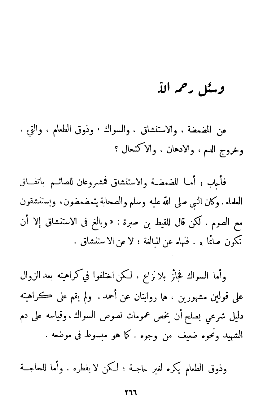 عَنْ الْمَضْمَضَةِ وَالِاسْتِنْشَاقِ وَالسِّوَاكِ وَذَوْقِ الطَّعَامِ وَالْقَيْءِ وَخُرُوجِ الدَّمِ وَالِادِّهَانِ وَالِاكْتِحَالِ؟