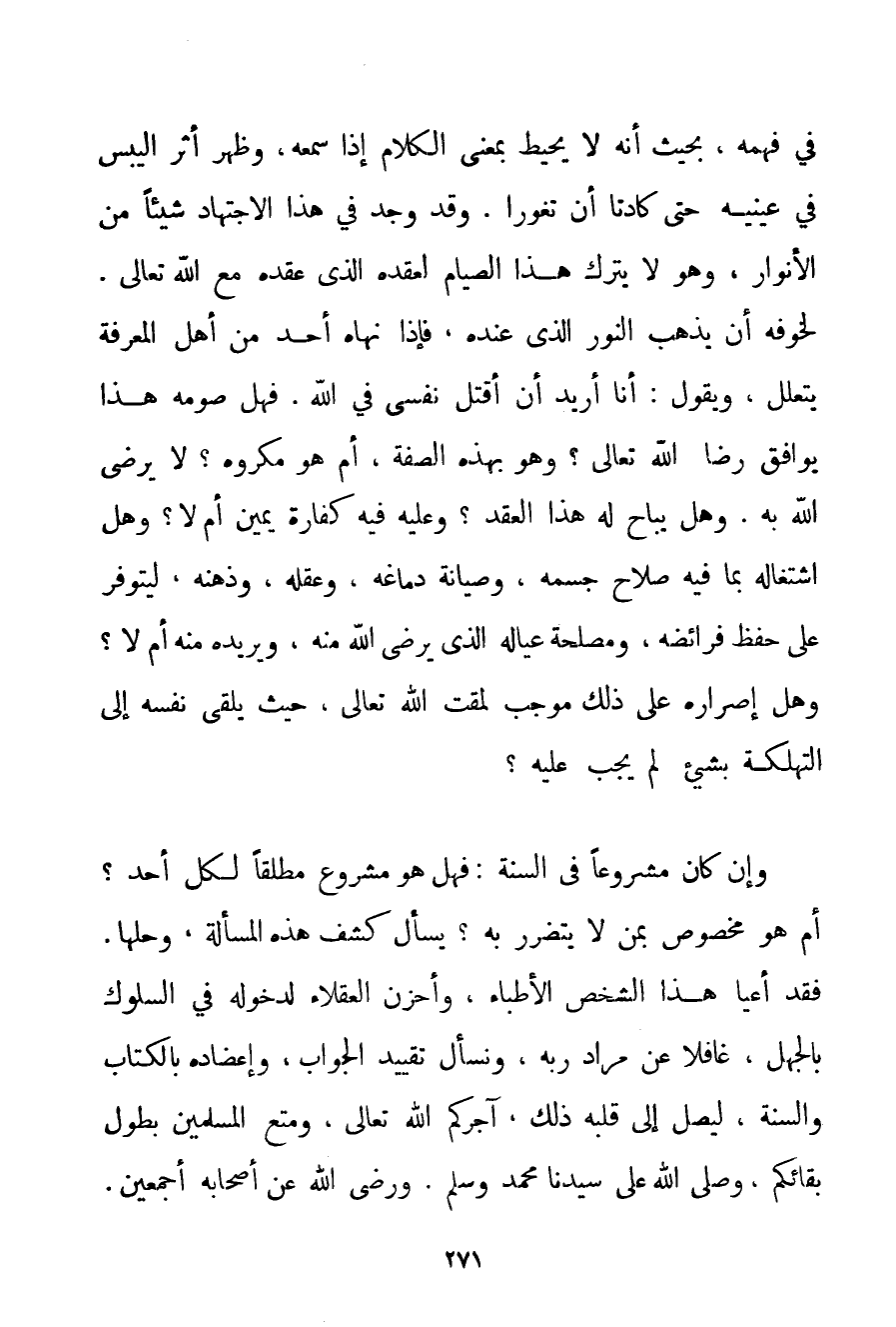 فِي فَهْمِهِ بِحَيْثُ أَنَّهُ لَا يُحِيطُ بِمَعْنَى الْكَلَامِ إذَا سَمِعَهُ وَظَهَرَ أَثَرُ الْيُبْسِ فِي عَيْنَيْهِ حَتَّى كَادَتَا أَنْ تَغُورَا. وَقَدْ وَجَدَ فِي هَذَا الِاجْتِهَادِ شَيْئًا مِنْ الْأَنْوَارِ وَهُوَ لَا يَتْرُكُ هَذَا الصِّيَامَ لِعَقْدِهِ الَّذِي عَقَدَهُ مَعَ اللَّهِ تَعَالَى لِخَوْفِهِ أَنْ يَذْهَبَ النُّورُ الَّذِي عِنْدَهُ فَإِذَا نَهَاهُ أَحَدٌ مِنْ أَهْلِ الْمَعْرِفَةِ يَتَعَلَّلُ وَيَقُولُ: أَنَا أُرِيدُ أَنْ أَقْتُلَ نَفْسِي فِي اللَّهِ. فَهَلْ صَوْمُهُ هَذَا يُوَافِقُ رِضَا اللَّهِ تَعَالَى؟ وَهُوَ بِهَذِهِ الصِّفَةِ أَمْ هُوَ مَكْرُوهٌ؟ لَا يُرْضِي اللَّهَ بِهِ. وَهَلْ يُبَاحُ لَهُ هَذَا الْعَقْدُ؟ وَعَلَيْهِ فِيهِ كَفَّارَةُ يَمِينٍ أَمْ لَا؟ وَهَلْ اشْتِغَالُهُ بِمَا فِيهِ صَلَاحُ جِسْمِهِ وَصِيَانَةُ دِمَاغِهِ وَعَقْلِهِ وَذِهْنِهِ لِيَتَوَفَّرَ عَلَى حِفْظِ فَرَائِضِهِ وَمَصْلَحَةِ عِيَالِهِ الَّذِي يَرْضَى اللَّهُ مِنْهُ وَيُرِيدُهُ مِنْهُ أَمْ لَا؟ وَهَلْ إصْرَارُهُ عَلَى ذَلِكَ مُوجِبٌ لِمَقْتِ اللَّهِ تَعَالَى حَيْثُ يُلْقِي نَفْسَهُ إلَى التَّهْلُكَةِ بِشَيْءٍ لَمْ يَجِبْ عَلَيْهِ؟ وَإِنْ كَانَ مَشْرُوعًا فِي السُّنَّةِ: فَهَلْ هُوَ مَشْرُوعٌ مُطْلَقًا لِكُلِّ أَحَدٍ؟ أَمْ هُوَ مَخْصُوصٌ بِمَنْ لَا يَتَضَرَّرُ بِهِ؟ يَسْأَلُ كَشْفَ هَذِهِ الْمَسْأَلَةِ وَحَلَّهَا. فَقَدْ أَعْيَا هَذَا الشَّخْصُ الْأَطِبَّاءَ وَأَحْزَنَ الْعُقَلَاءَ لِدُخُولِهِ فِي السُّلُوكِ بِالْجَهْلِ غَافِلًا عَنْ مُرَادِ رَبِّهِ وَنَسْأَلُ تَقْيِيدَ الْجَوَابِ وإعضاده بِالْكِتَابِ وَالسُّنَّةِ لِيَصِلَ إلَى قَلْبِهِ ذَلِكَ آجَرَكُمْ اللَّهُ تَعَالَى وَمَتَّعَ الْمُسْلِمِينَ بِطُولِ بقاكم وَصَلَّى اللَّهُ عَلَى سَيِّدِنَا مُحَمَّدٍ وَسَلَّمَ. وَرَضِيَ اللَّهُ عَنْ أَصْحَابِهِ أَجْمَعِينَ.