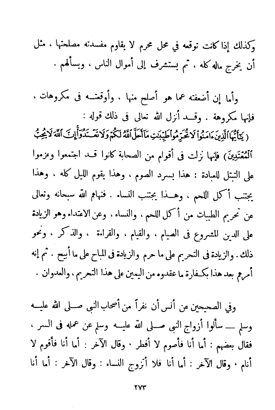 وَكَذَلِكَ إذَا كَانَتْ تُوقِعُهُ فِي مَحَلٍّ مُحَرَّمٍ لَا يُقَاوِمُ مَفْسَدَتَهُ مُصْلِحَتُهَا مِثْلُ أَنْ يُخْرِجَ مَالَهُ كُلَّهُ ثُمَّ يَسْتَشْرِفُ إلَى أَمْوَالِ النَّاسِ وَيَسْأَلُهُمْ. وَأَمَّا إنْ أَضْعَفَتْهُ عَمَّا هُوَ أَصْلَحُ مِنْهَا وَأَوْقَعَتْهُ فِي مَكْرُوهَاتٍ فَإِنَّهَا مَكْرُوهَةٌ. وَقَدْ أَنْزَلَ اللَّهُ تَعَالَى فِي ذَلِكَ قَوْلَهُ: {يَا أَيُّهَا الَّذِينَ آمَنُوا لَا تُحَرِّمُوا طَيِّبَاتِ مَا أَحَلَّ اللَّهُ لَكُمْ وَلَا تَعْتَدُوا إنَّ اللَّهَ لَا يُحِبُّ الْمُعْتَدِينَ} فَإِنَّهَا نَزَلَتْ فِي أَقْوَامٍ مِنْ الصَّحَابَةِ كَانُوا قَدْ اجْتَمَعُوا وَعَزَمُوا عَلَى التَّبَتُّلِ لِلْعِبَادَةِ: هَذَا يَسْرُدُ الصَّوْمَ وَهَذَا يَقُومُ اللَّيْلَ كُلَّهُ وَهَذَا يَجْتَنِبُ أَكْلَ اللَّحْمِ وَهَذَا يَجْتَنِبُ النِّسَاءَ. فَنَهَاهُمْ اللَّهُ سُبْحَانَهُ وَتَعَالَى عَنْ تَحْرِيمِ الطَّيِّبَاتِ مَنْ أَكْلِ اللَّحْمِ وَالنِّسَاءِ وَعَنْ الِاعْتِدَاءِ وَهُوَ الزِّيَادَةُ عَلَى الدِّينِ الْمَشْرُوعِ فِي الصِّيَامِ وَالْقِيَامِ وَالْقِرَاءَةِ وَالذِّكْرِ وَنَحْوِ ذَلِكَ. وَالزِّيَادَةُ فِي التَّحْرِيمِ عَلَى مَا حُرِّمَ وَالزِّيَادَةُ فِي الْمُبَاحِ عَلَى مَا أُبِيحُ. ثُمَّ إنَّهُ أَمَرَهُمْ بَعْدَ هَذَا بِكَفَّارَةِ مَا عَقَدُوهُ مِنْ الْيَمِينِ عَلَى هَذَا التَّحْرِيمِ وَالْعُدْوَانِ. وَفِي الصَّحِيحَيْنِ عَنْ أَنَسٍ {أَنَّ نَفَرًا مِنْ أَصْحَابِ النَّبِيِّ صَلَّى اللَّهُ عَلَيْهِ وَسَلَّمَ - سَأَلُوا أَزْوَاجَ النَّبِيِّ صَلَّى اللَّهُ عَلَيْهِ وَسَلَّمَ عَنْ عَمَلِهِ فِي السِّرِّ فَقَالَ بَعْضُهُمْ: أَمَّا أَنَا فَأَصُومُ لَا أُفْطِرُ وَقَالَ الْآخَرُ: أَمَّا أَنَا فَأَقْوَمُ لَا أَنَامُ وَقَالَ الْآخَرُ: أَمَّا أَنَا فَلَا أَتَزَوَّجُ النِّسَاءَ: وَقَالَ الْآخَرُ: أَمَّا أَنَا