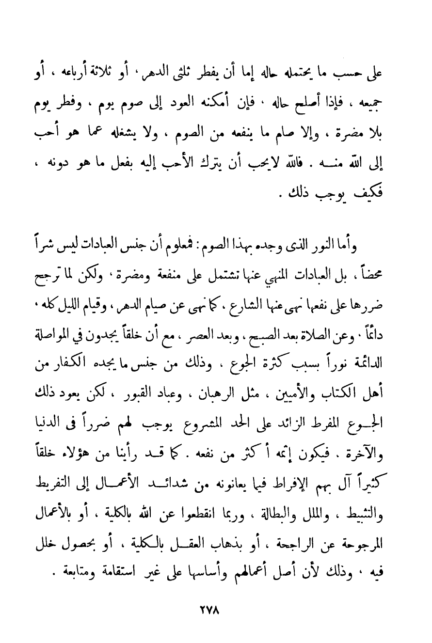 عَلَى حَسَبِ مَا يَحْتَمِلُهُ حَالُهُ إمَّا أَنْ يُفْطِرَ ثُلْثَيْ الدَّهْرِ أَوْ ثَلَاثَةَ أَرْبَاعِهِ أَوْ جَمِيعَهُ فَإِذَا أَصْلَحَ حَالَهُ فَإِنْ أَمْكَنَهُ الْعَوْدُ إلَى صَوْمِ يَوْمٍ وَفِطْرِ يَوْمٍ بِلَا مَضَرَّةٍ وَإِلَّا صَامَ مَا يَنْفَعُهُ مِنْ الصَّوْمِ وَلَا يَشْغَلُهُ عَمَّا هُوَ أَحَبُّ إلَى اللَّهِ مِنْهُ. فَاَللَّهُ لَا يُحِبُّ أَنْ يُتْرَكَ الْأَحَبُّ إلَيْهِ بِفِعْلِ مَا هُوَ دُونَهُ فَكَيْفَ يُوجِبُ ذَلِكَ. وَأَمَّا النُّورُ الَّذِي وَجَدَهُ بِهَذَا الصَّوْمِ: فَمَعْلُومٌ أَنَّ جِنْسَ الْعِبَادَاتِ لَيْسَ شَرًّا مَحْضًا بَلْ الْعِبَادَاتُ الْمَنْهِيُّ عَنْهَا تَشْتَمِلُ عَلَى مَنْفَعَةٍ وَمَضَرَّةٍ وَلَكِنْ لَمَّا تَرَجَّحَ ضَرَرُهَا عَلَى نَفْعِهَا نَهَى عَنْهَا الشَّارِعُ كَمَا نَهَى عَنْ صِيَامِ الدَّهْرِ وَقِيَامِ اللَّيْلِ كُلِّهِ دَائِمًا وَعَنْ الصَّلَاةِ بَعْدَ الصُّبْحِ وَبَعْدَ الْعَصْرِ مَعَ أَنَّ خَلْقًا يَجِدُونَ فِي الْمُوَاصَلَةِ الدَّائِمَةِ نُورًا بِسَبَبِ كَثْرَةِ الْجُوعِ وَذَلِكَ مِنْ جِنْسِ مَا يَجِدُهُ الْكُفَّارُ مِنْ أَهْلِ الْكِتَابِ وَالْأُمِّيِّينَ. مِثْلُ الرُّهْبَانِ وَعُبَّادِ الْقُبُورِ لَكِنْ يَعُودُ ذَلِكَ الْجُوعُ الْمُفْرِطُ الزَّائِدُ عَلَى الْحَدِّ الْمَشْرُوعِ يُوجِبُ لَهُمْ ضَرَرًا فِي الدُّنْيَا وَالْآخِرَةِ فَيَكُونُ إثْمُهُ أَكْثَرَ مِنْ نَفْعِهِ. كَمَا قَدْ رَأَيْنَا مِنْ هَؤُلَاءِ خَلْقًا كَثِيرًا آلَ بِهِمْ الْإِفْرَاطُ فِيمَا يُعَانُونَهُ. مِنْ شَدَائِدِ الْأَعْمَالِ إلَى التَّفْرِيطِ وَالتَّثْبِيطِ وَالْمَلَلِ وَالْبَطَالَةِ وَرُبَّمَا انْقَطَعُوا عَنْ اللَّهِ بِالْكُلِّيَّةِ أَوْ بِالْأَعْمَالِ الْمَرْجُوحَةِ عَنْ الرَّاجِحَةِ أَوْ بِذَهَابِ الْعَقْلِ بِالْكُلِّيَّةِ أَوْ بِحُصُولِ خَلَلٍ فِيهِ وَذَلِكَ لِأَنَّ أَصْلَ أَعْمَالِهِمْ وَأَسَاسَهَا عَلَى غَيْرِ اسْتِقَامَةٍ وَمُتَابَعَةٍ.